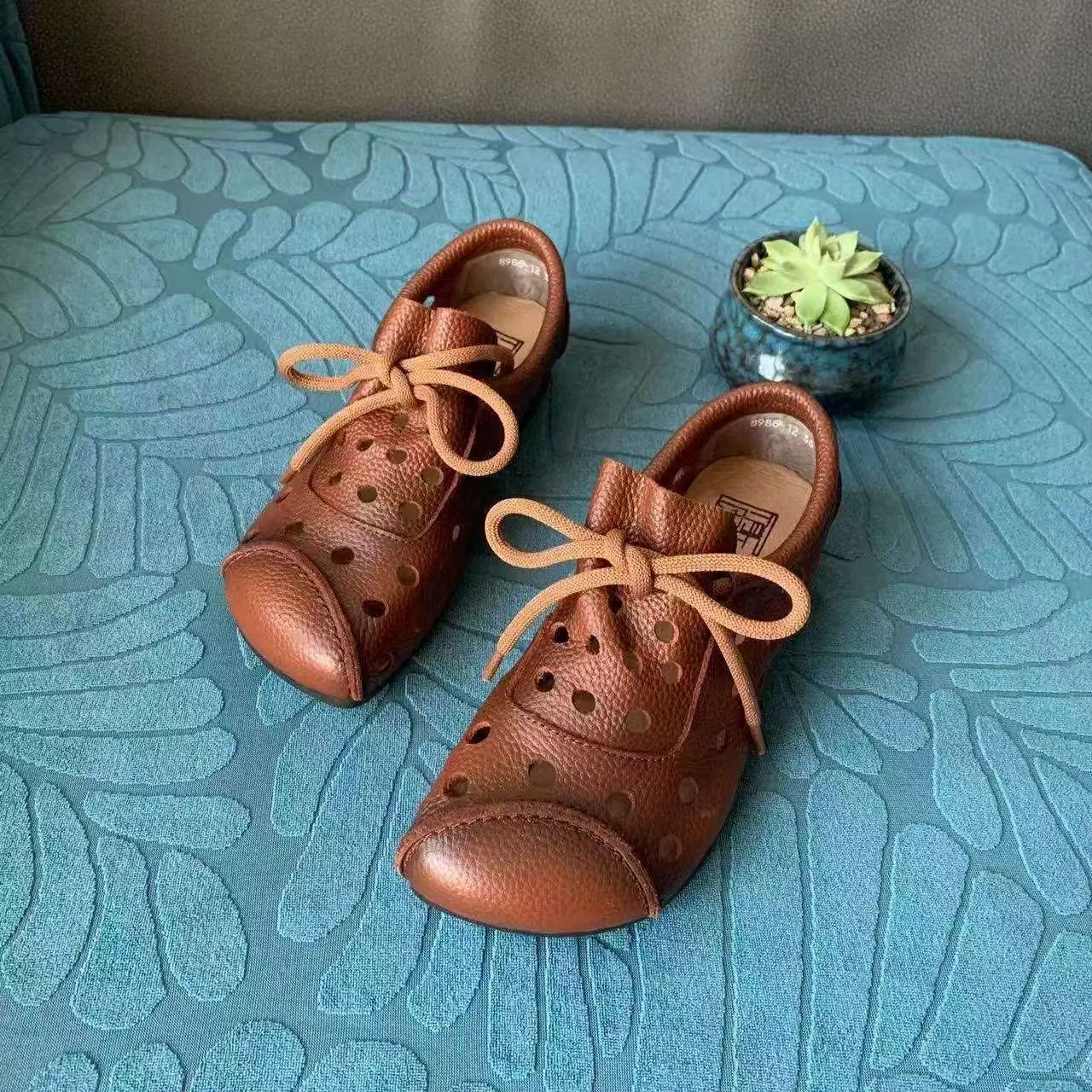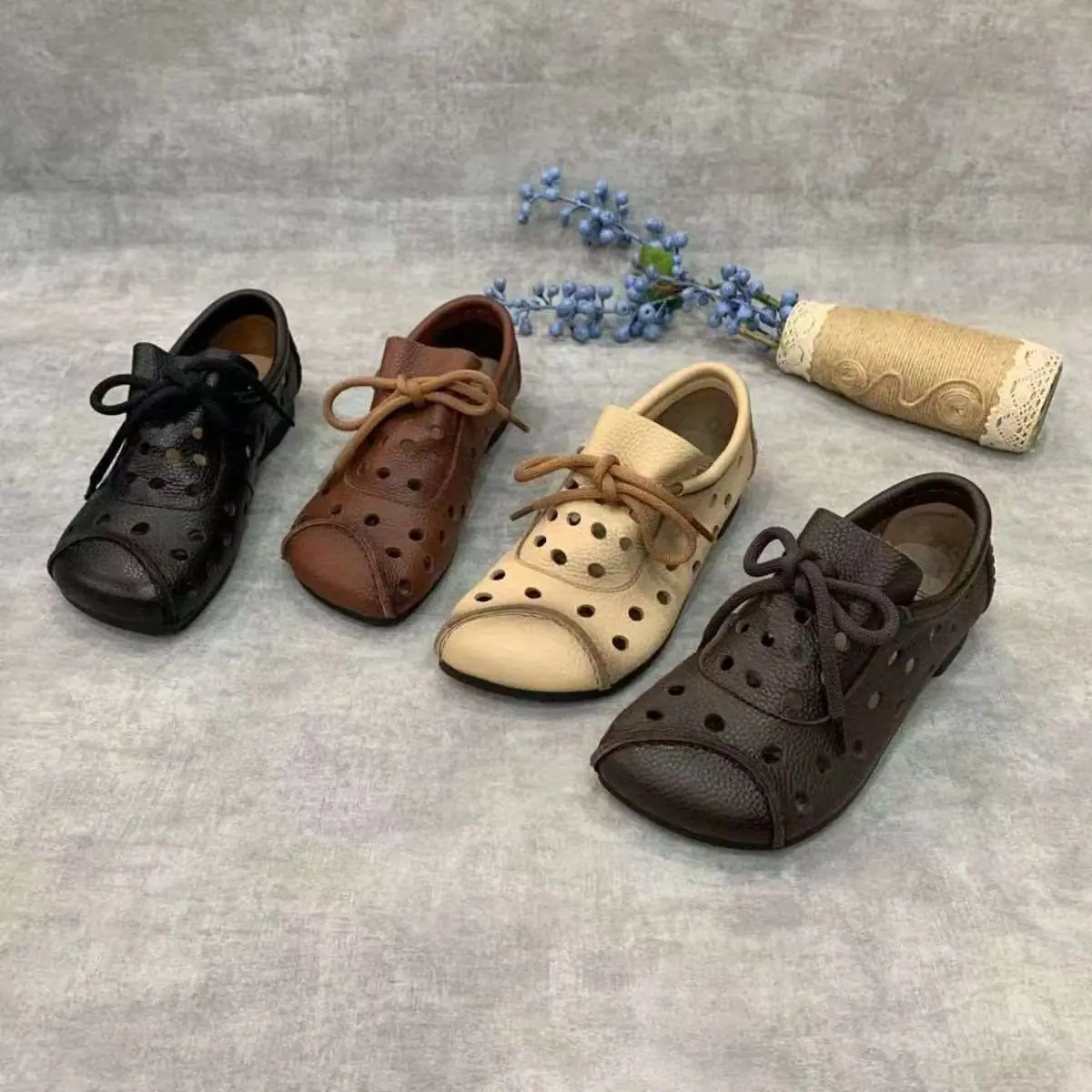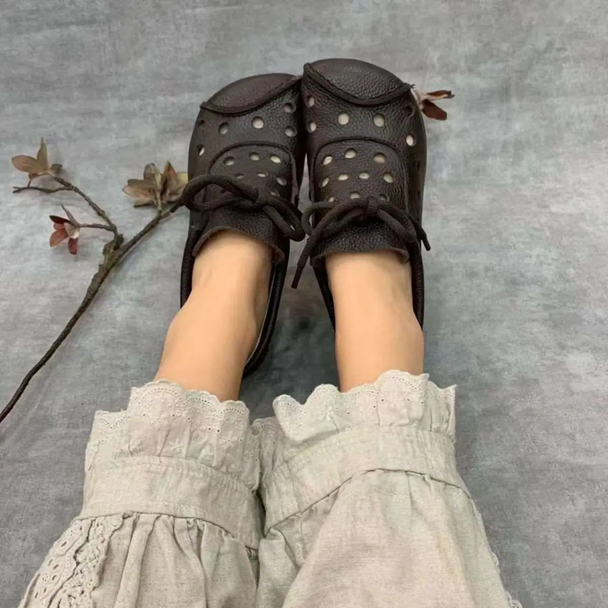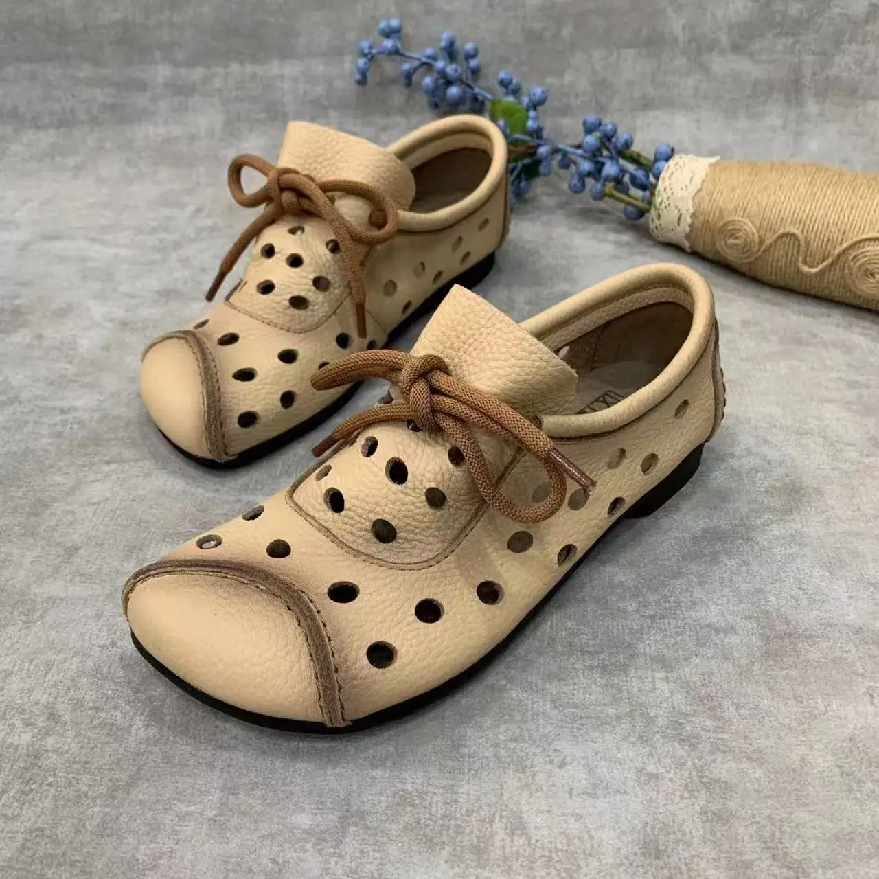 Zapatos individuales de otoño 2025 retro de punta redonda para mujer, verano nuevo, para mediana edad y ancianas, cómodos, de suela suave, zapatos de madre con agujero hueco