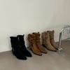 Botas de Gamuza Estilizadoras con Tacón Alto y Punta Fina para Mujer 2025 Otoño e Invierno Botas de Media Caña Estilo Vaquero Occidental Botas Cortas de Pila