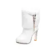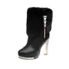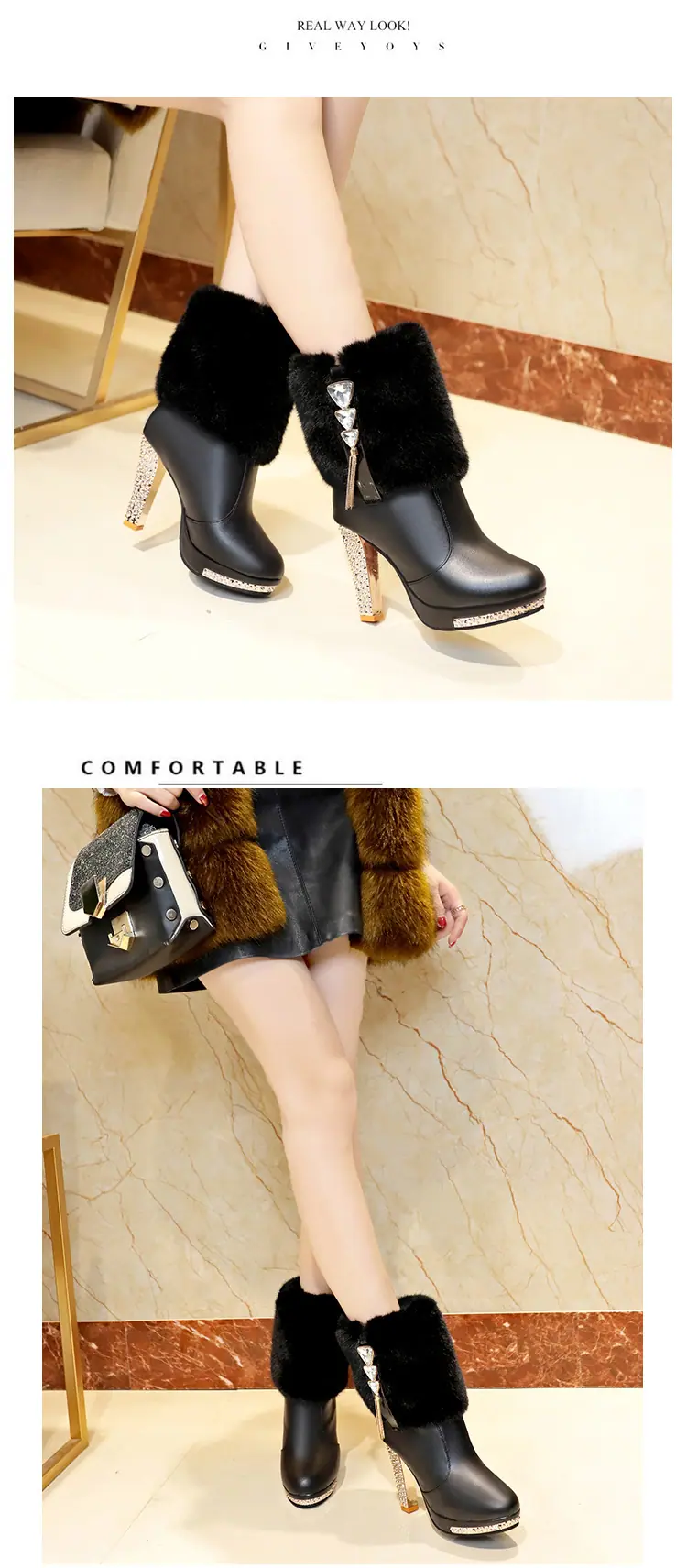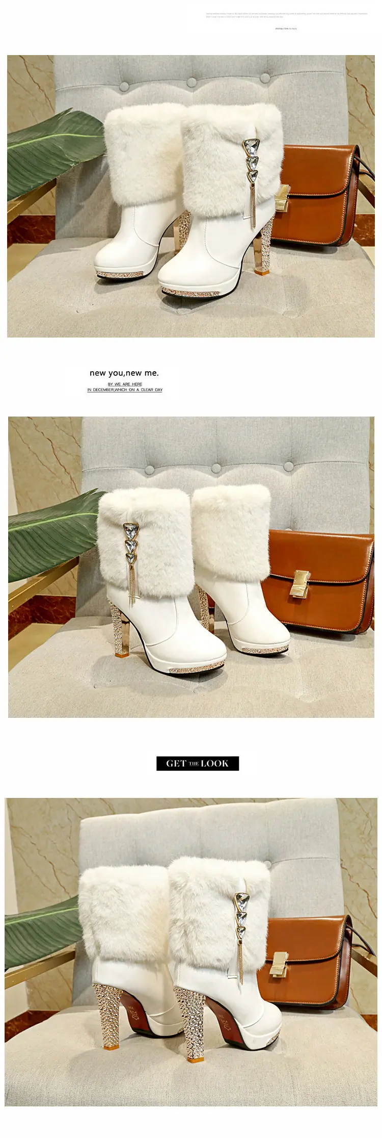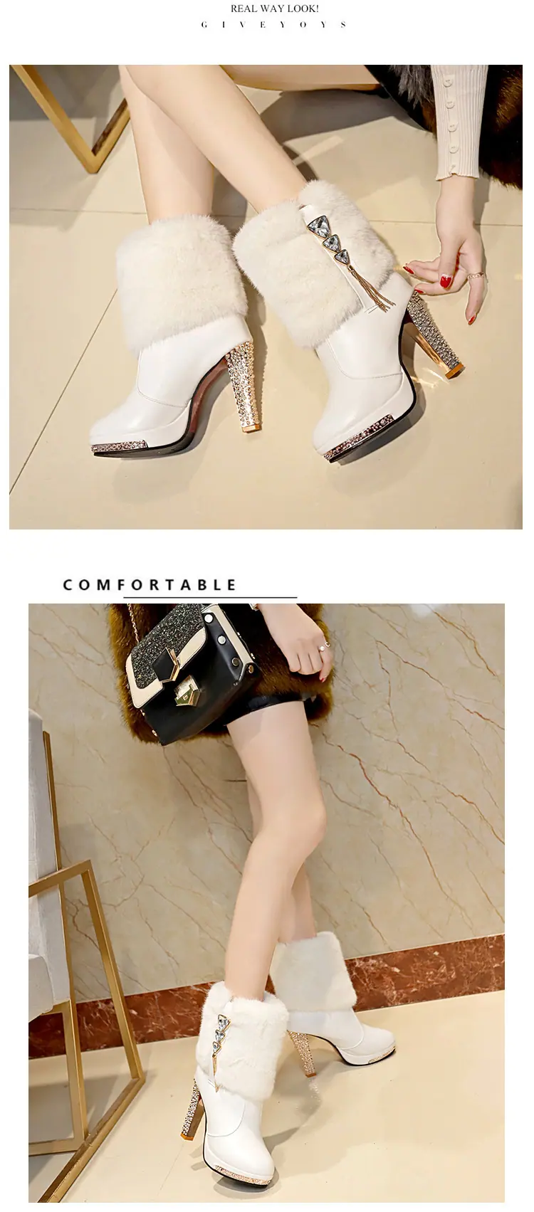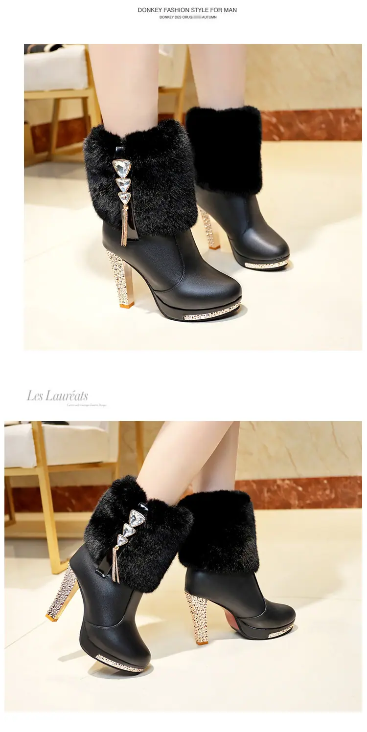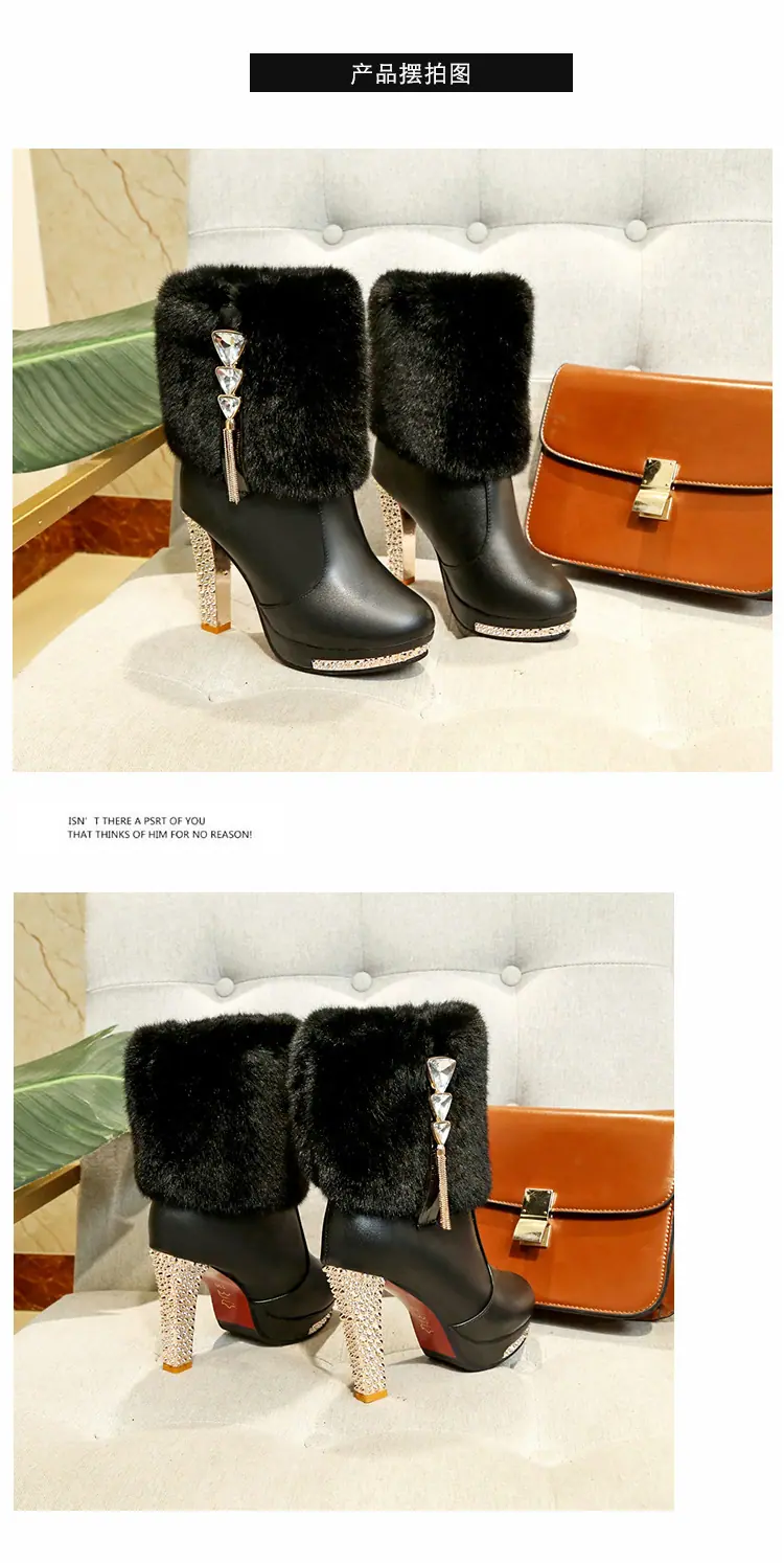 Botas de Moda de Tacón Alto Cálidas de Invierno Europeas y Americanas de Talla Grande Transfronterizas de Tacón Grueso Decoración de Pedrería Botines Peludos de Tobillo para Mujer Venta al Mayoreo
