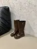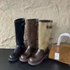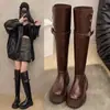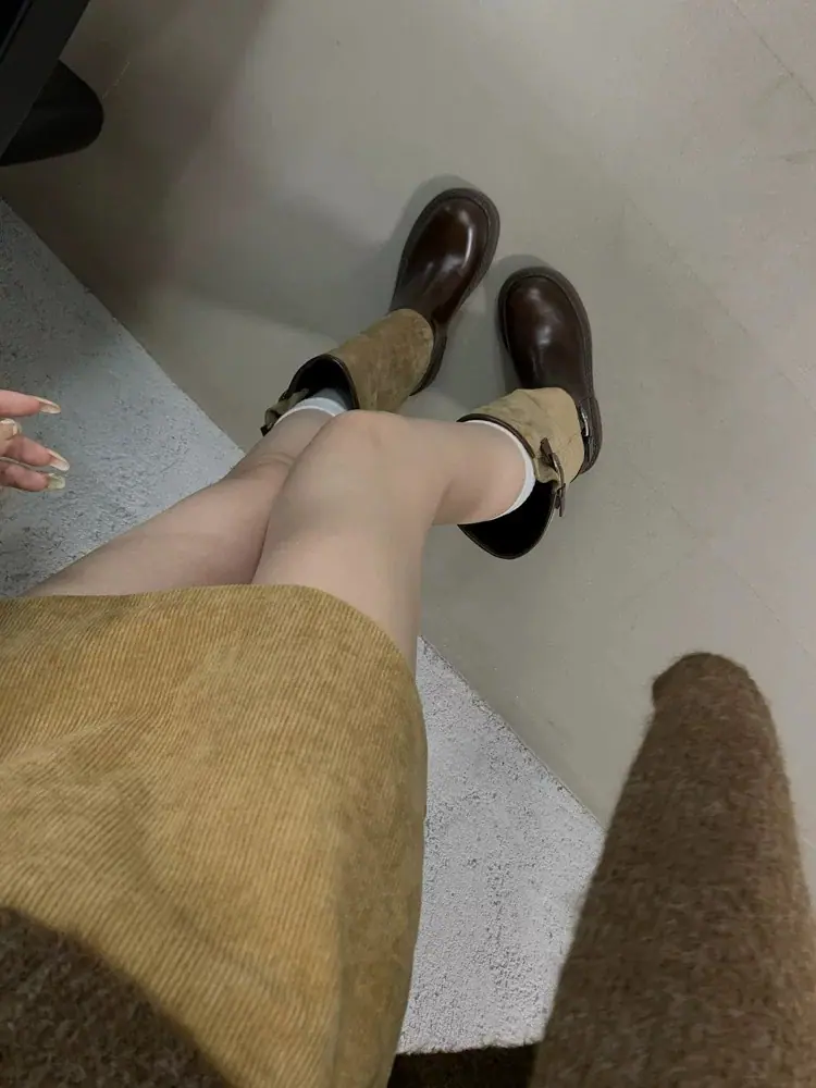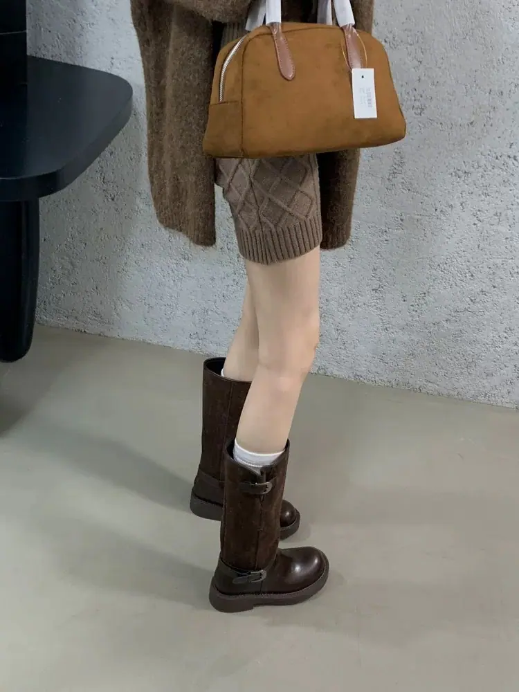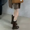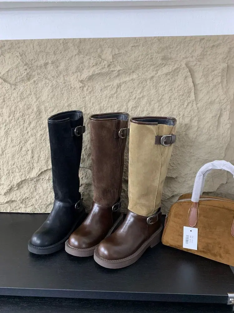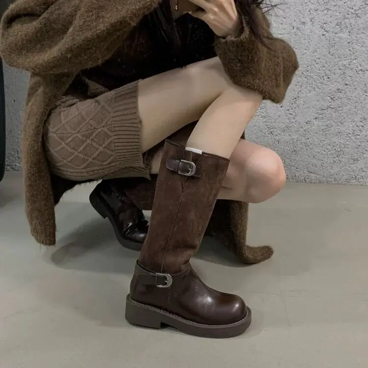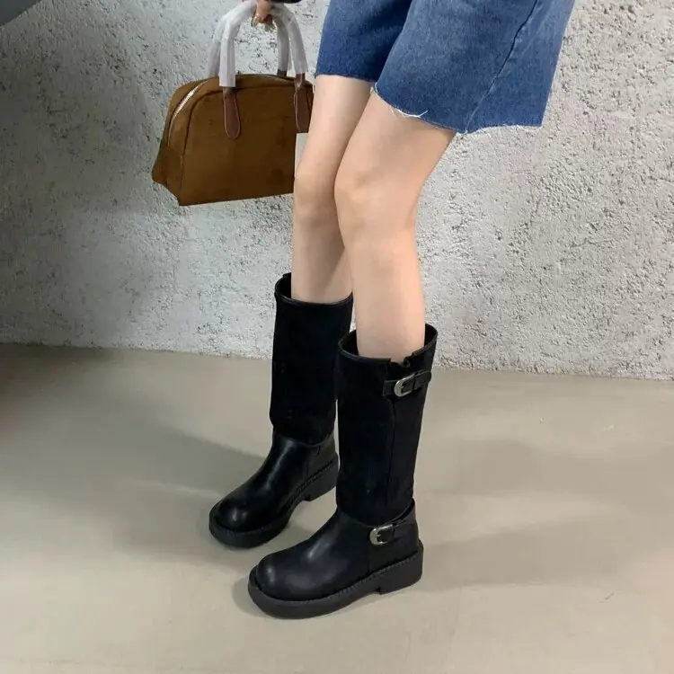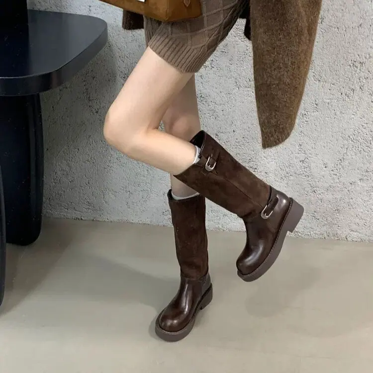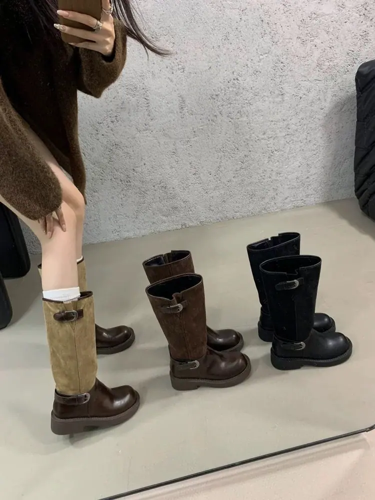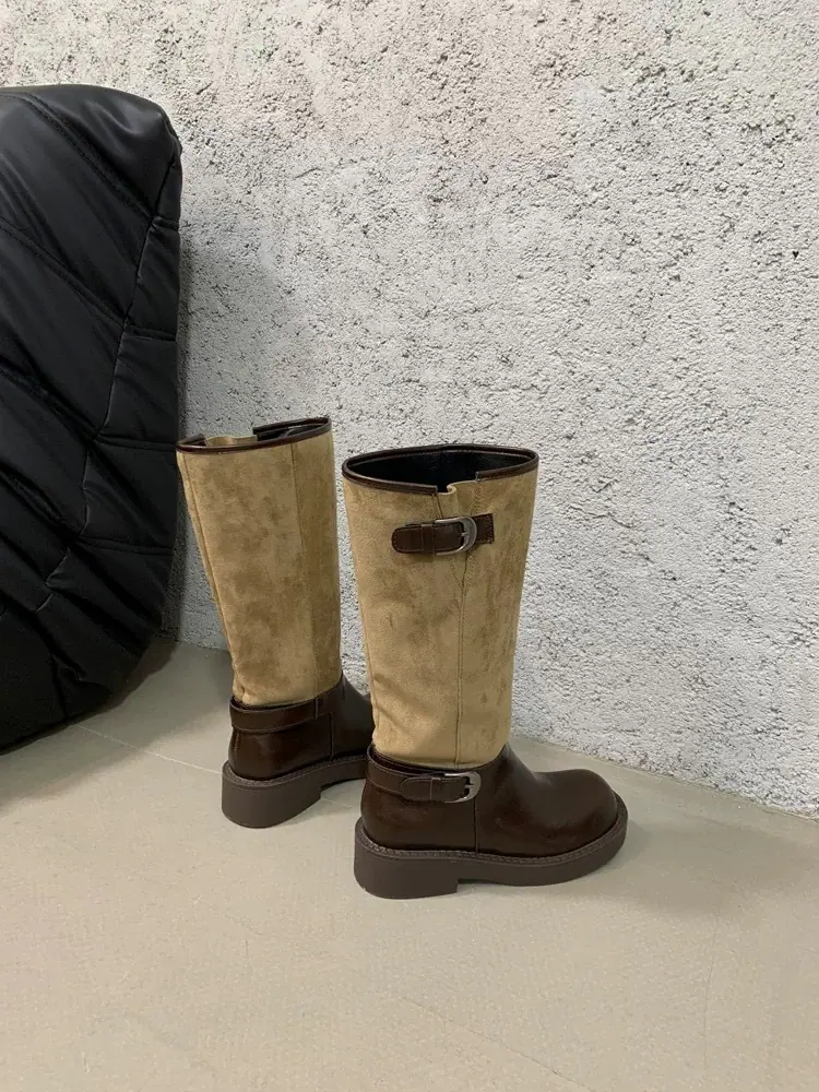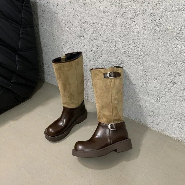 Botas de caballero de ante empalmado de suela gruesa para mujer 2025 otoño e invierno nuevo estilo británico botas Martin tacón grueso botas largas por encima de la rodilla