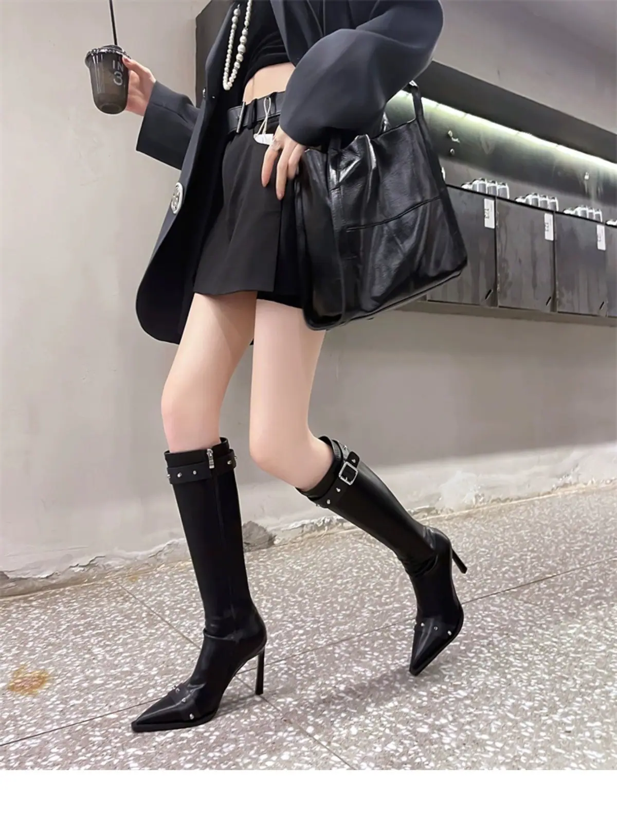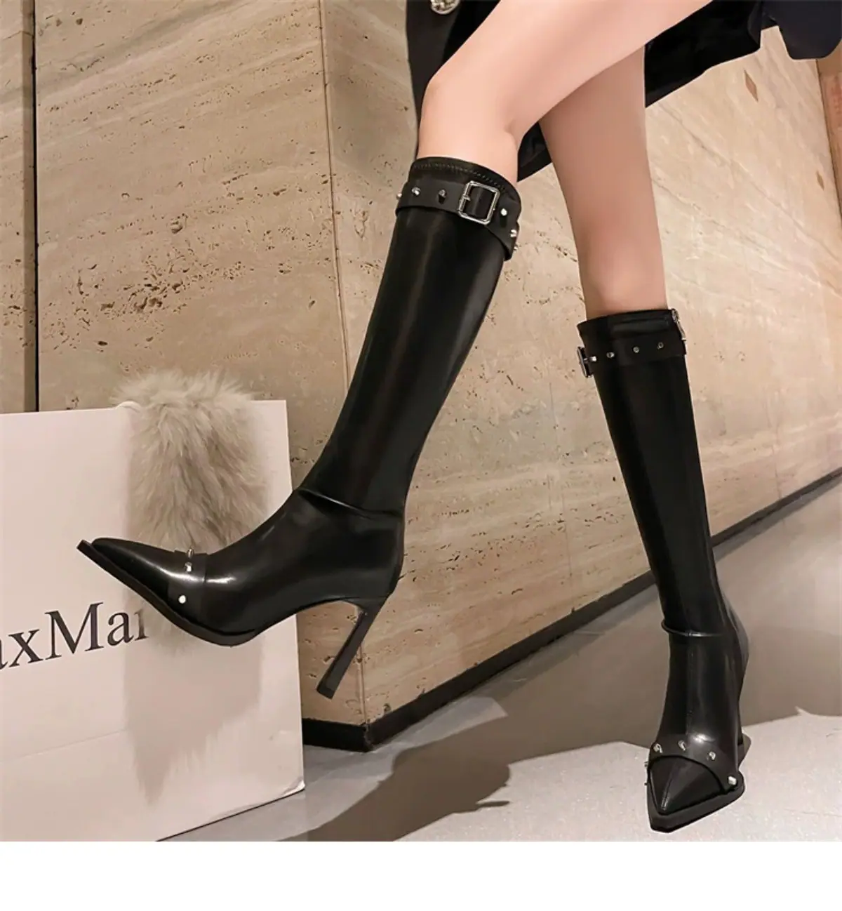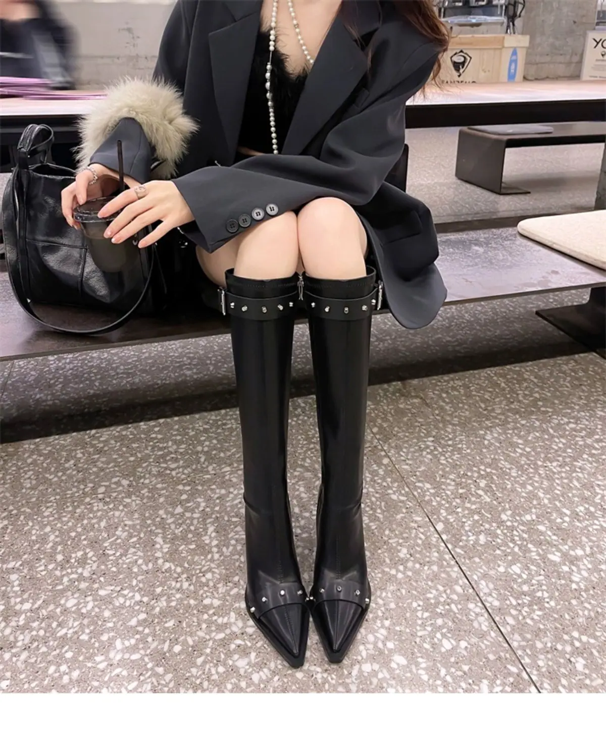 Botas Arriba de la Rodilla con Remaches Mujer Tacón de Aguja 2025 Nuevo Otoño Invierno Temperamento Francés Punta Afilada Botas Altas Negras Tacón Alto Botas Adelgazantes