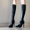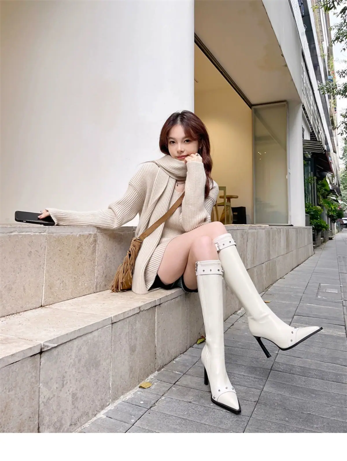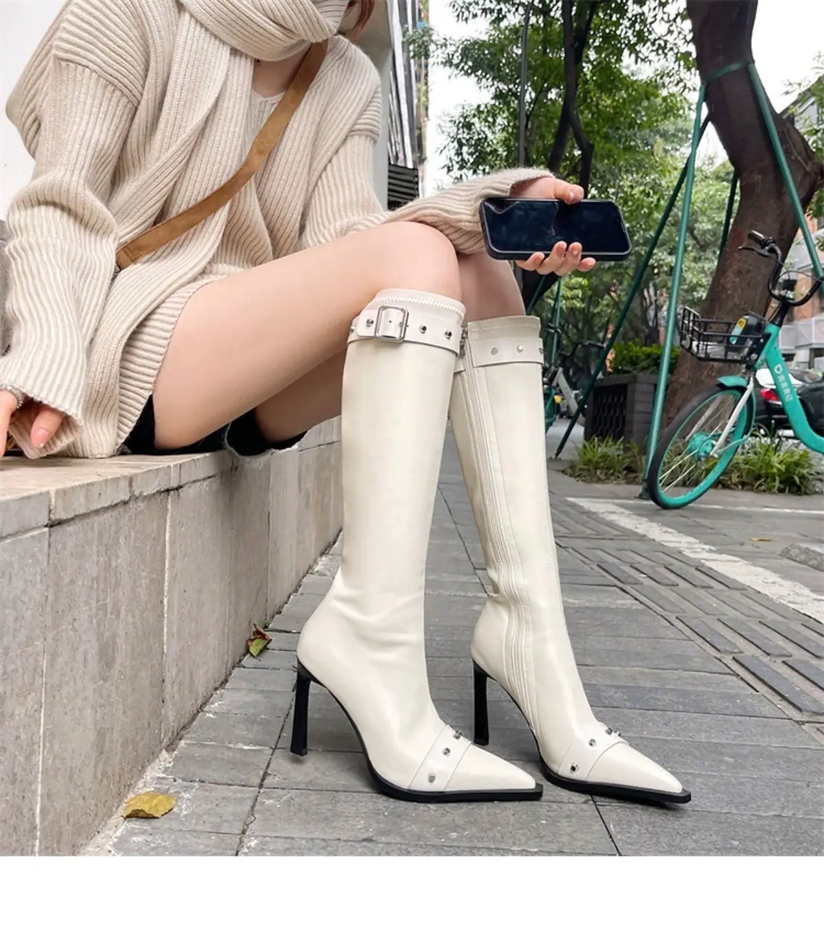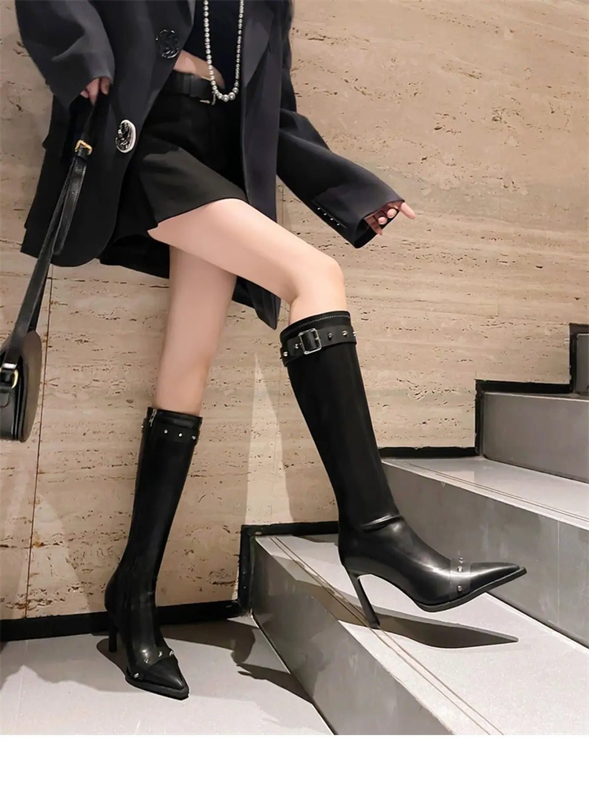 Botas Arriba de la Rodilla con Remaches Mujer Tacón de Aguja 2025 Nuevo Otoño Invierno Temperamento Francés Punta Afilada Botas Altas Negras Tacón Alto Botas Adelgazantes