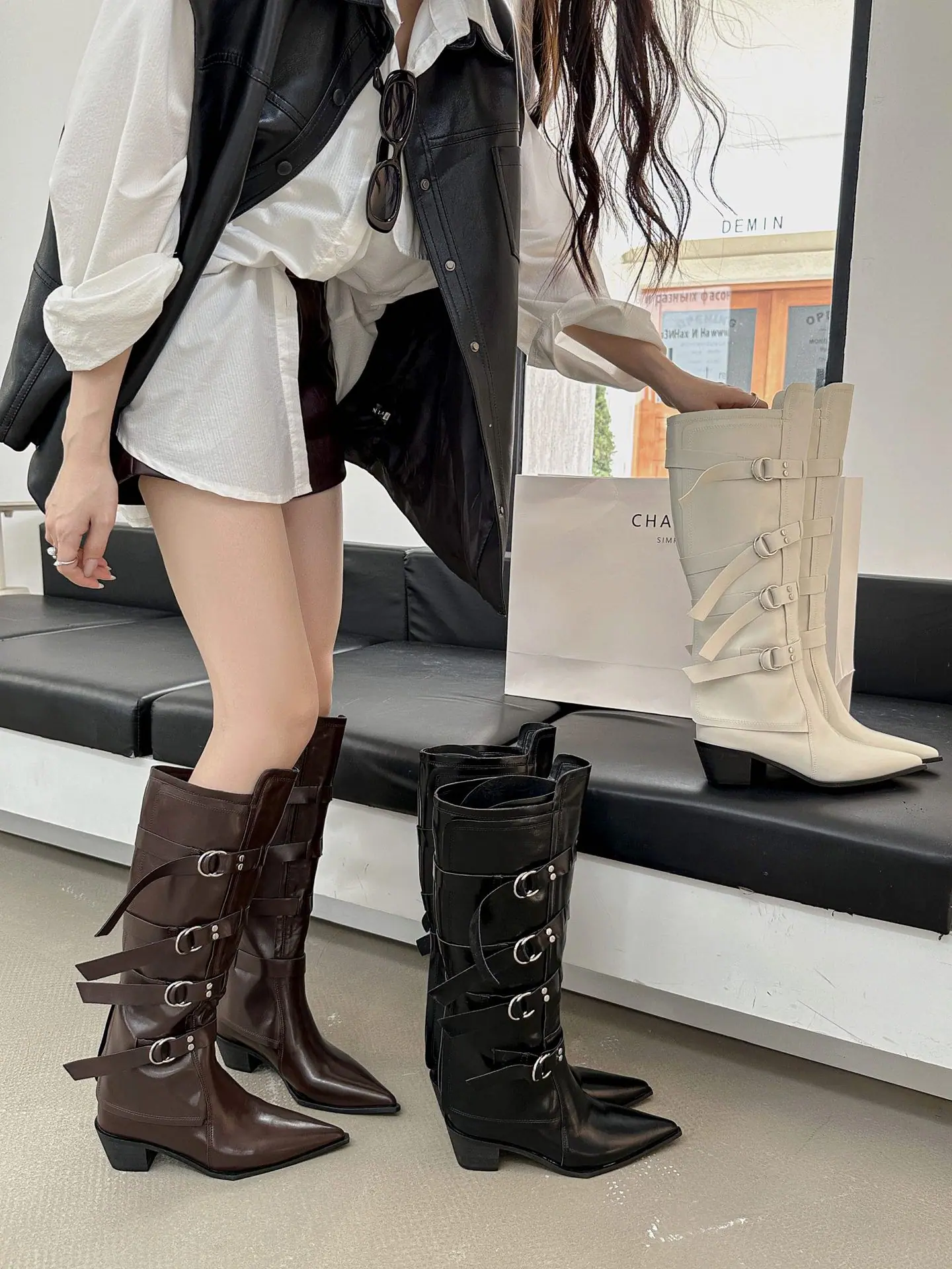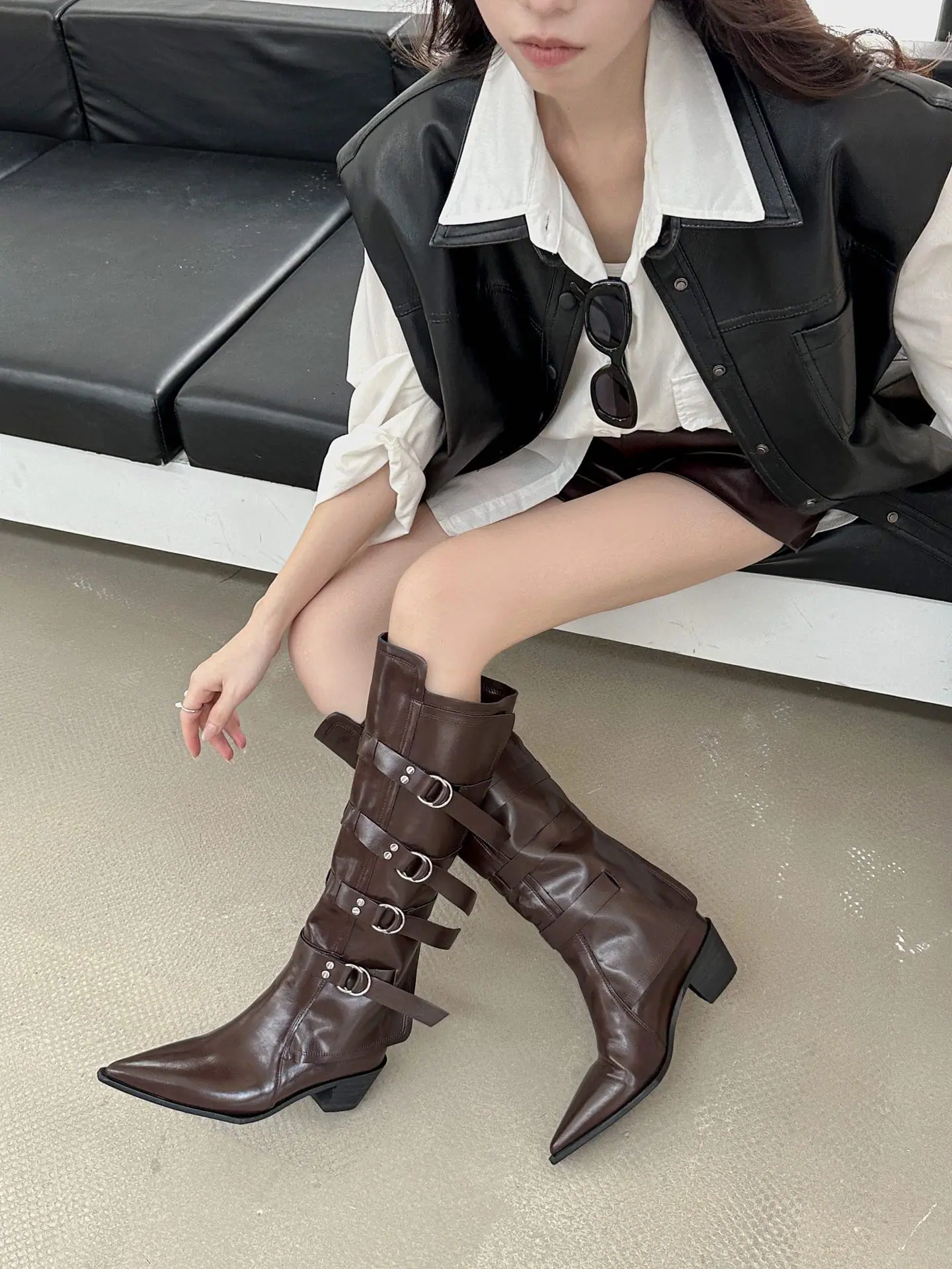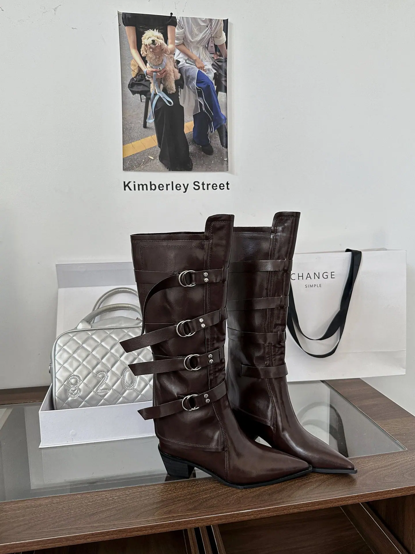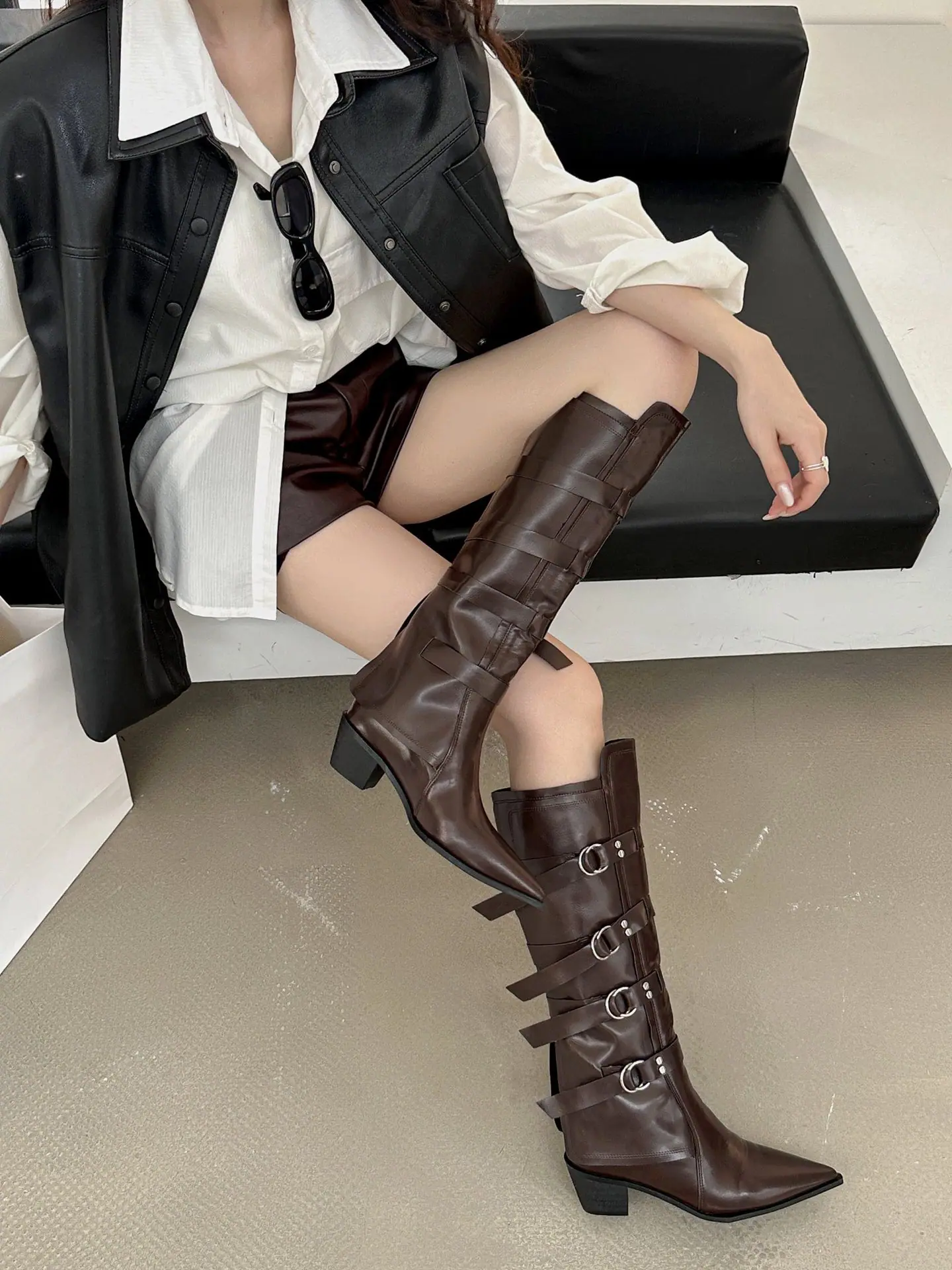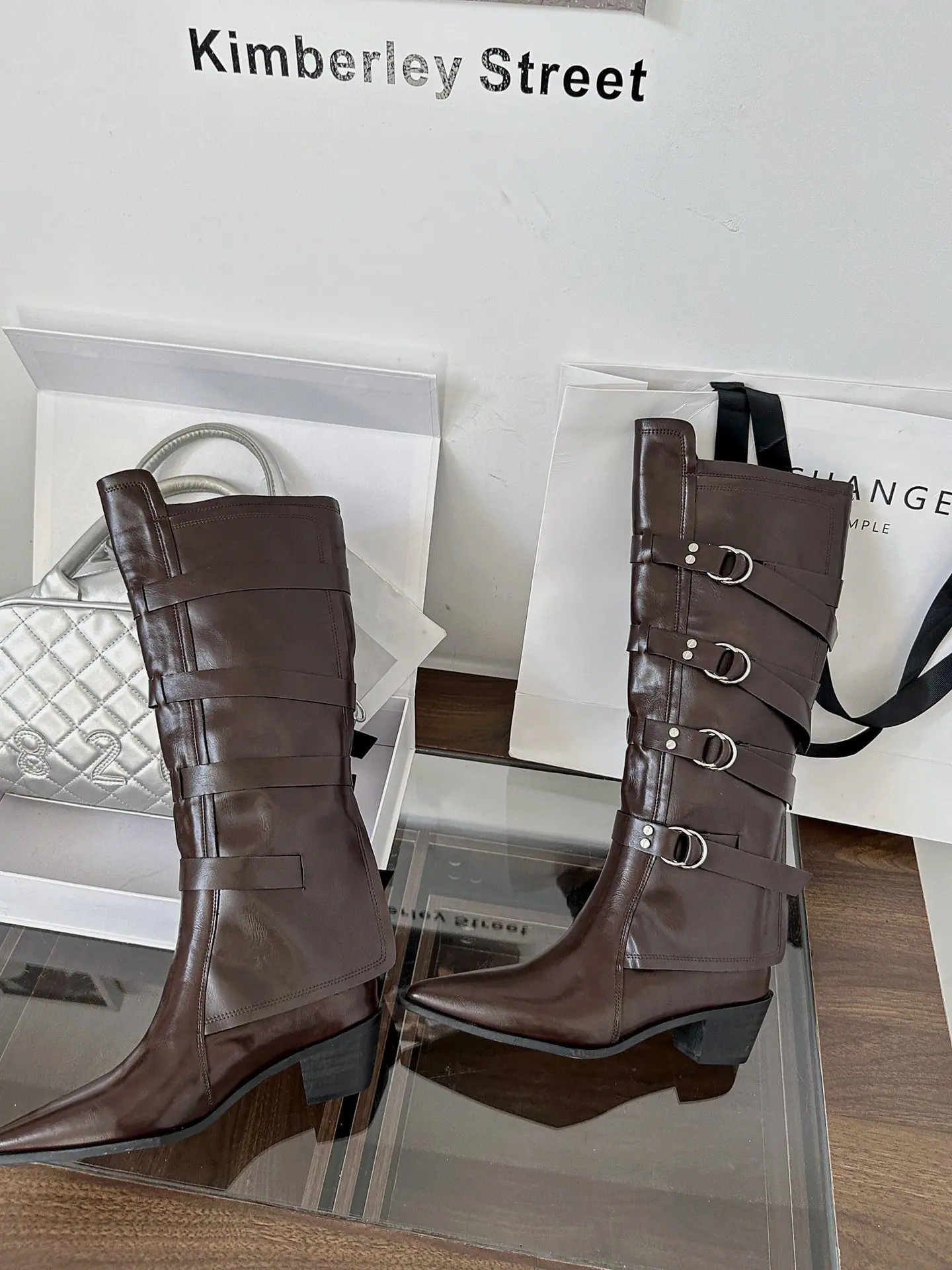 Botas de Caballero hasta la Rodilla con Hebilla Marrón Retro para Mujer 2025 Otoño/Invierno Nuevas Botas de Moda de Tacón Grueso Estilo Vaquero Occidental