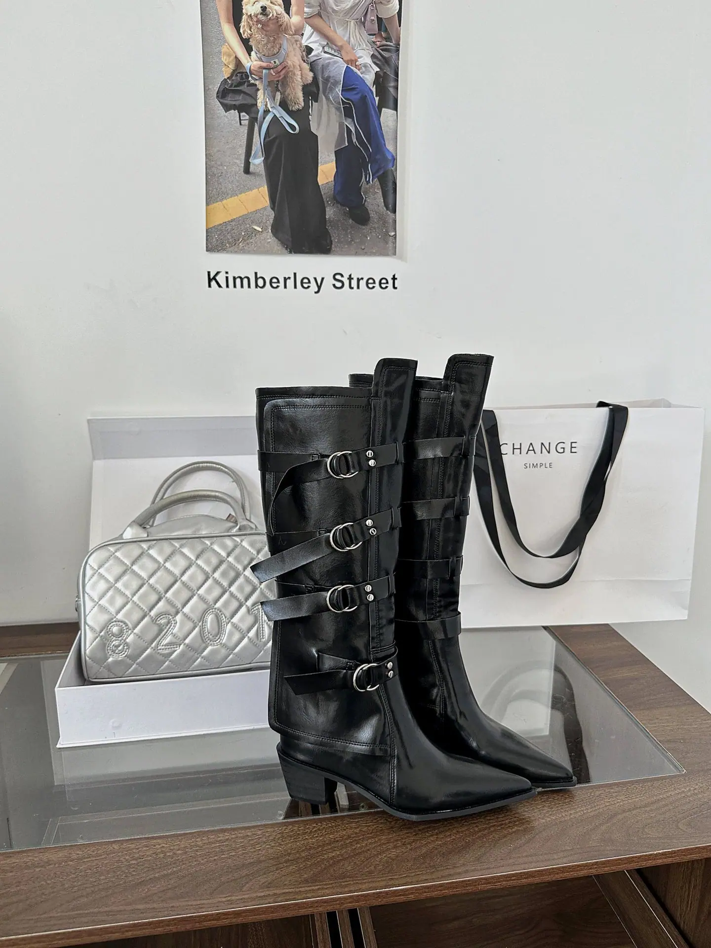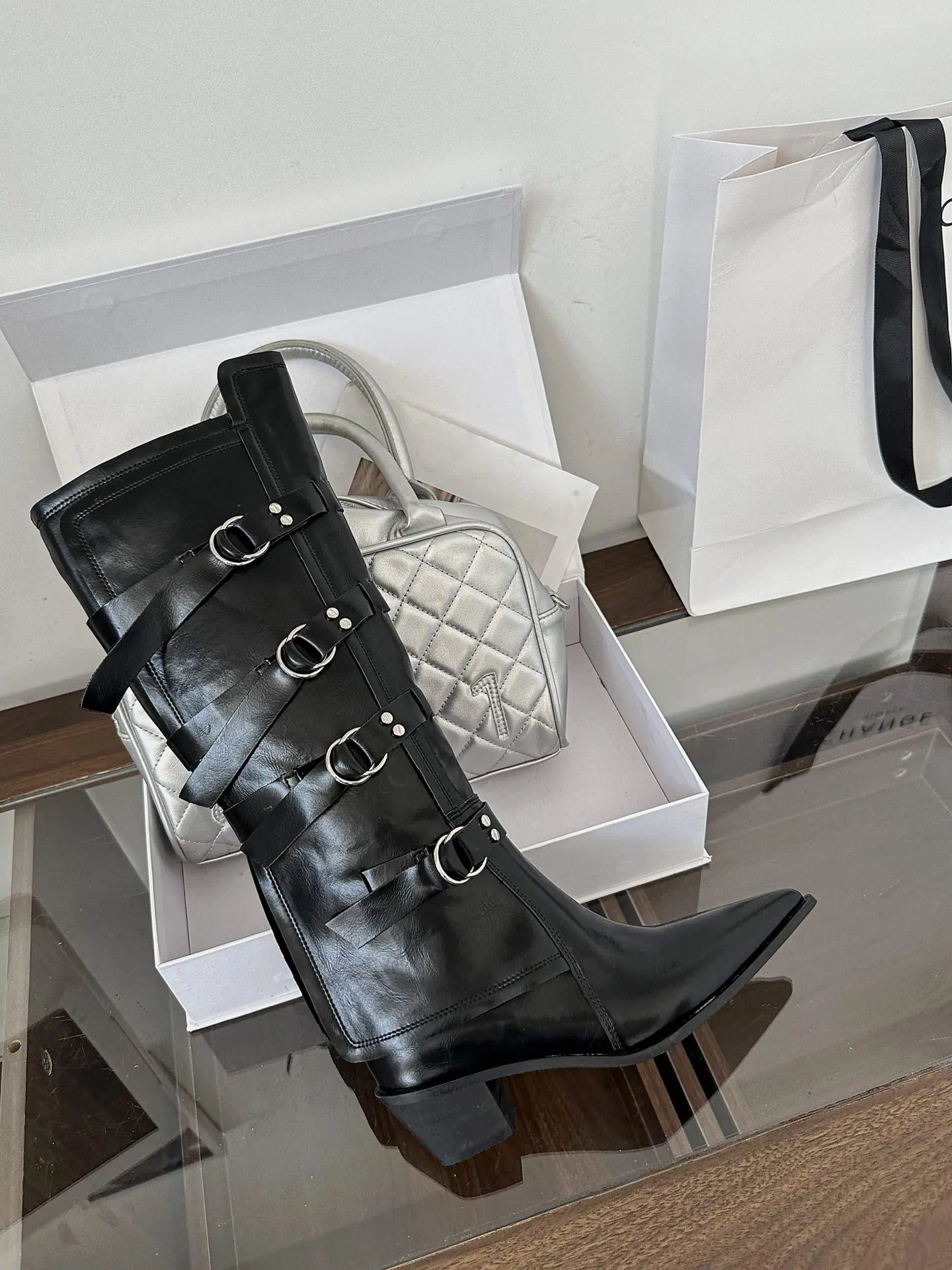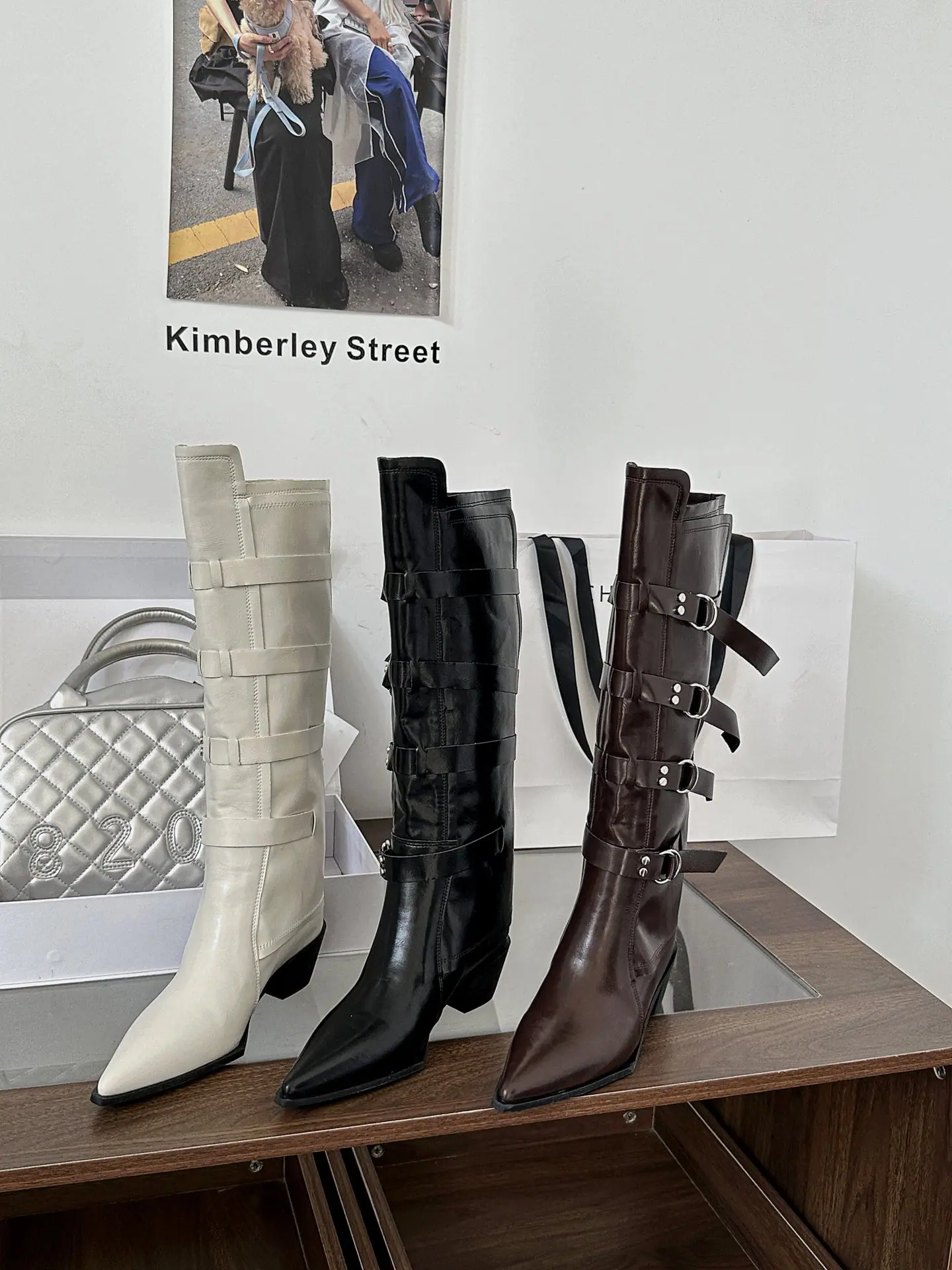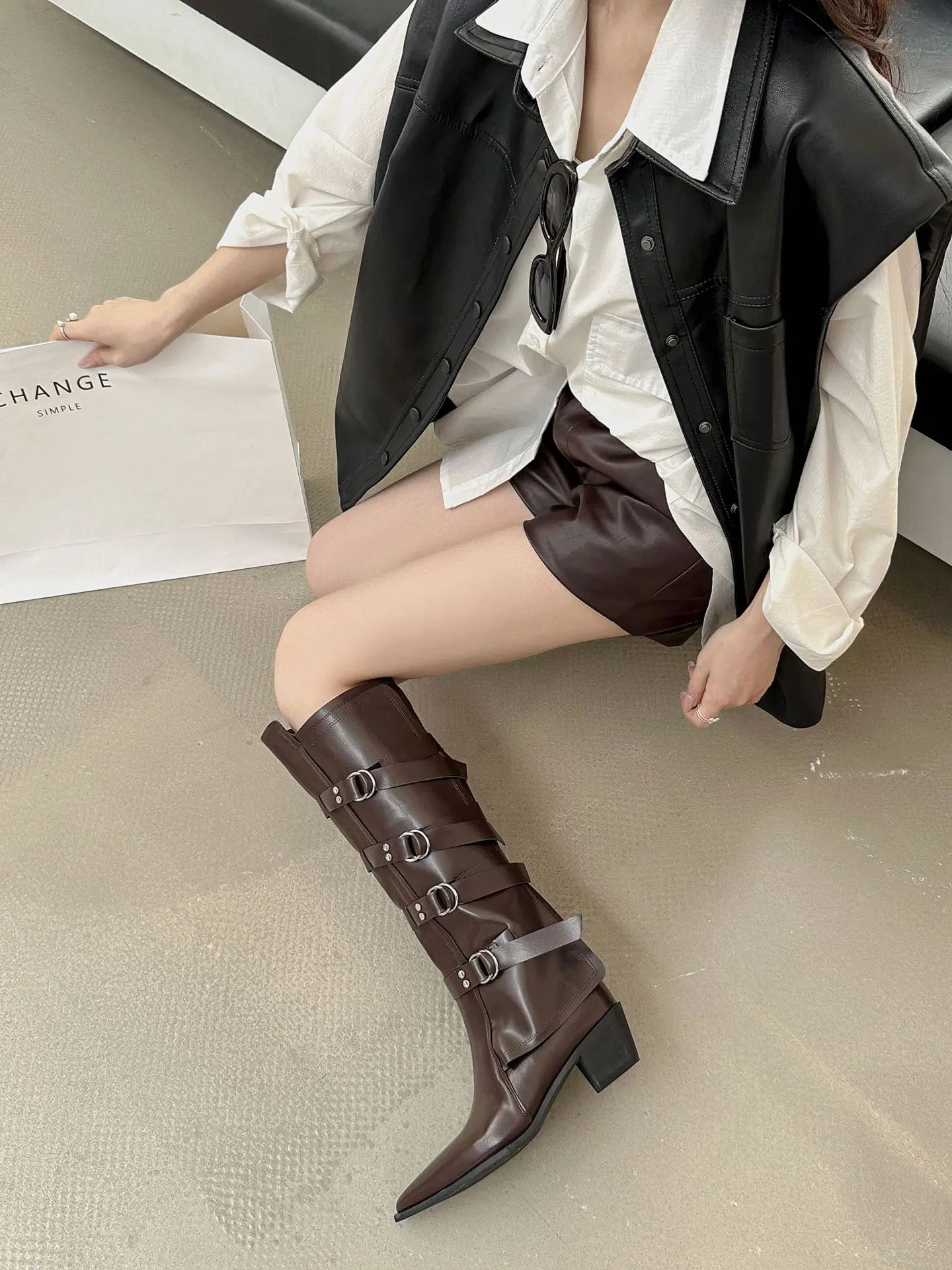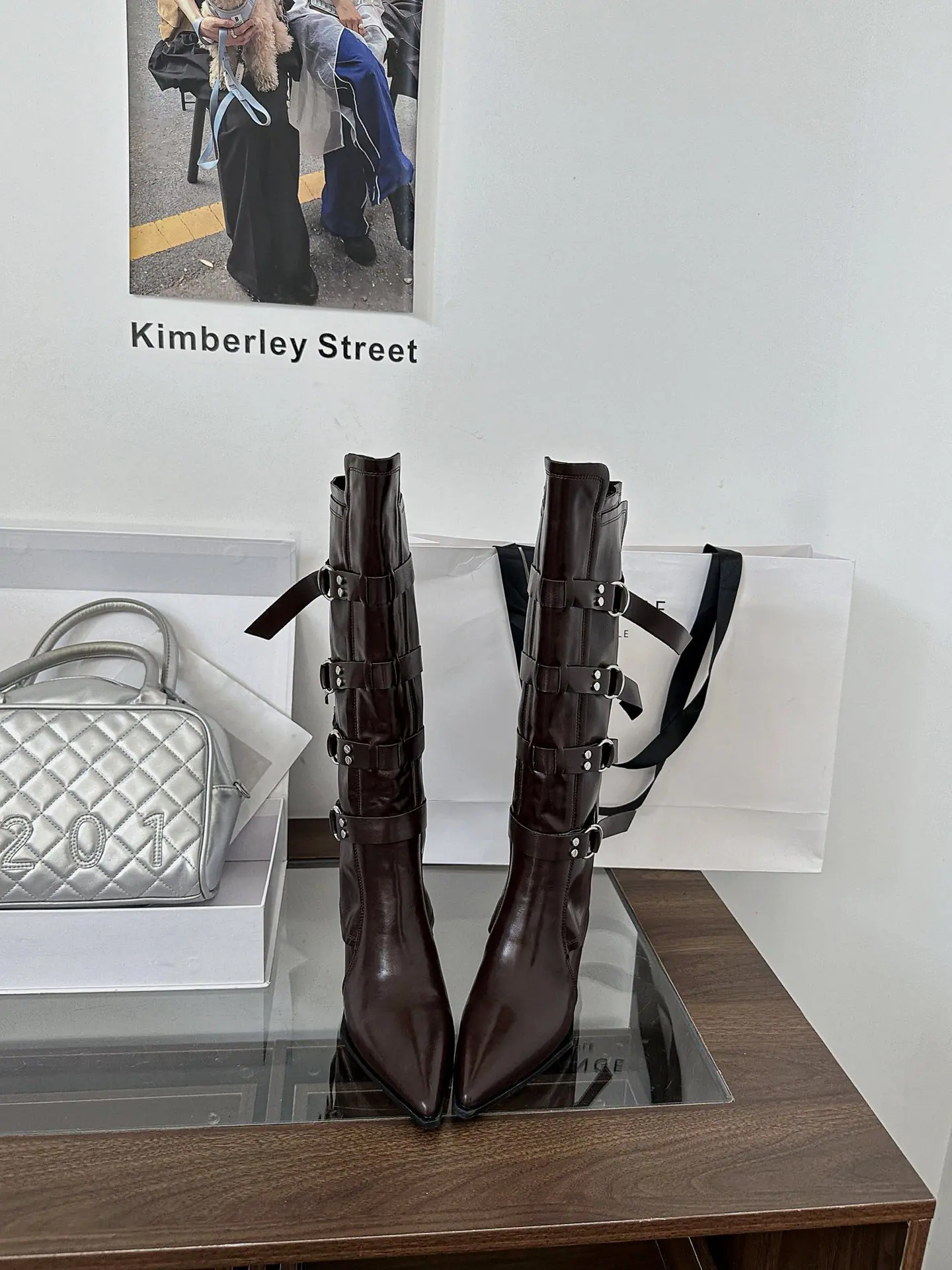 Botas de Caballero hasta la Rodilla con Hebilla Marrón Retro para Mujer 2025 Otoño/Invierno Nuevas Botas de Moda de Tacón Grueso Estilo Vaquero Occidental