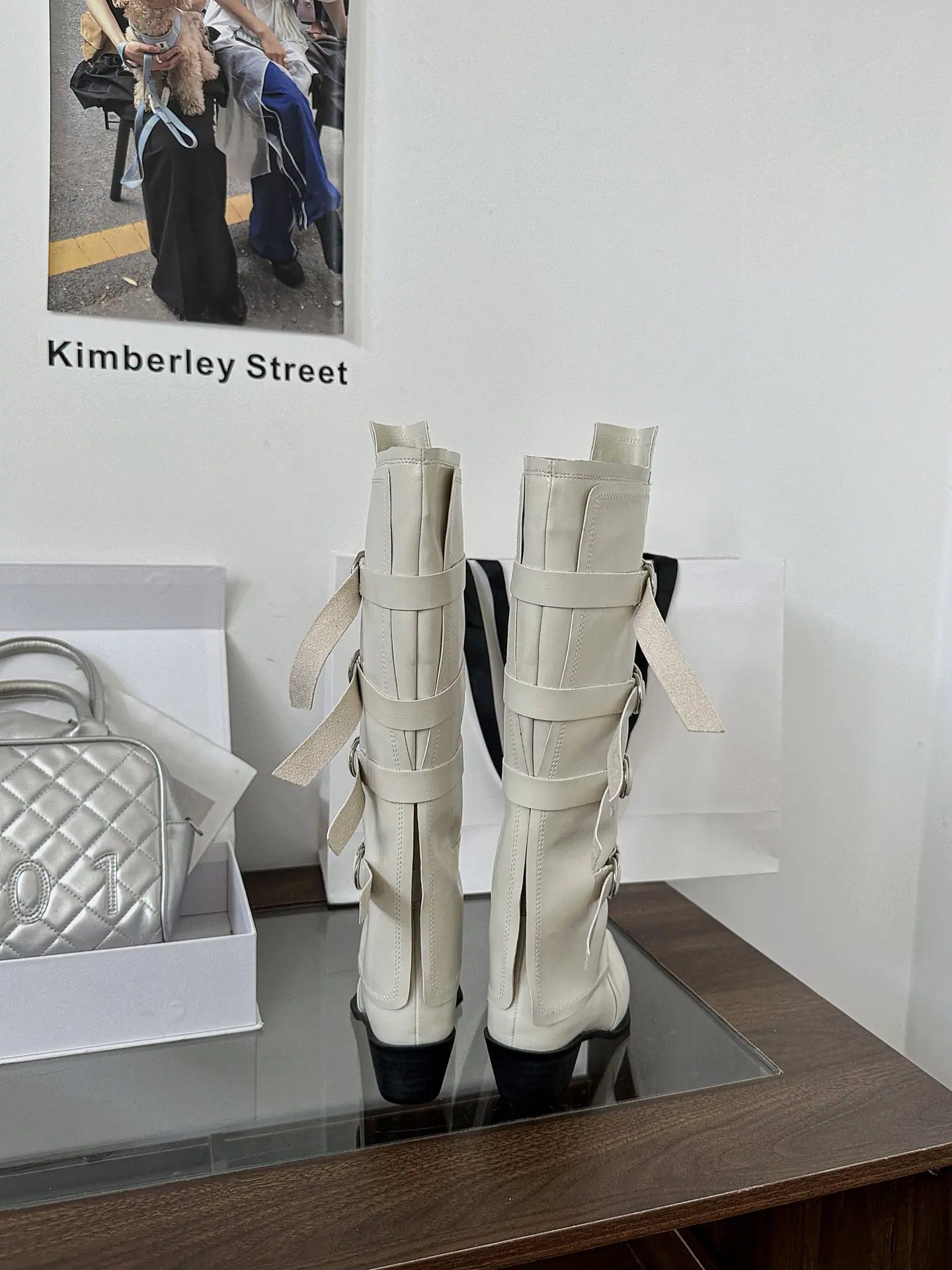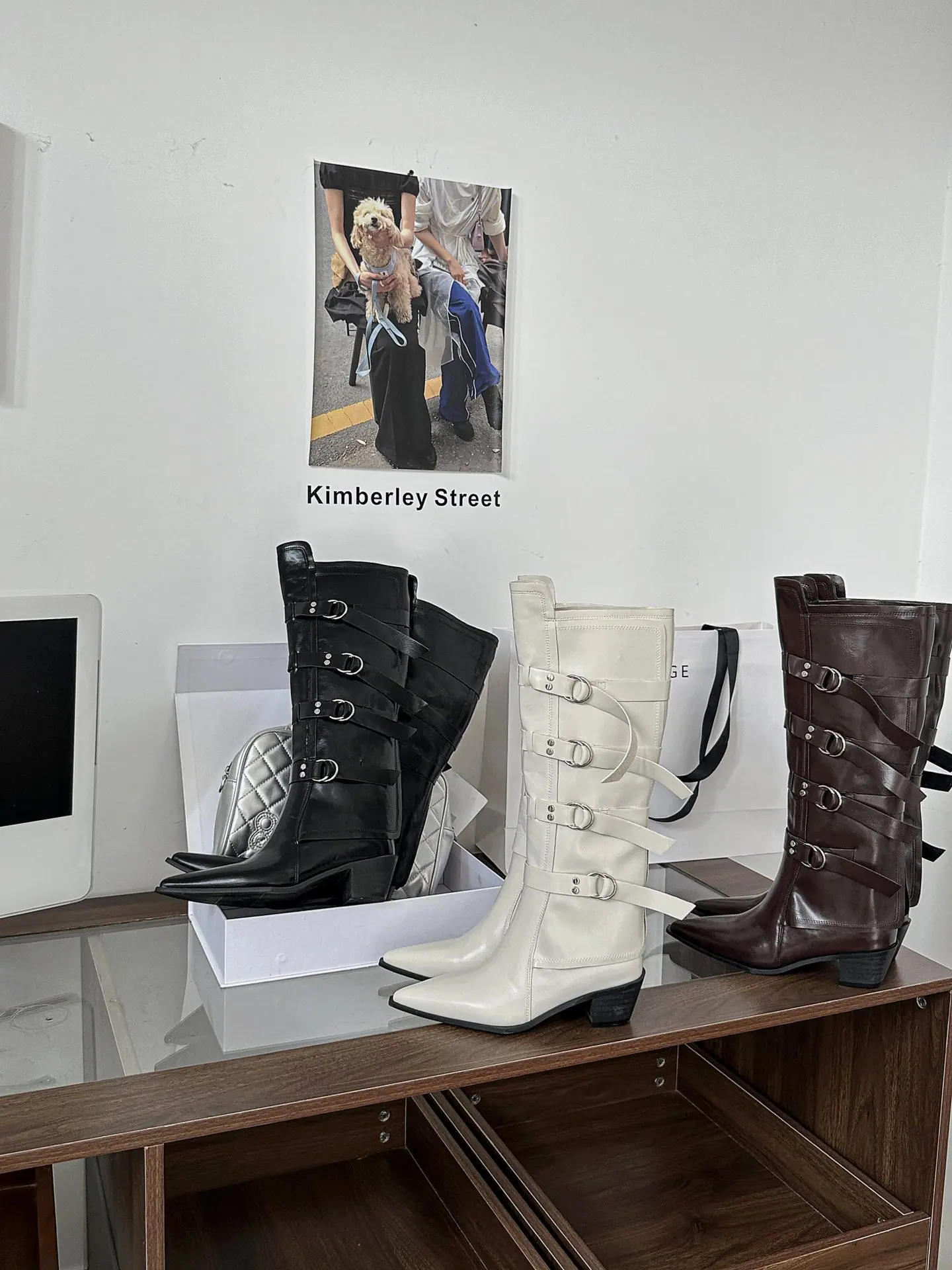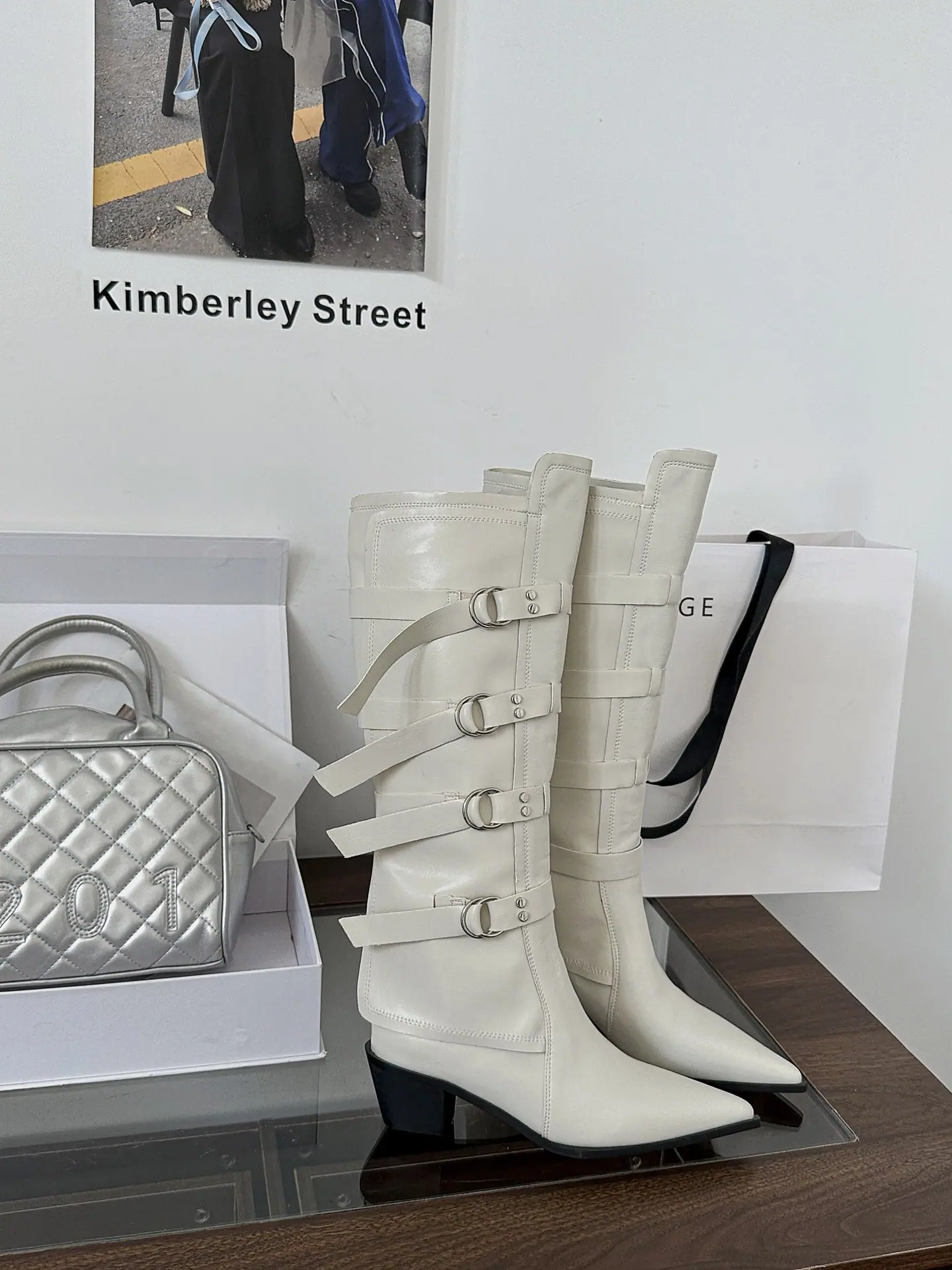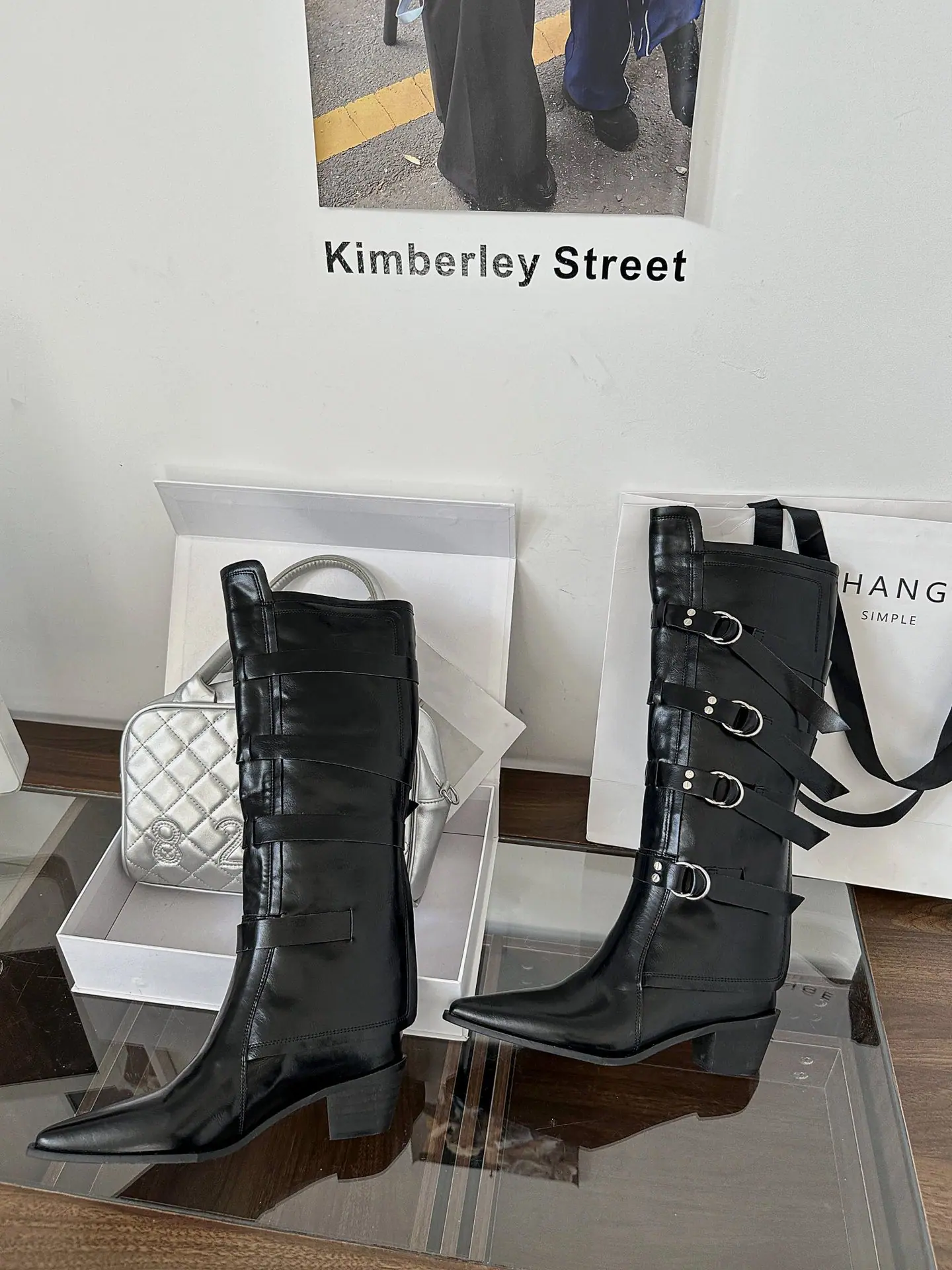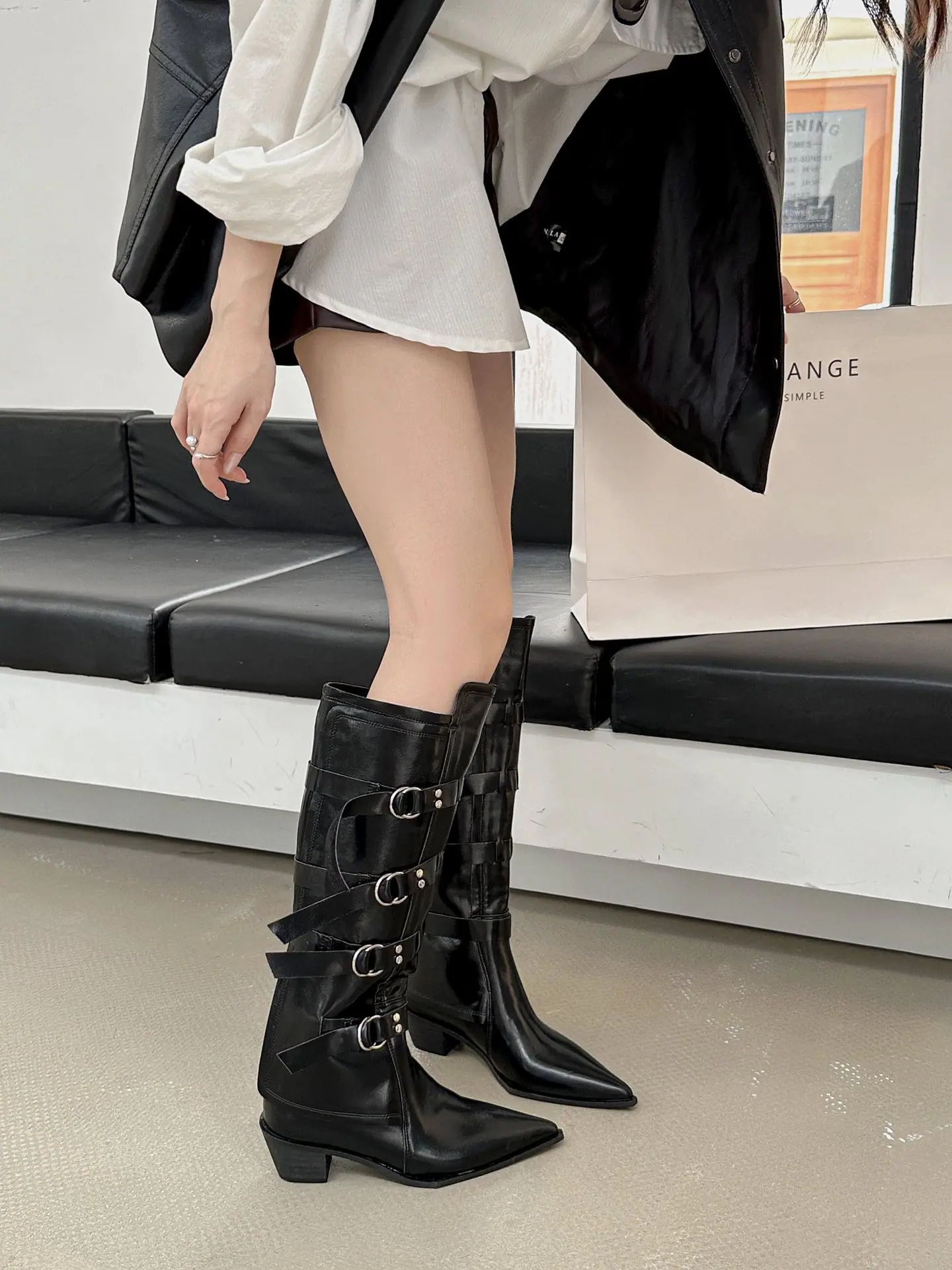 Botas de Caballero hasta la Rodilla con Hebilla Marrón Retro para Mujer 2025 Otoño/Invierno Nuevas Botas de Moda de Tacón Grueso Estilo Vaquero Occidental
