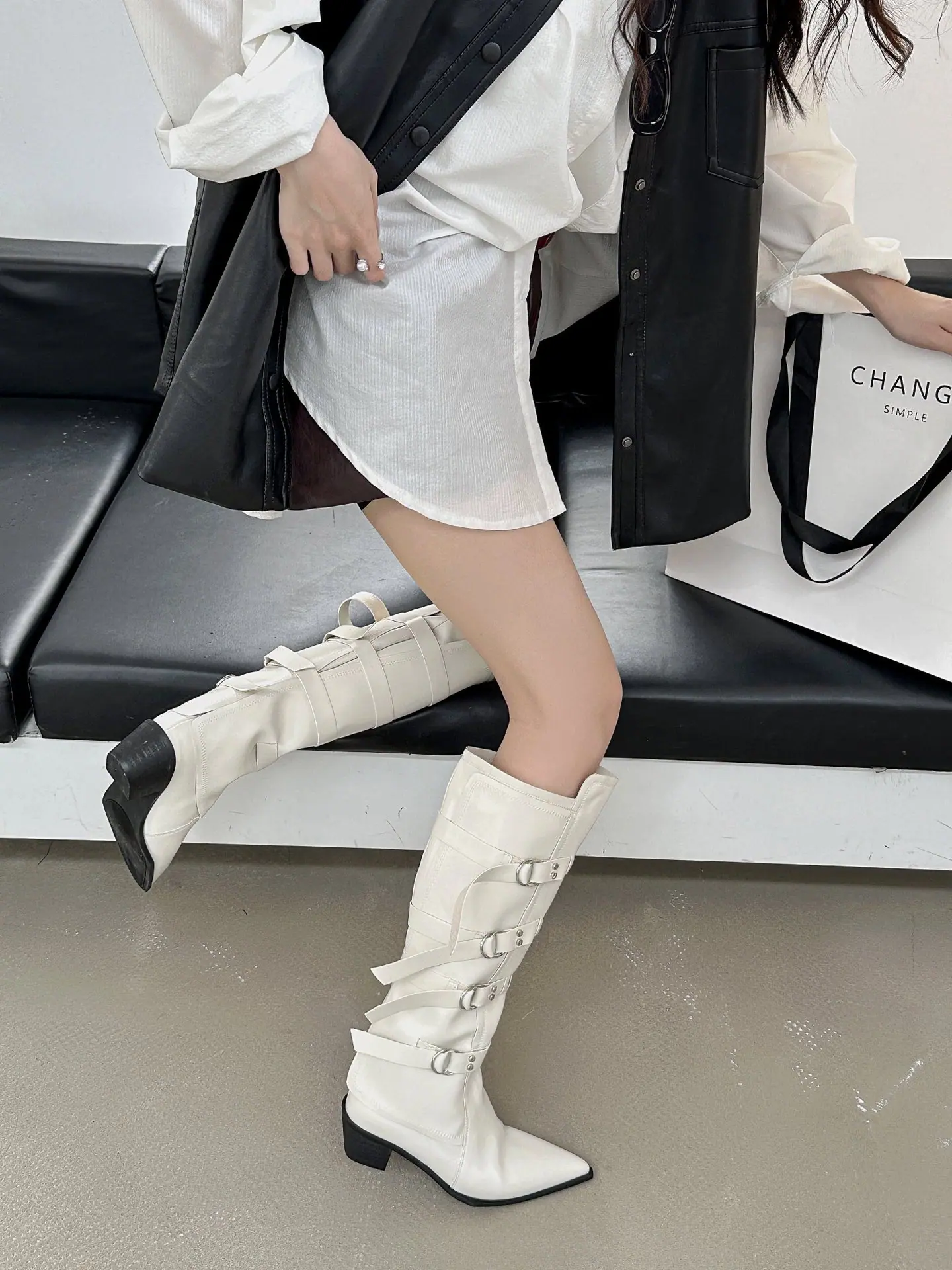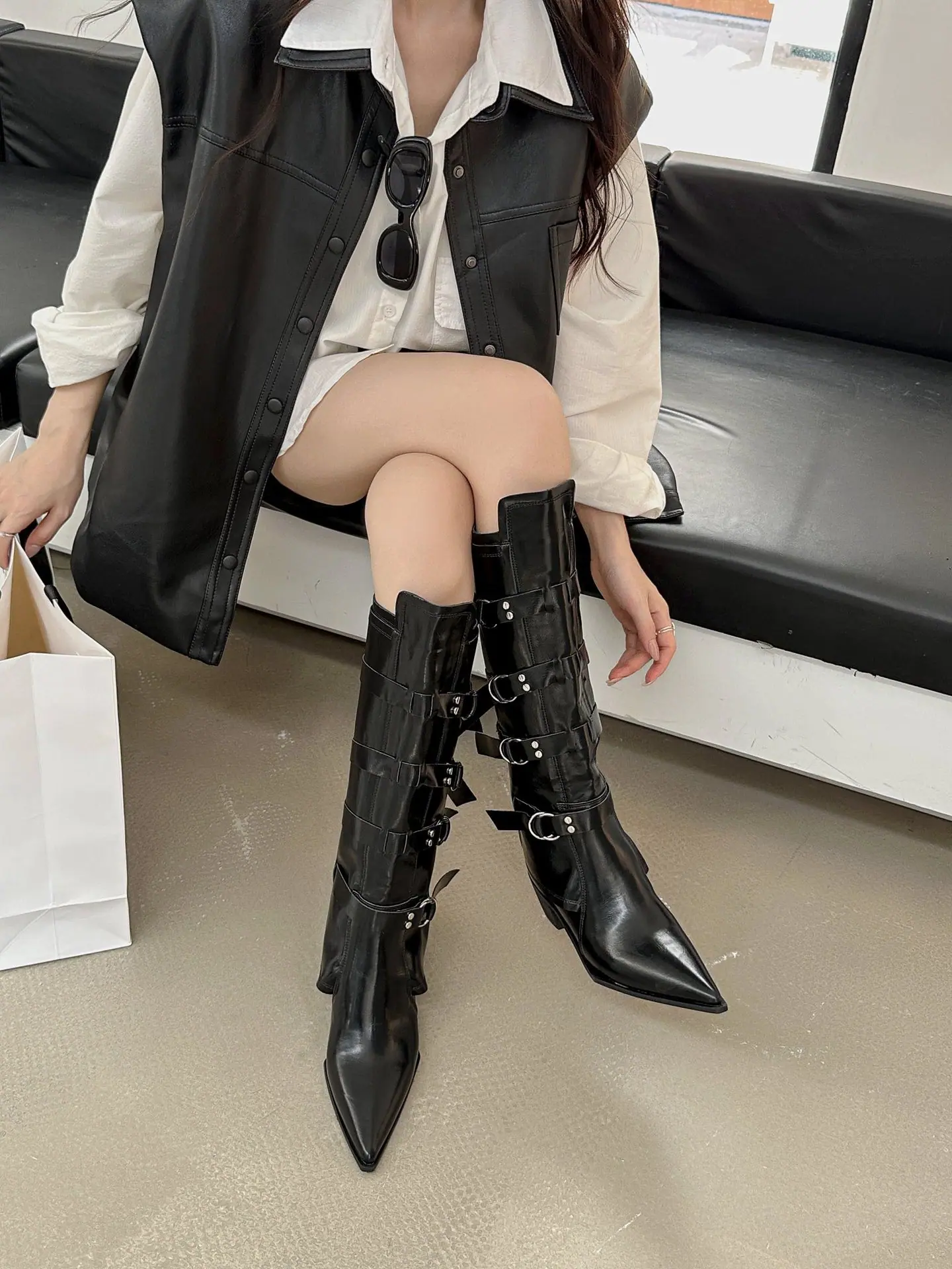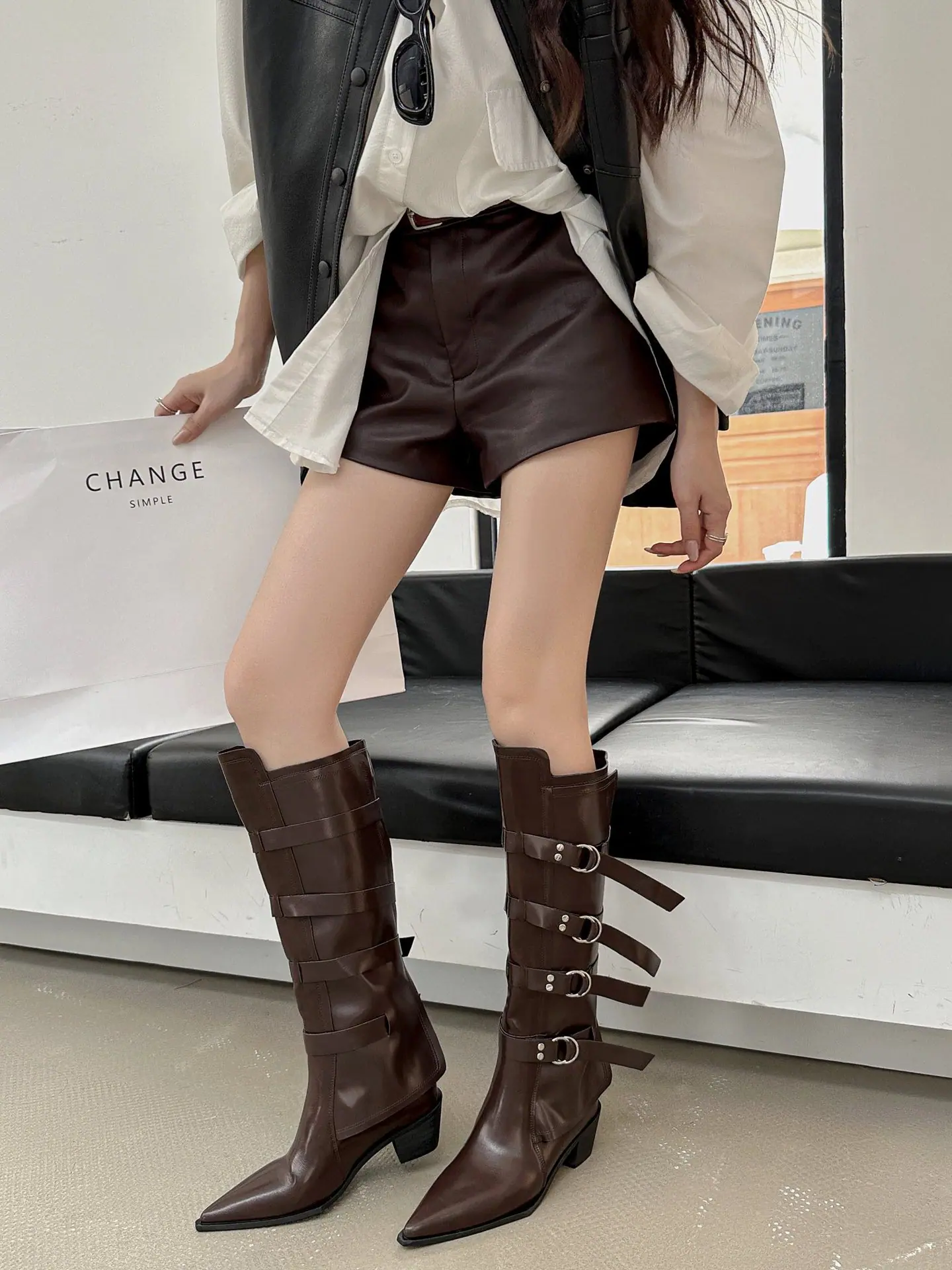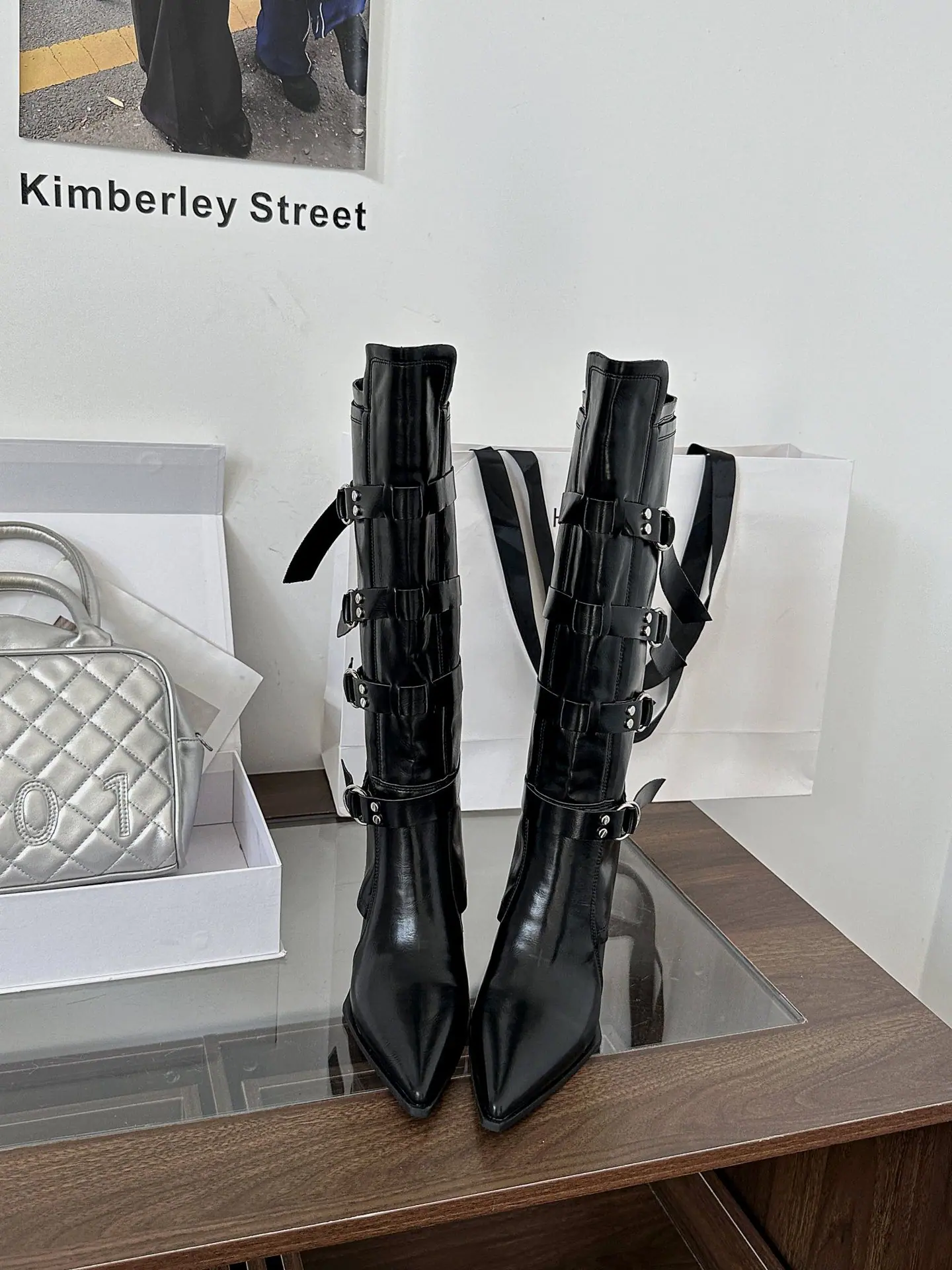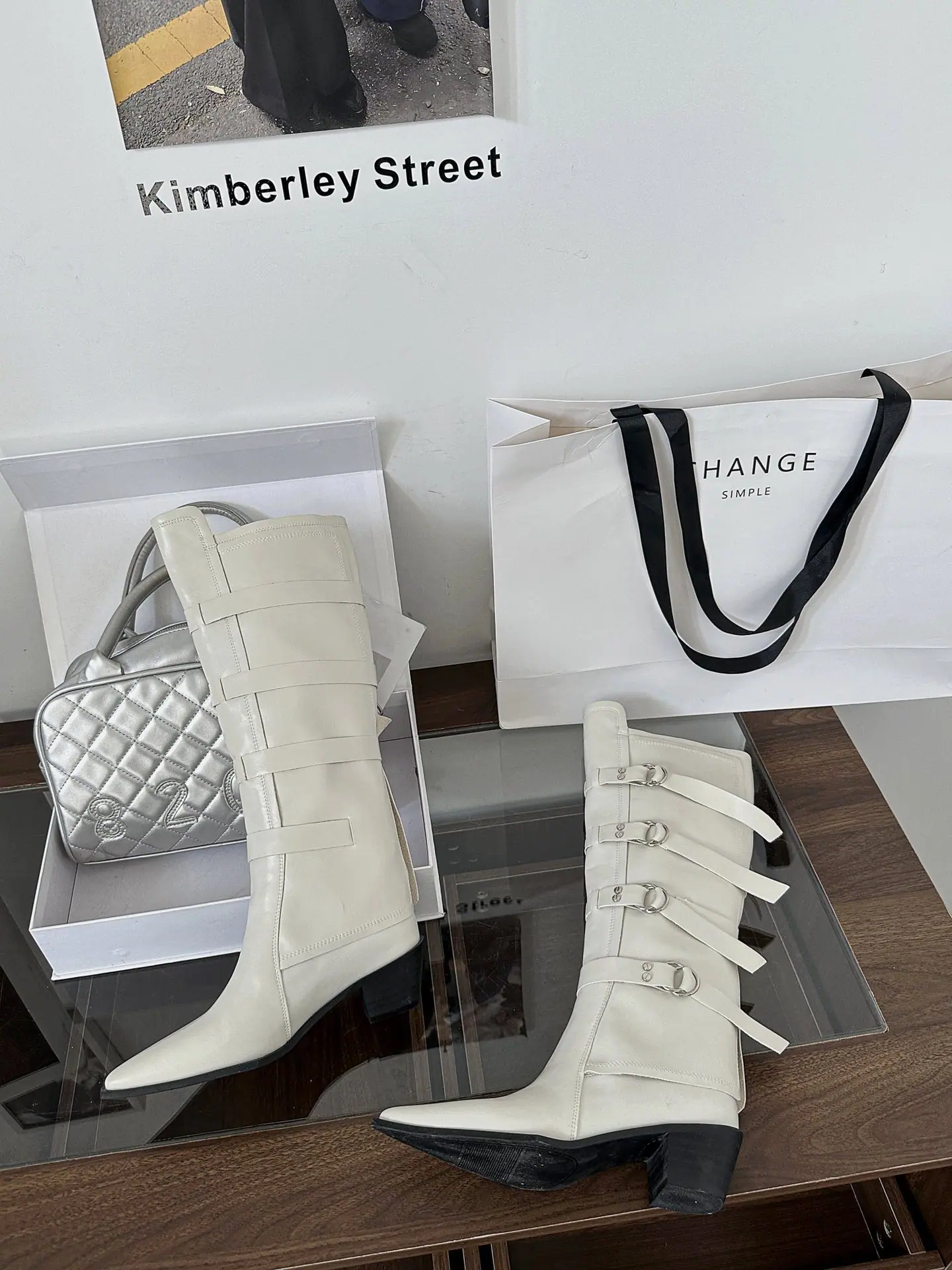 Botas de Caballero hasta la Rodilla con Hebilla Marrón Retro para Mujer 2025 Otoño/Invierno Nuevas Botas de Moda de Tacón Grueso Estilo Vaquero Occidental
