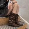 Botines Europeos y Americanos Otoño e Invierno 2025 Versátiles Retro Tacón Grueso Puntiagudos Hebilla de Cinturón de Cuero Moda Botas Western Remaches Plisados Botines Cortos