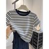 Camiseta de manga corta con cuello redondo a rayas de hombro recto retro con sentido del diseño para mujer, moda de verano, ajuste ceñido, adelgazante, top básico interior
