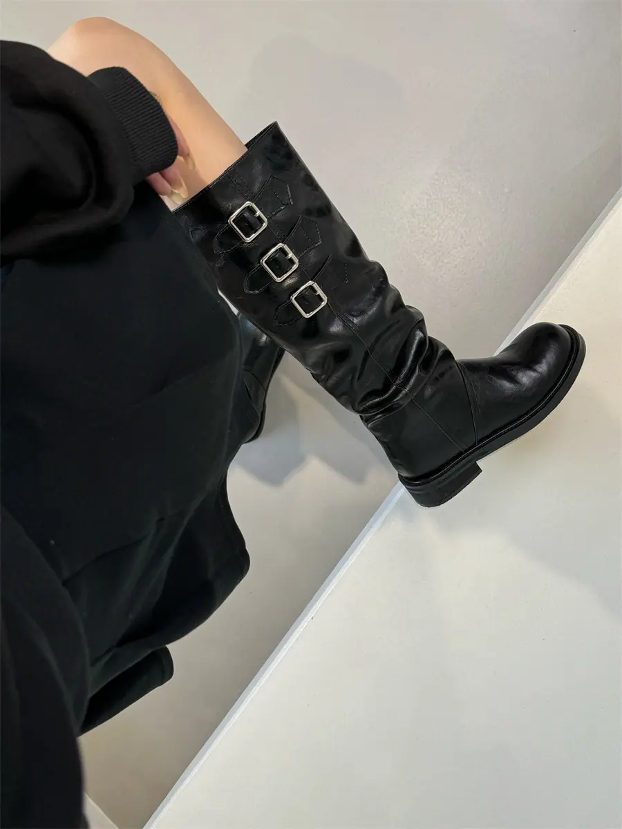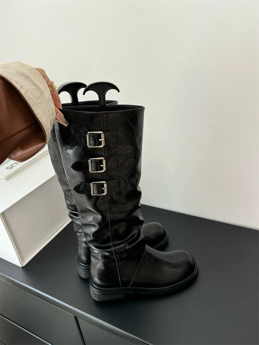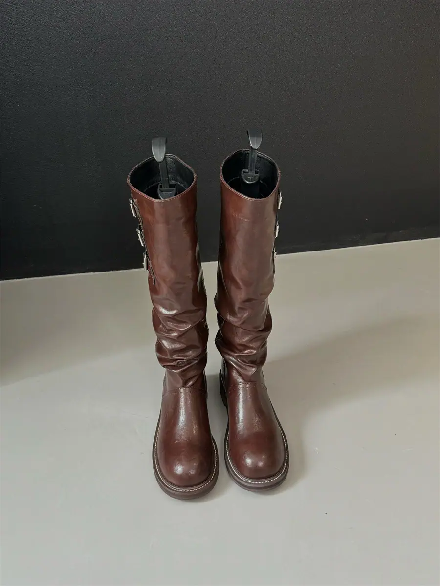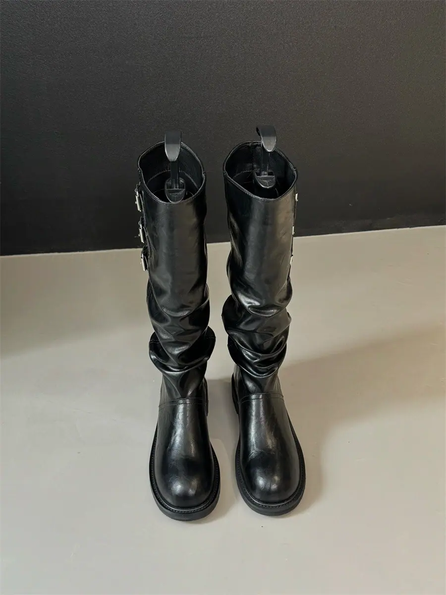 Botas de caballero hasta la rodilla de estilo europeo y americano con tacón grueso y suela gruesa, nicho, otoño e invierno 2025, nuevas, plisadas, retro, versátiles, con caña