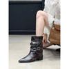 Botas de Piel Plisada Puntiagudas para Mujer Otoño e Invierno 2025 Hebilla de Cinturón Botines Tacón Grueso Botas de Jinete Botas para Pantalones Negro Marrón