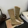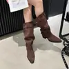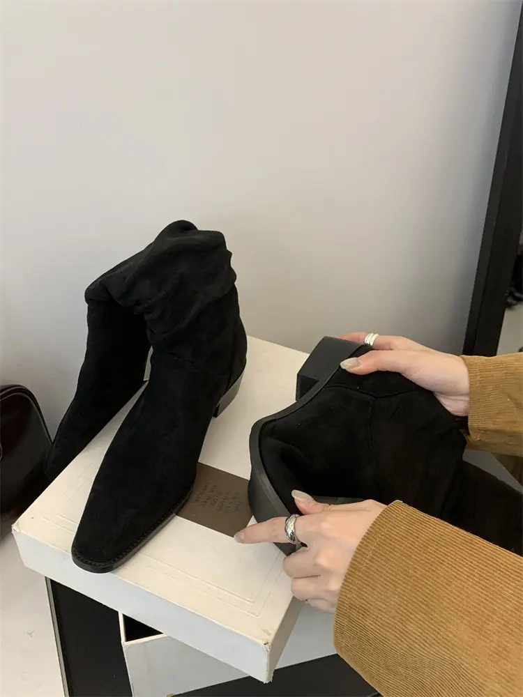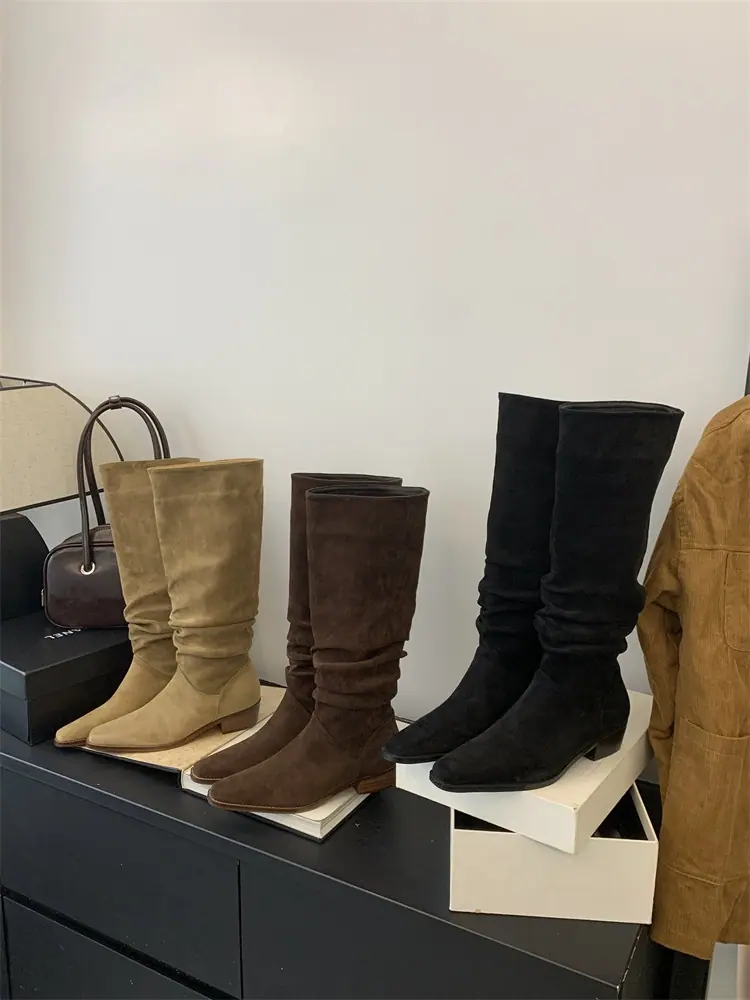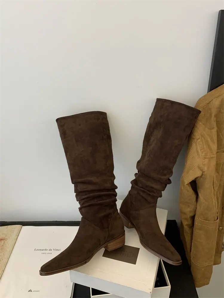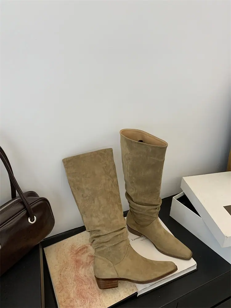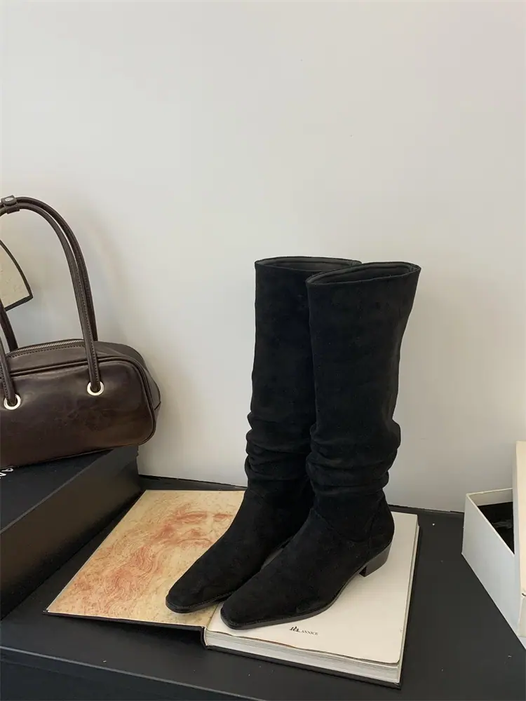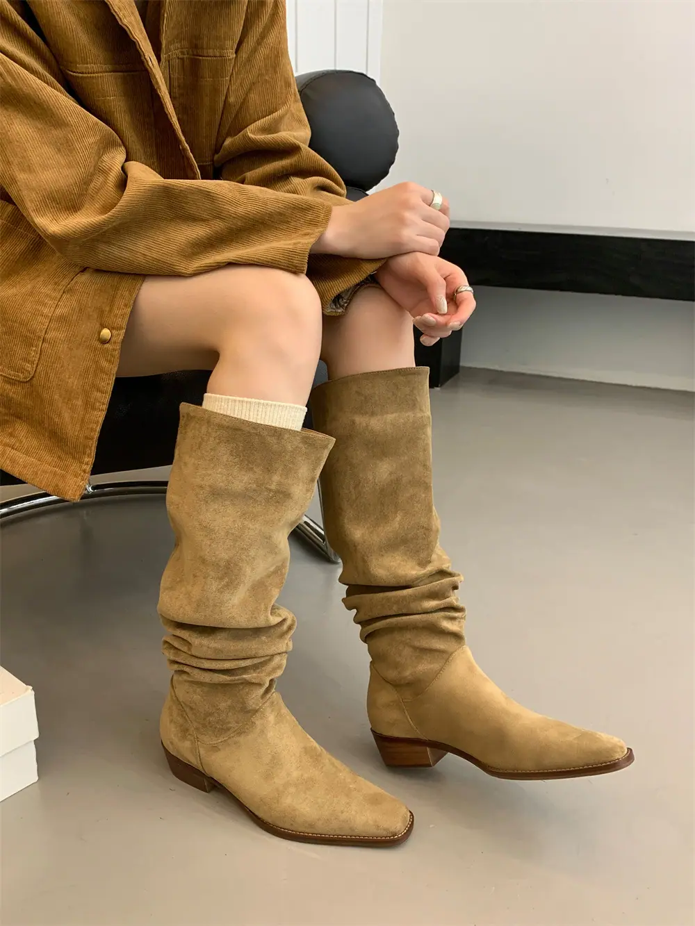 2025 Nuevas Botas Slouch Plisadas Gamuza Vintage Punta Afilada Tacón Grueso Botas Sobre la Rodilla Botas Vaqueras Occidentales Botas de Moda Pull-On