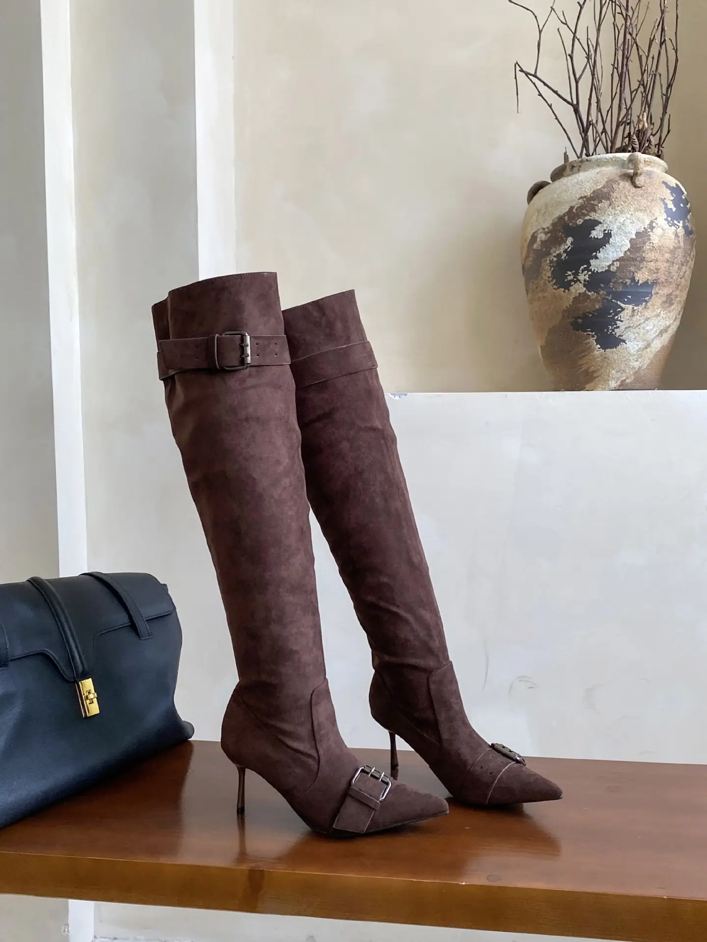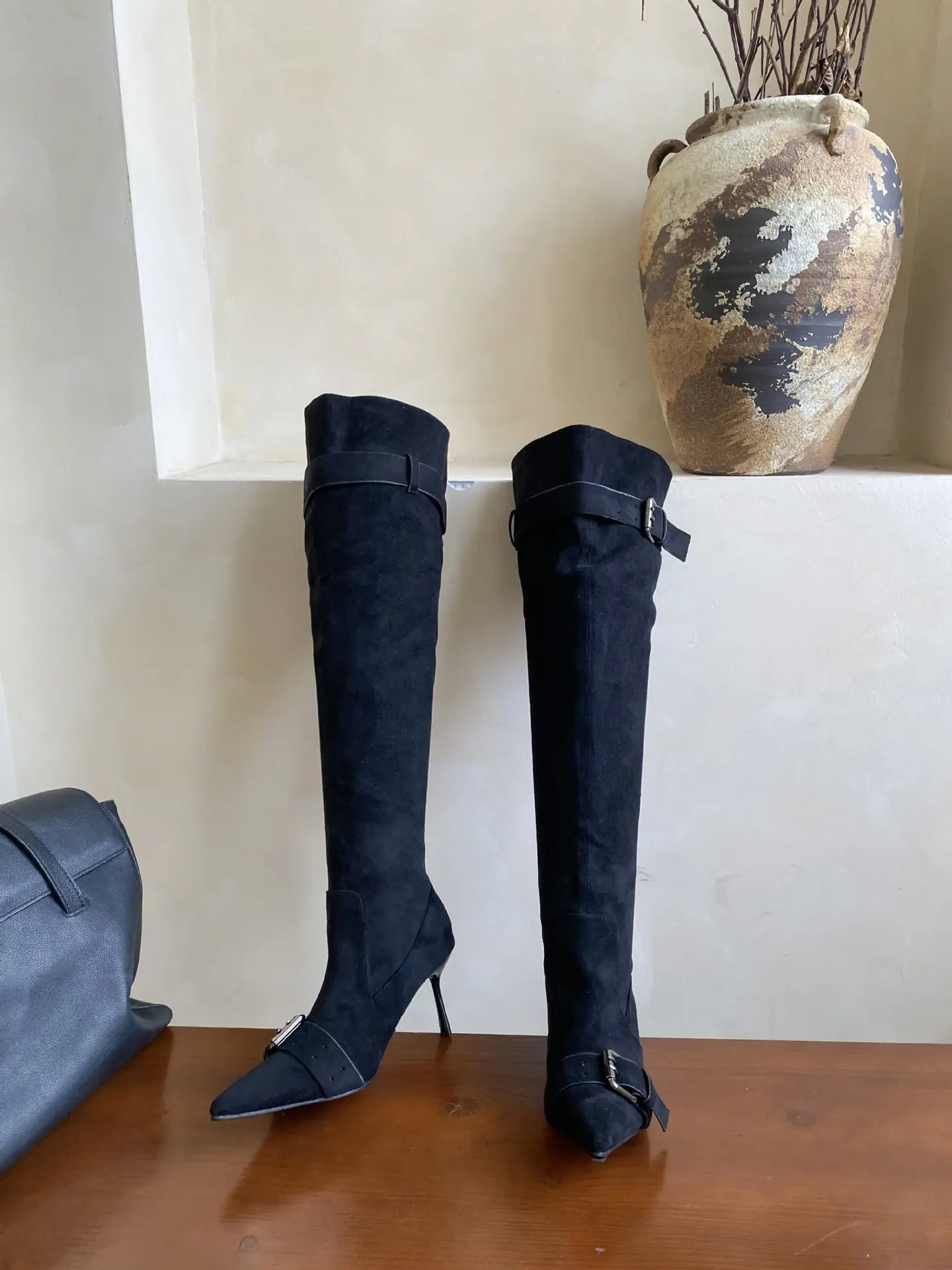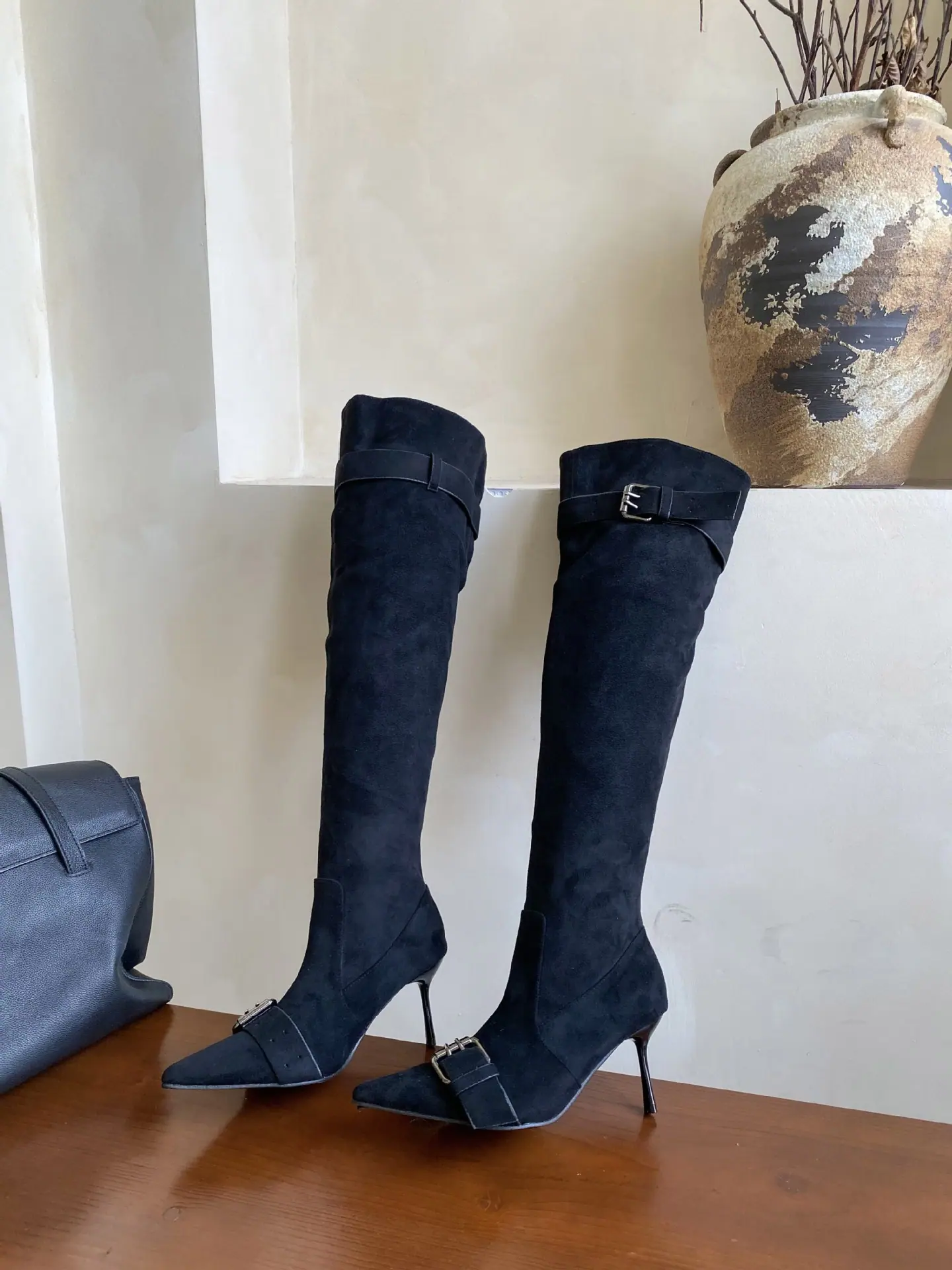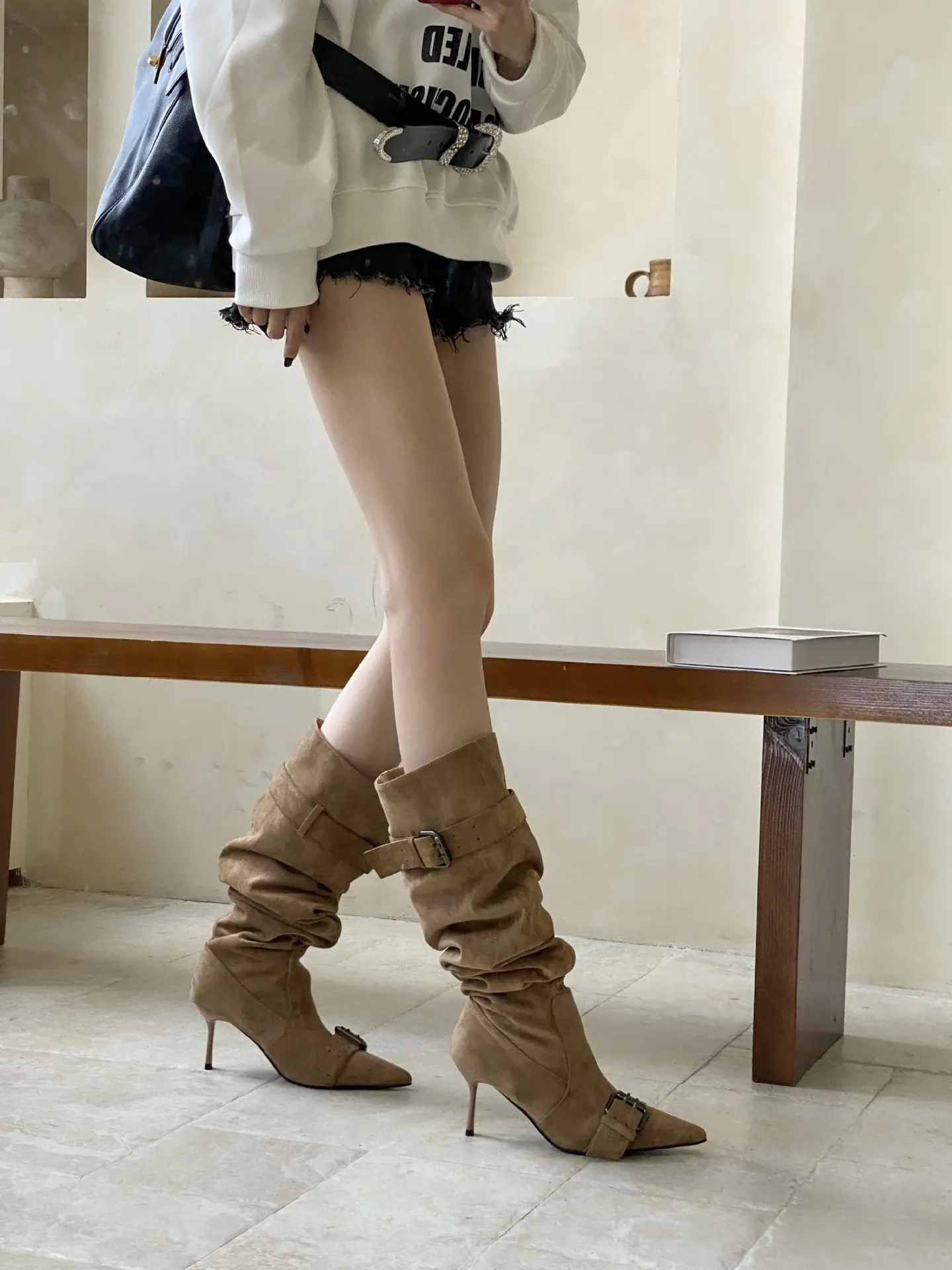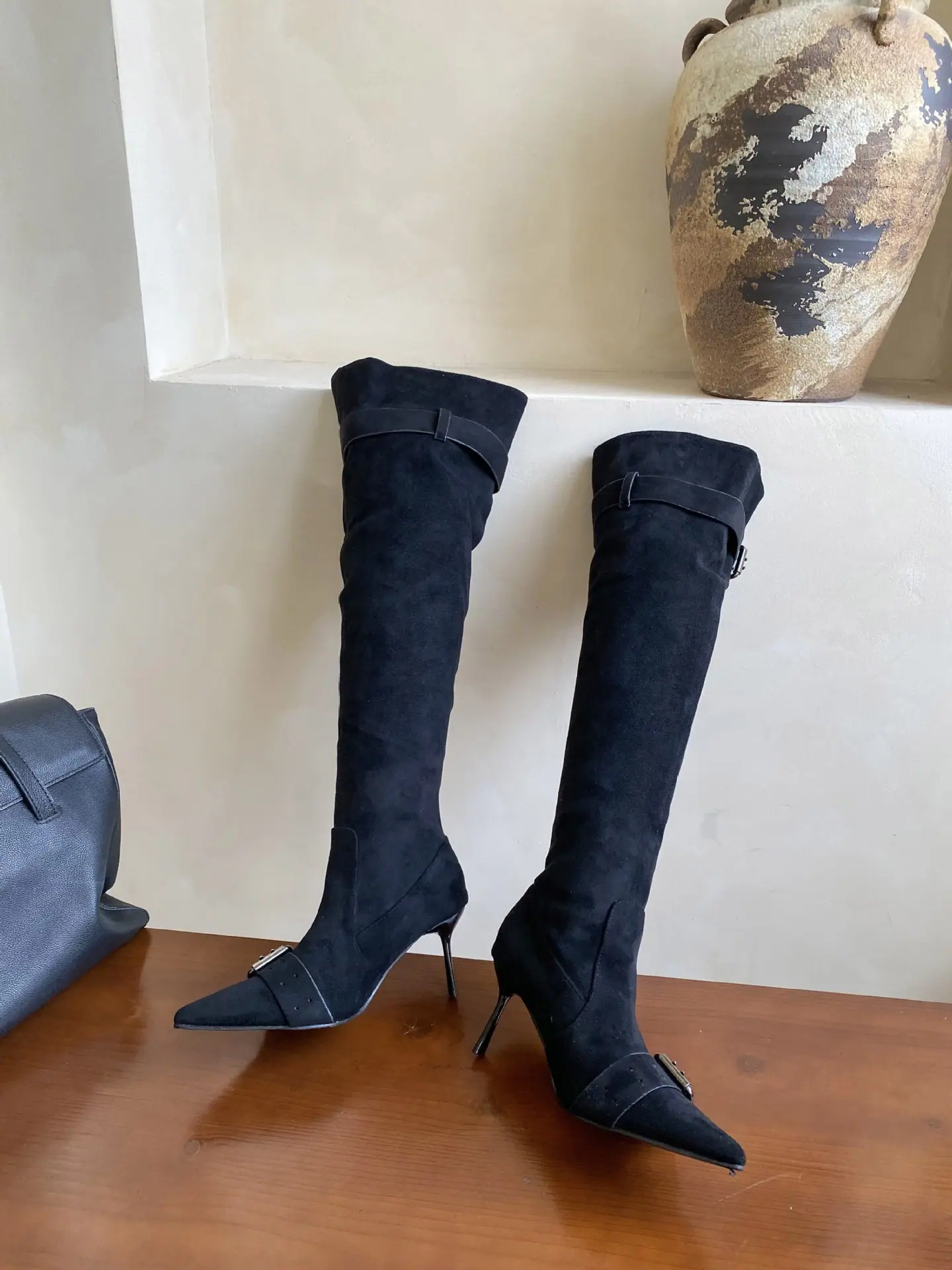 Otoño/Invierno 2025 Nuevos Europeos y Americanos Punta Afilada Tacón de Aguja Tacón Alto Temperamento Moda Francesa Sexy Hebilla Apiladas Botas Largas