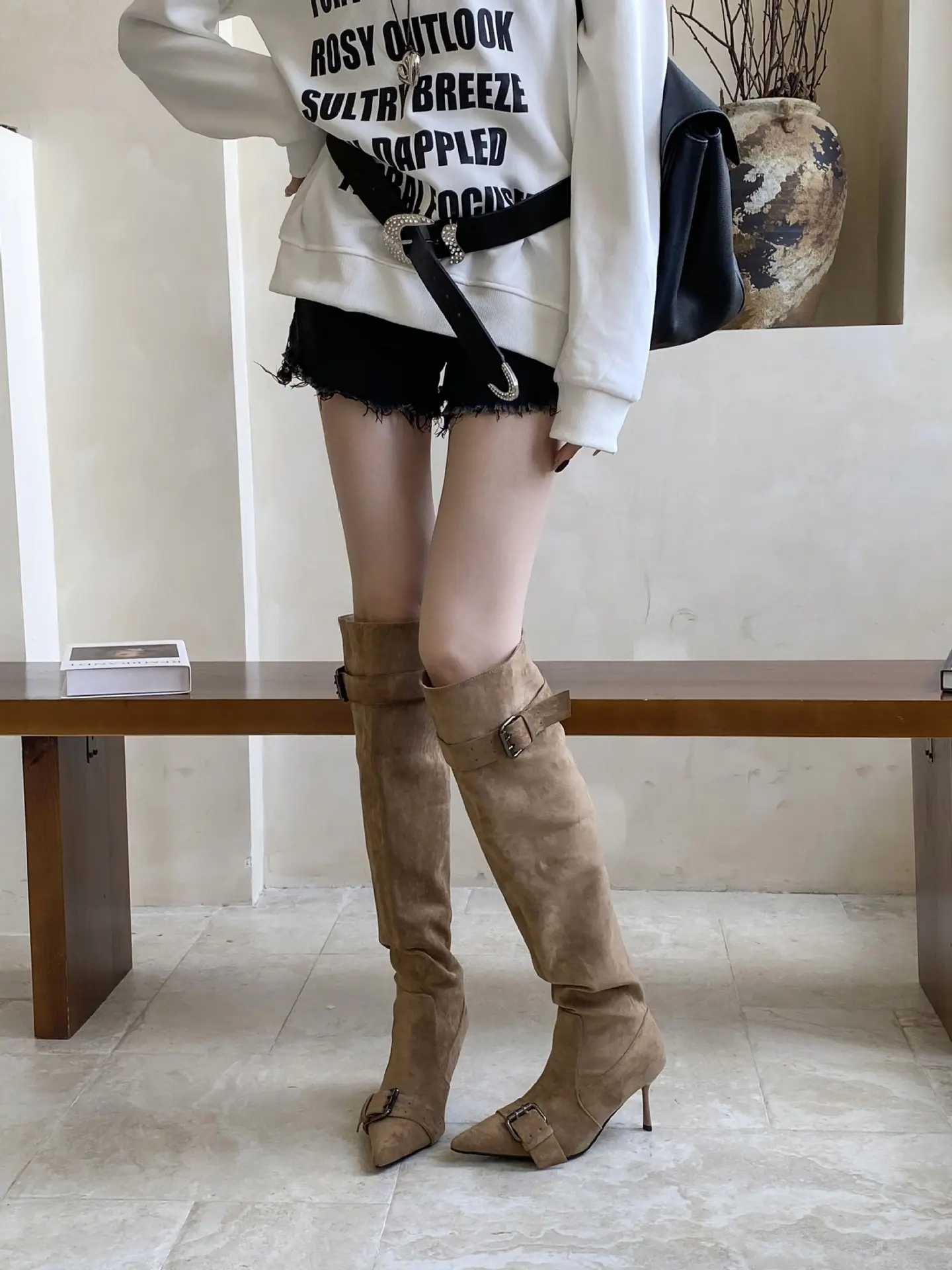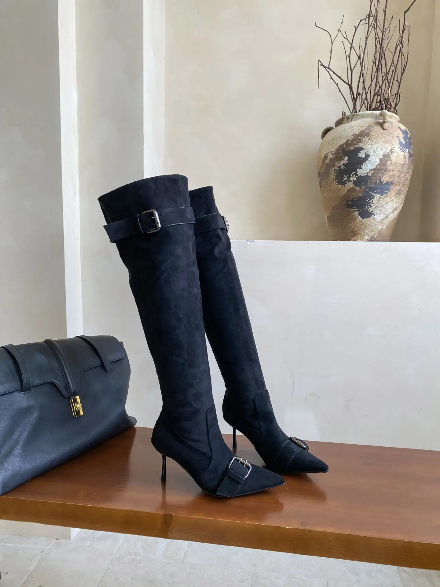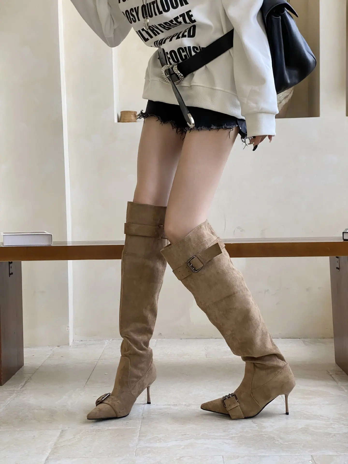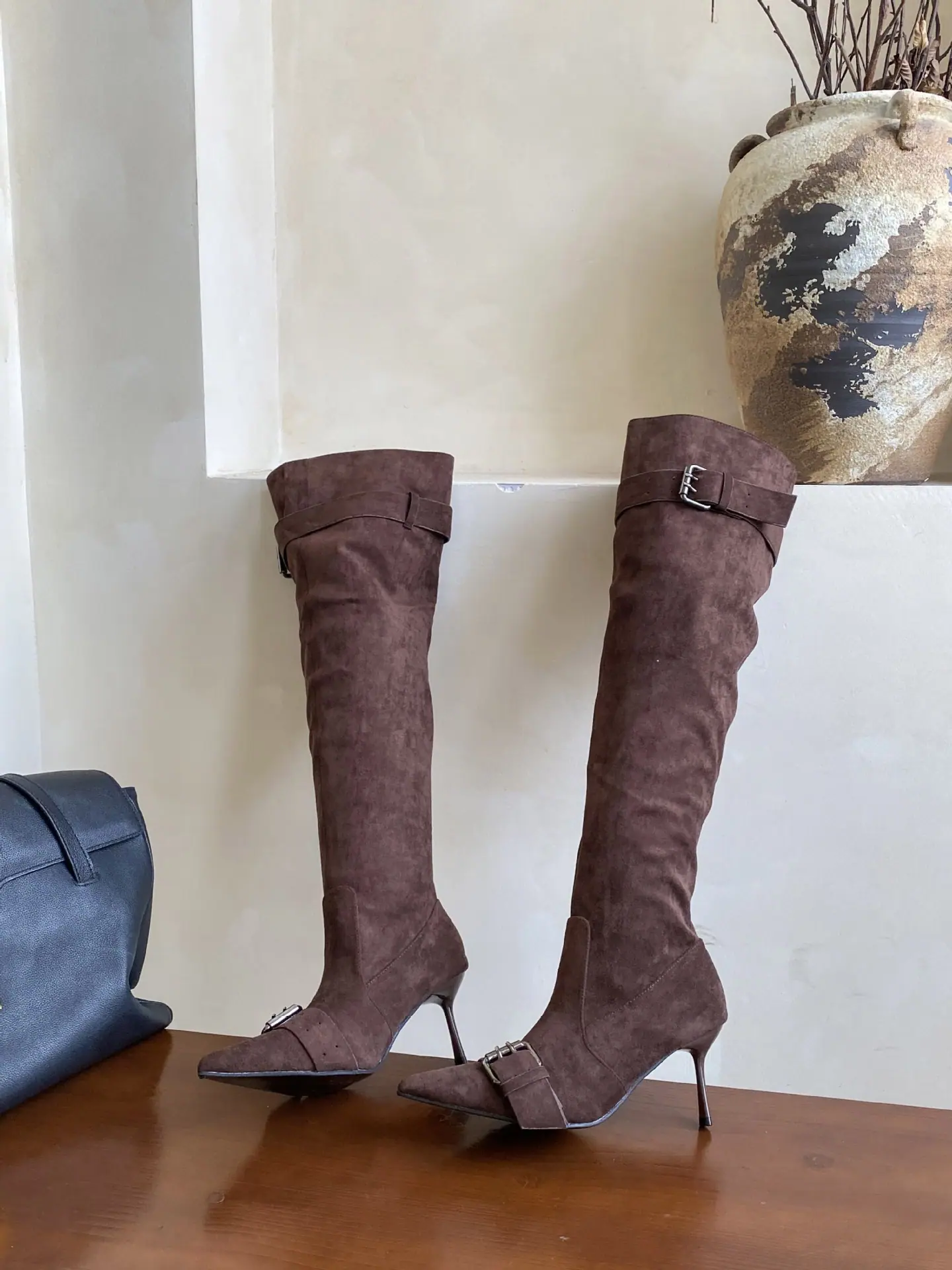 Otoño/Invierno 2025 Nuevos Europeos y Americanos Punta Afilada Tacón de Aguja Tacón Alto Temperamento Moda Francesa Sexy Hebilla Apiladas Botas Largas