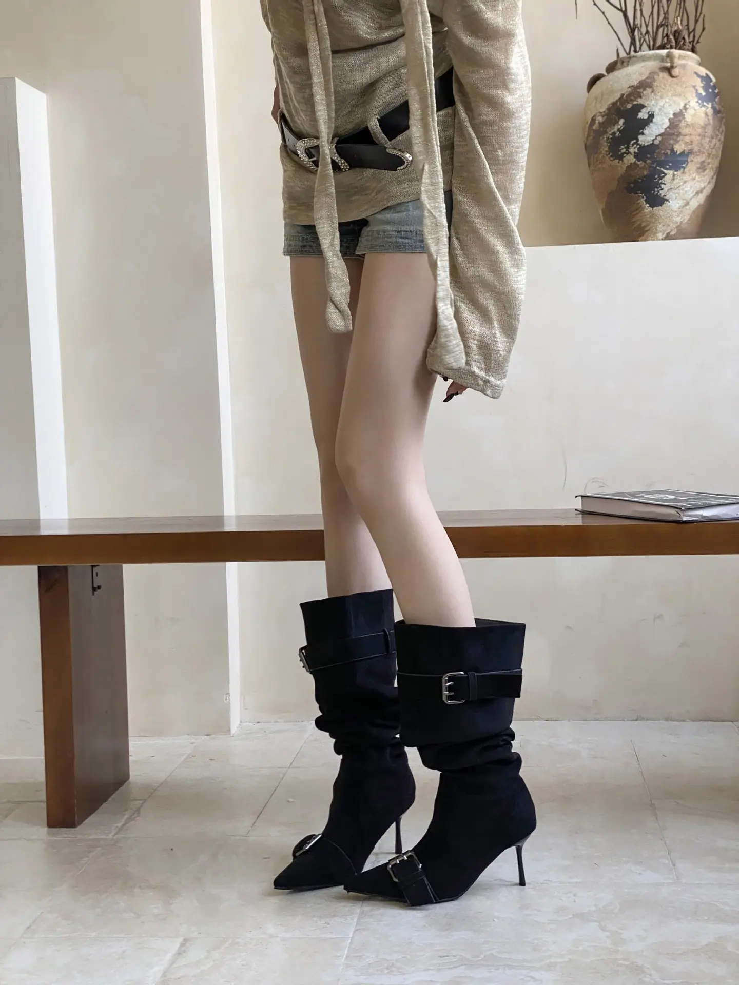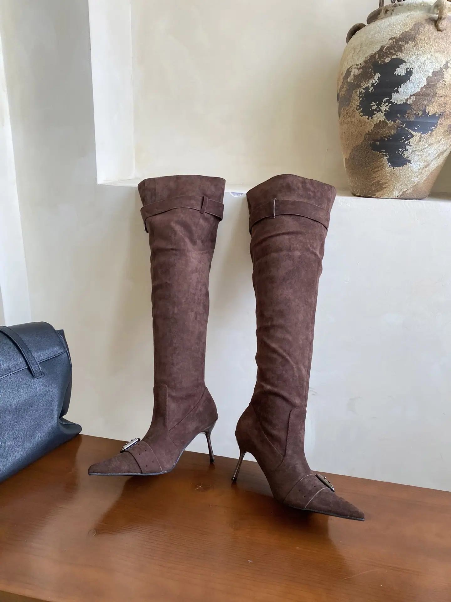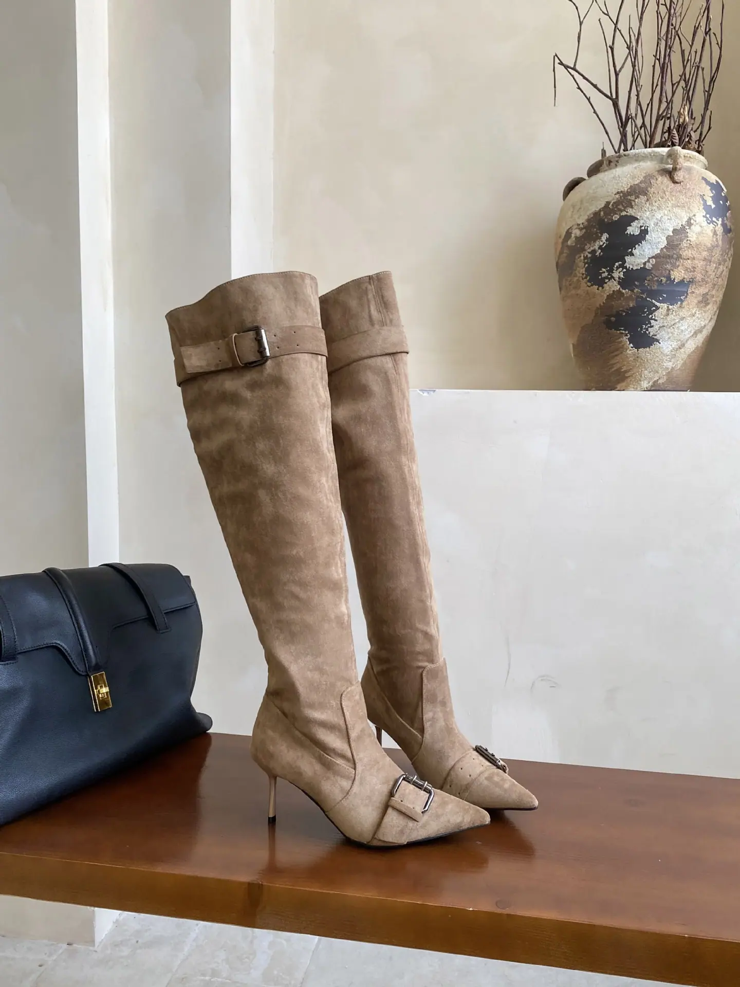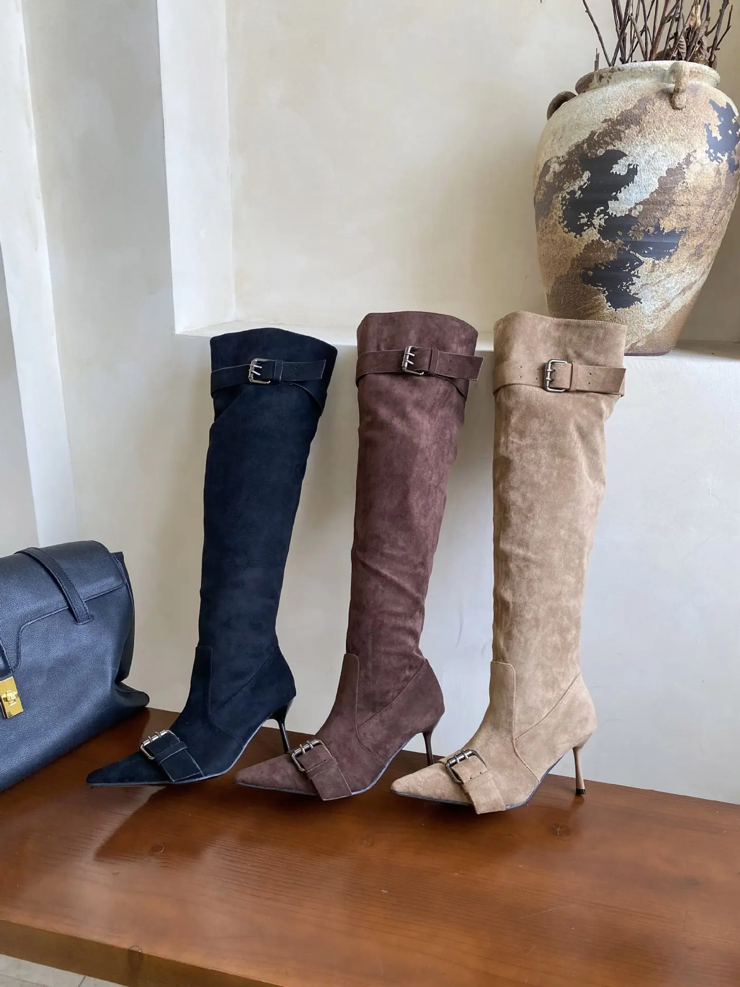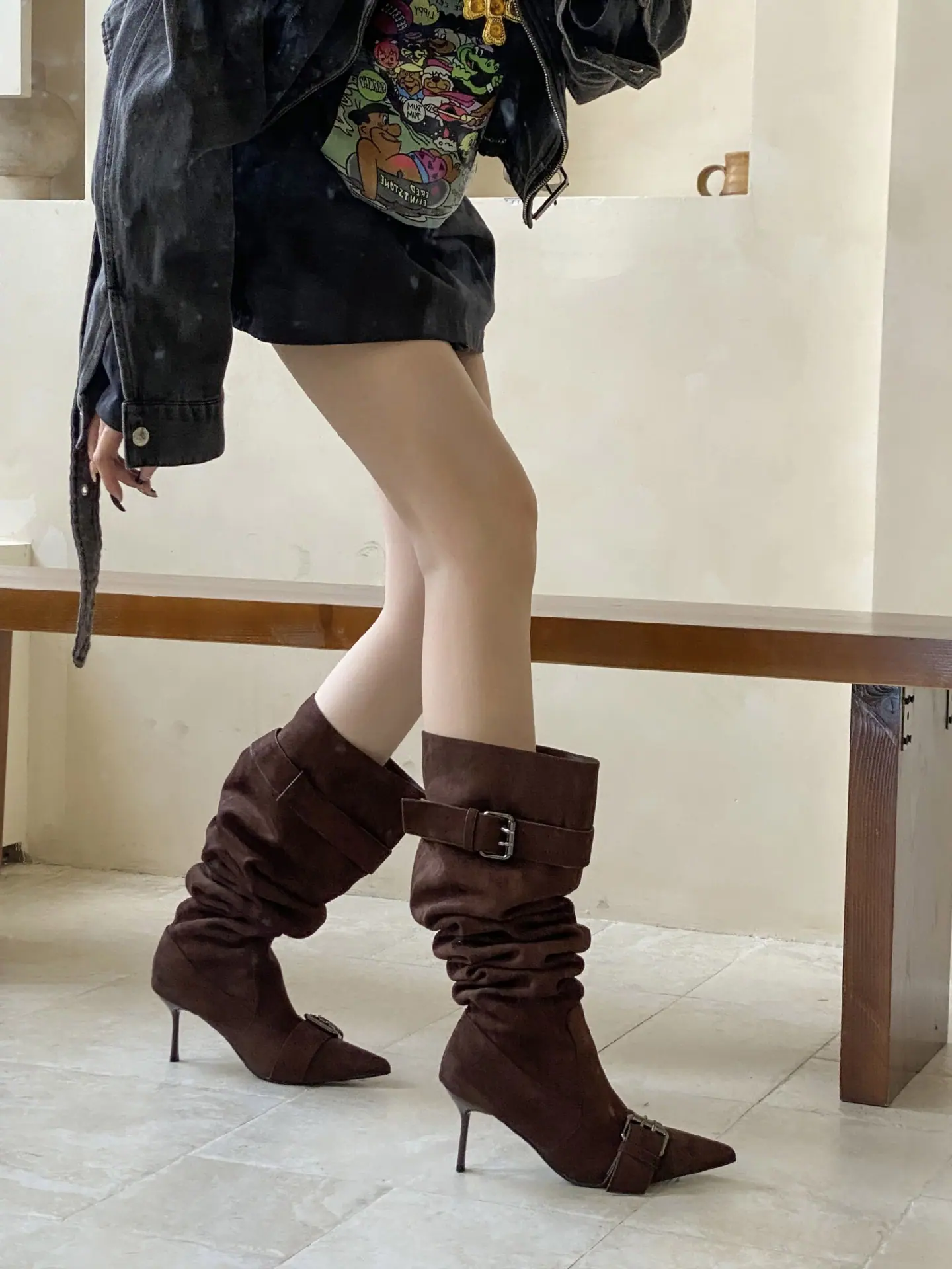 Otoño/Invierno 2025 Nuevos Europeos y Americanos Punta Afilada Tacón de Aguja Tacón Alto Temperamento Moda Francesa Sexy Hebilla Apiladas Botas Largas