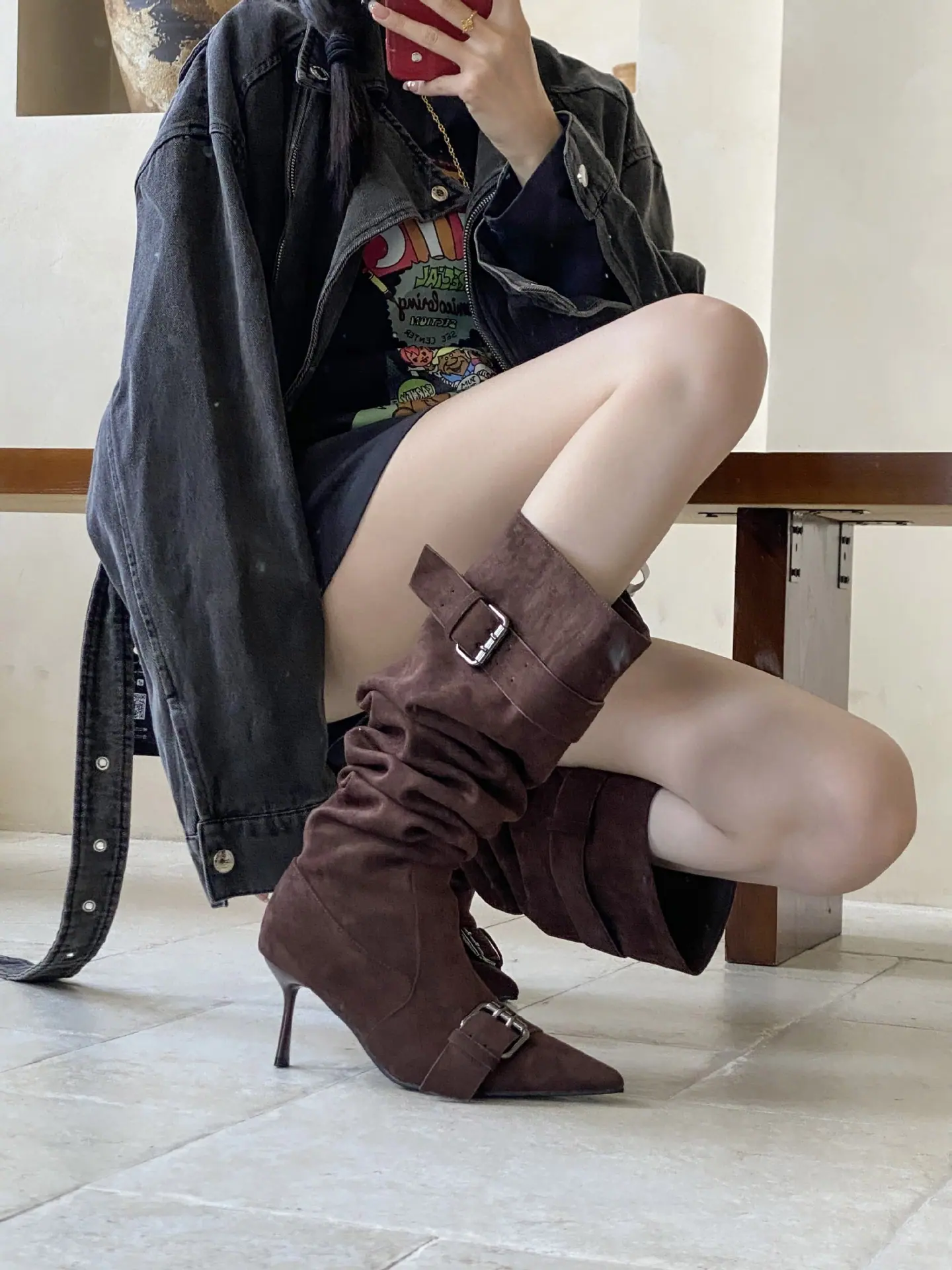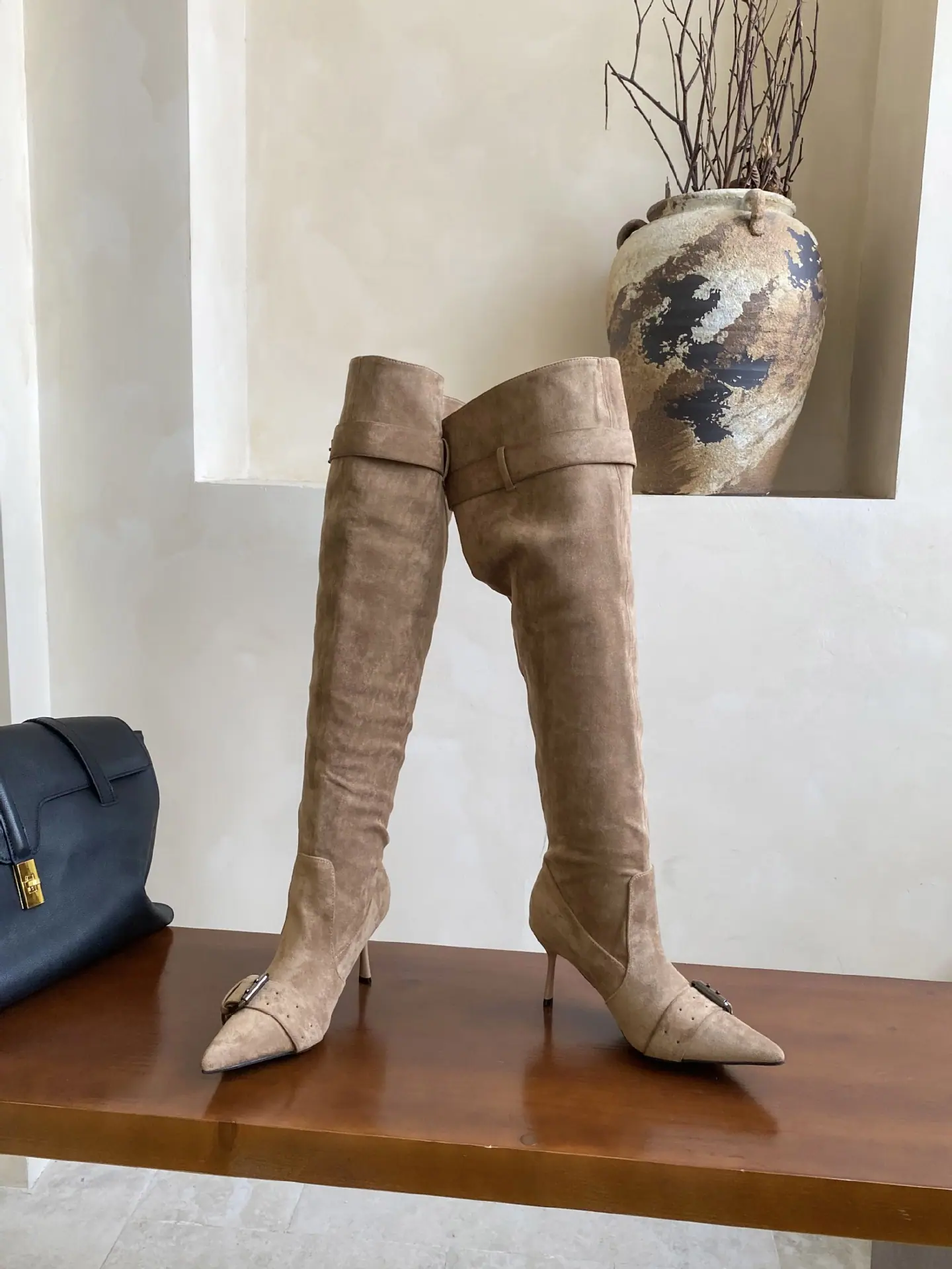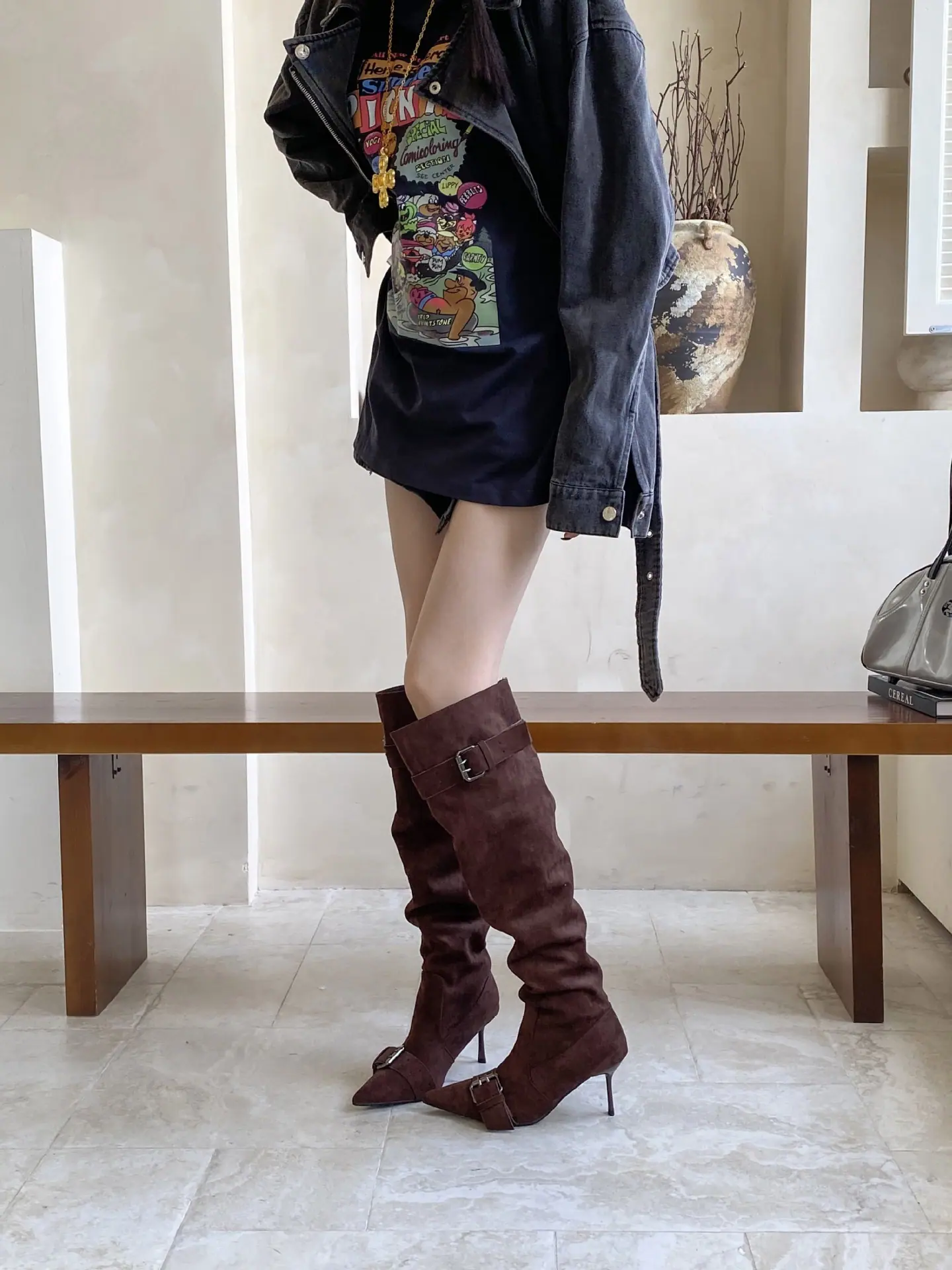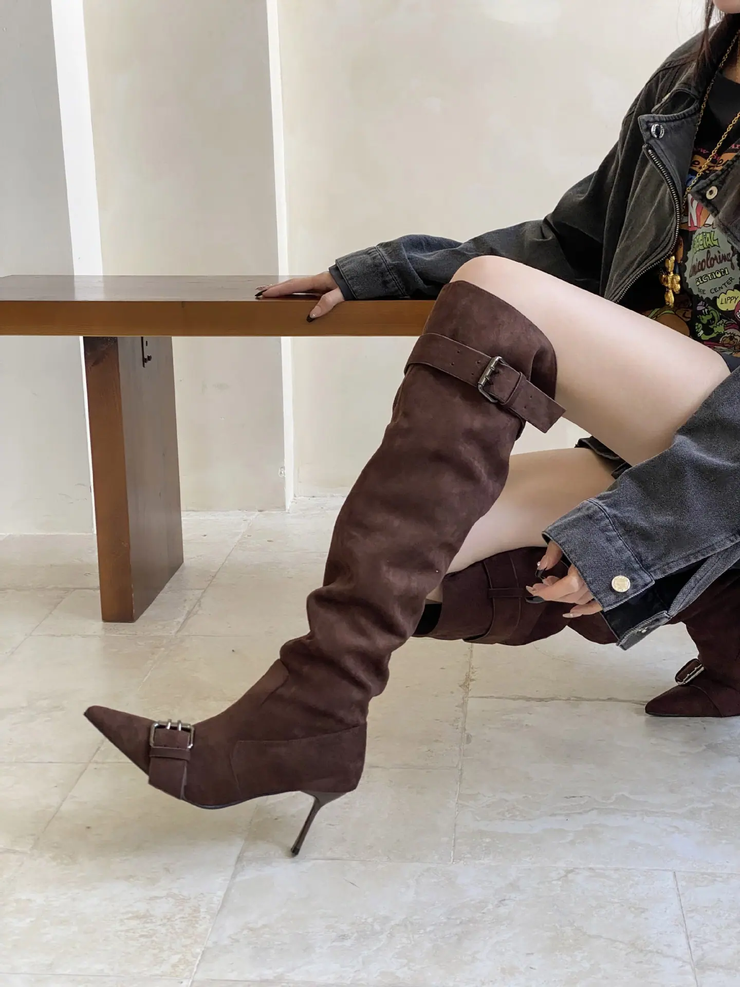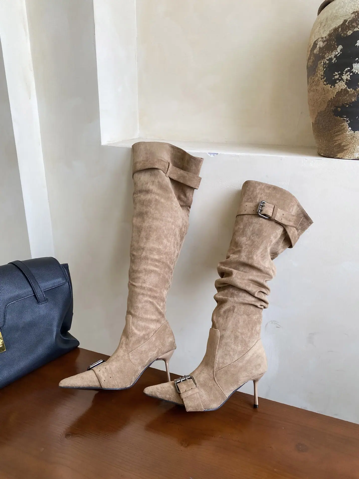 Otoño/Invierno 2025 Nuevos Europeos y Americanos Punta Afilada Tacón de Aguja Tacón Alto Temperamento Moda Francesa Sexy Hebilla Apiladas Botas Largas