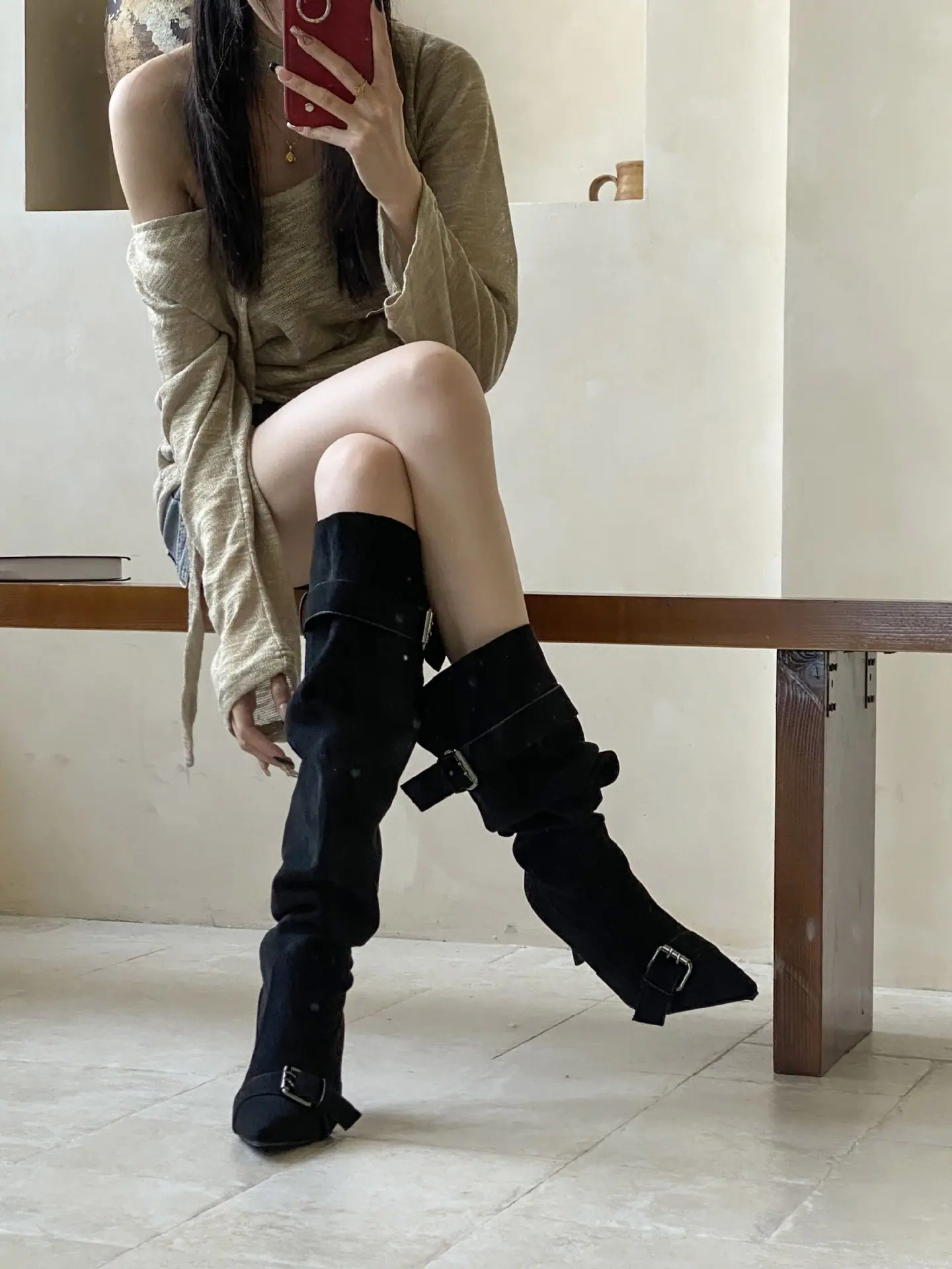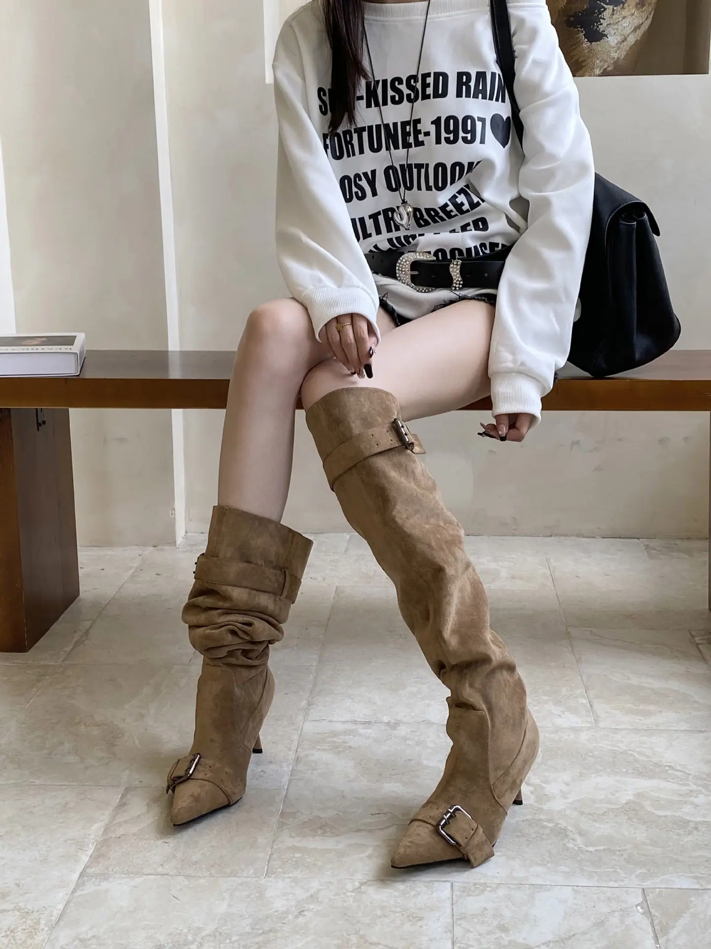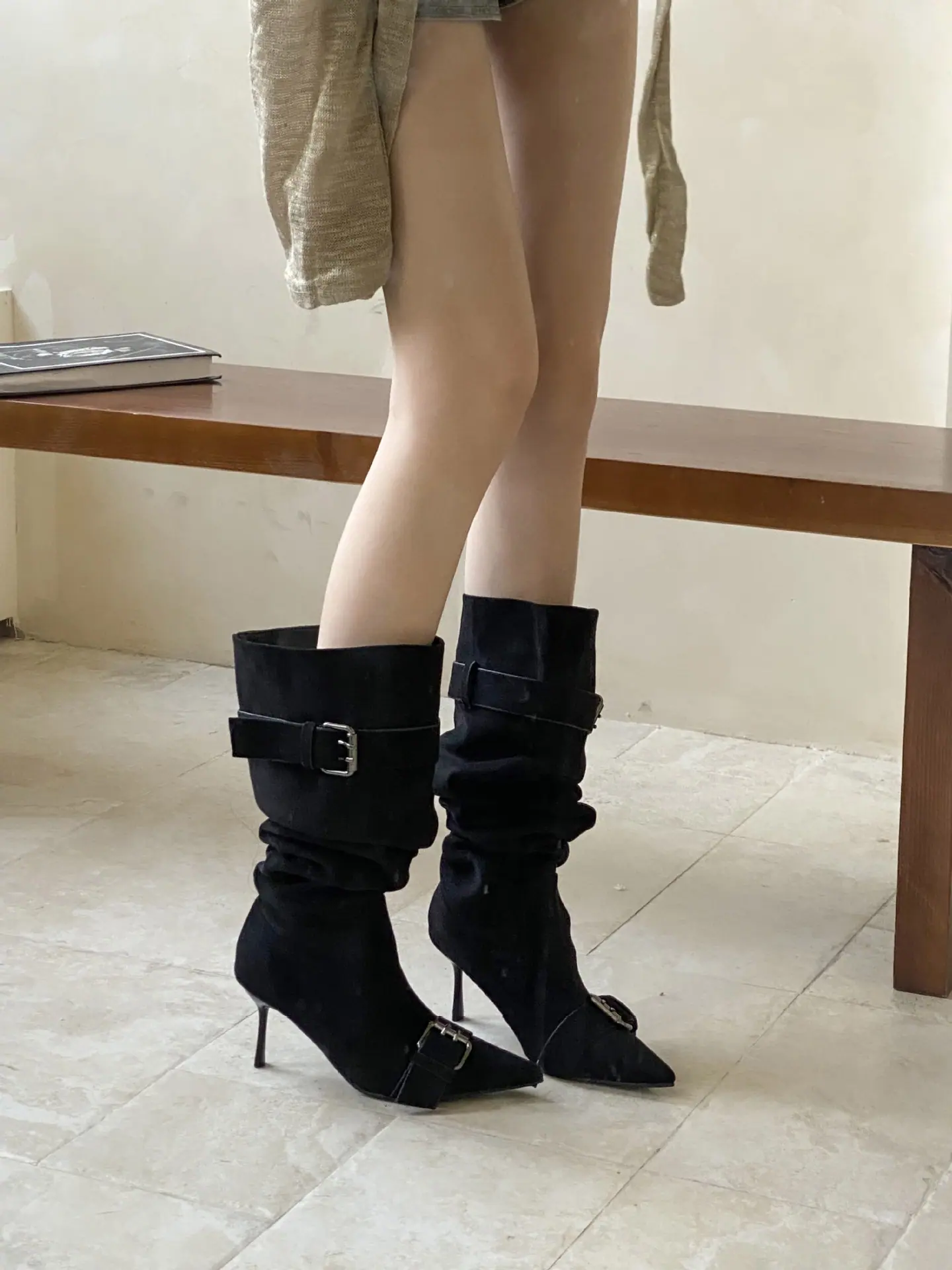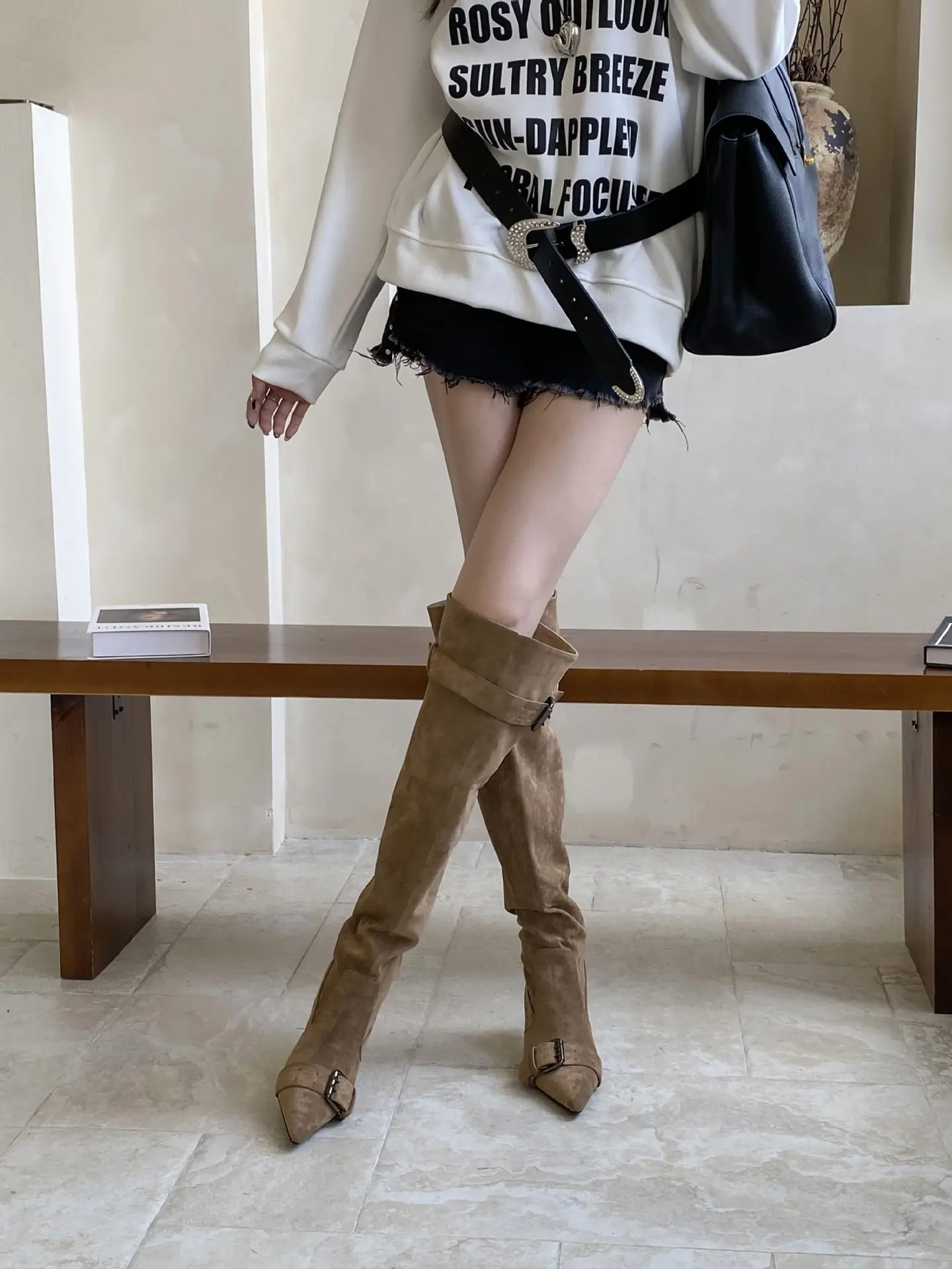 Otoño/Invierno 2025 Nuevos Europeos y Americanos Punta Afilada Tacón de Aguja Tacón Alto Temperamento Moda Francesa Sexy Hebilla Apiladas Botas Largas