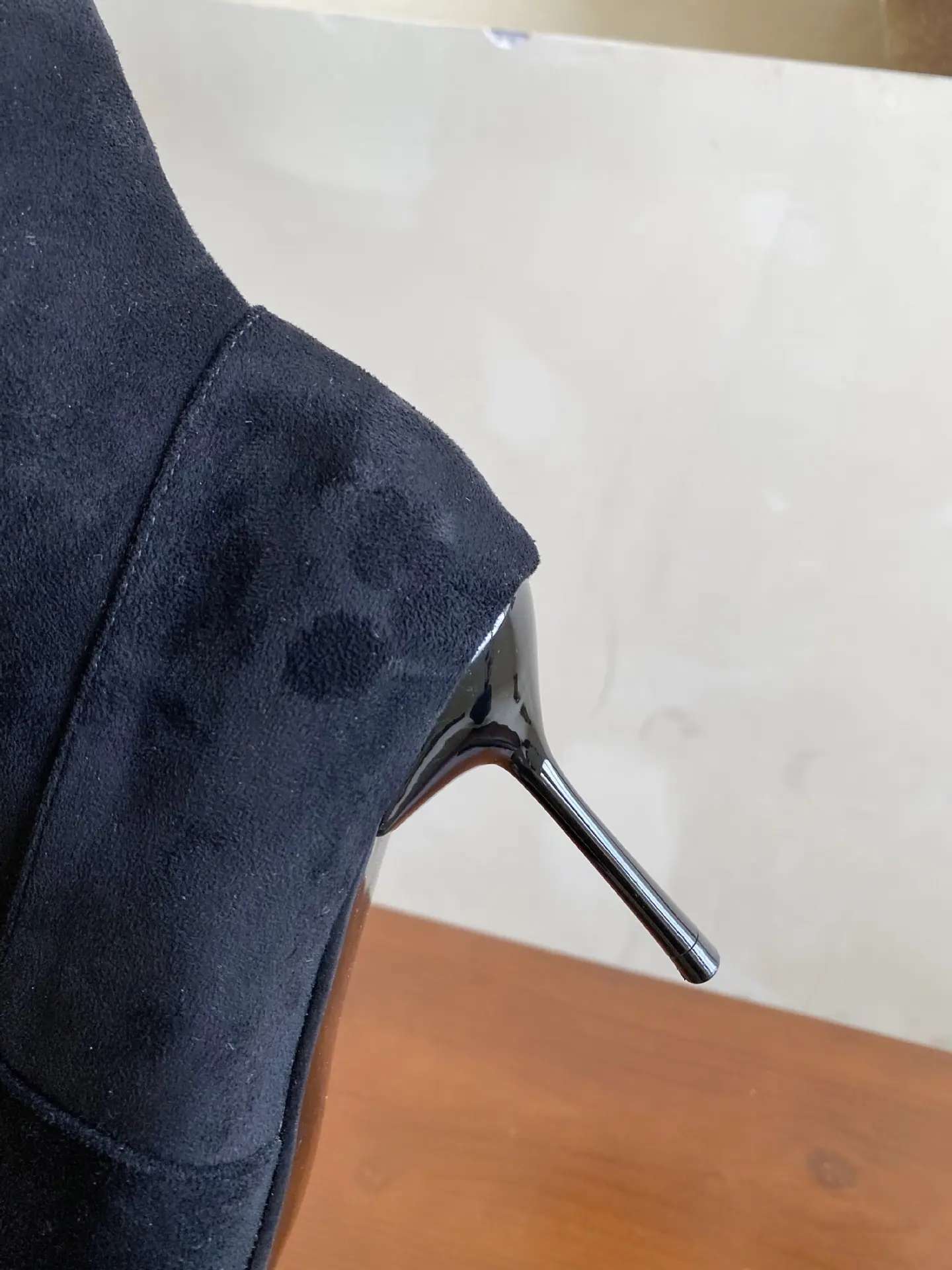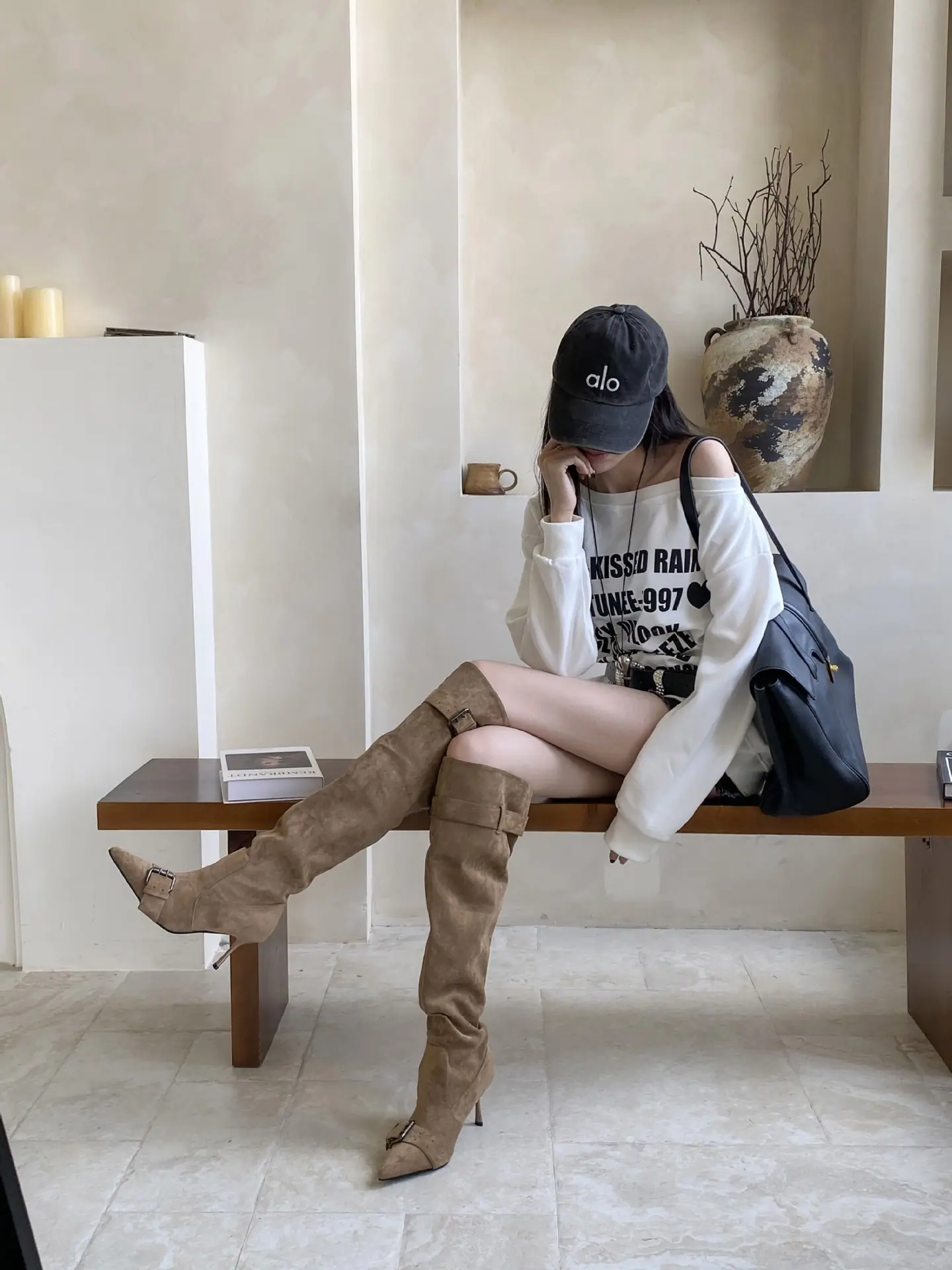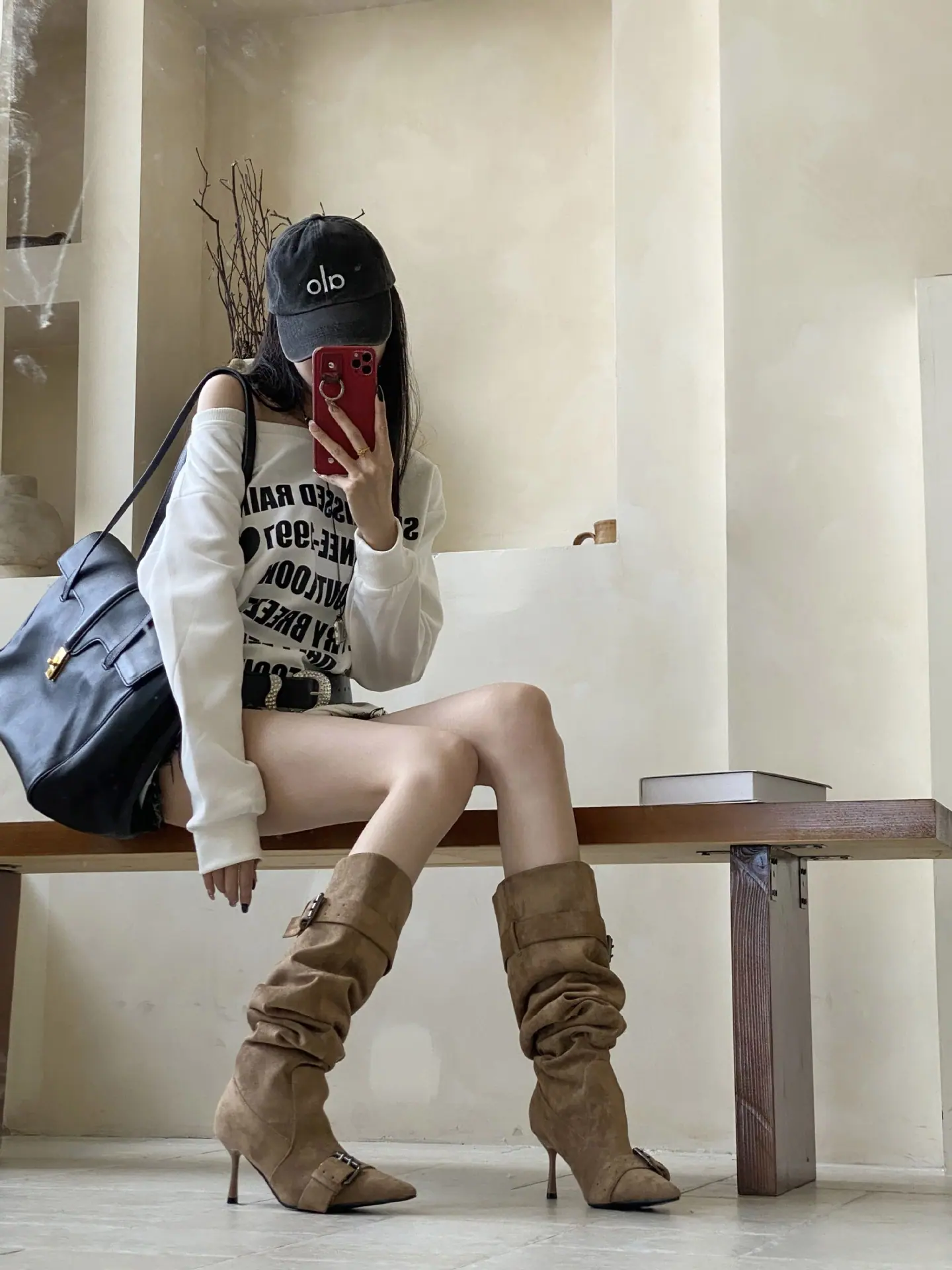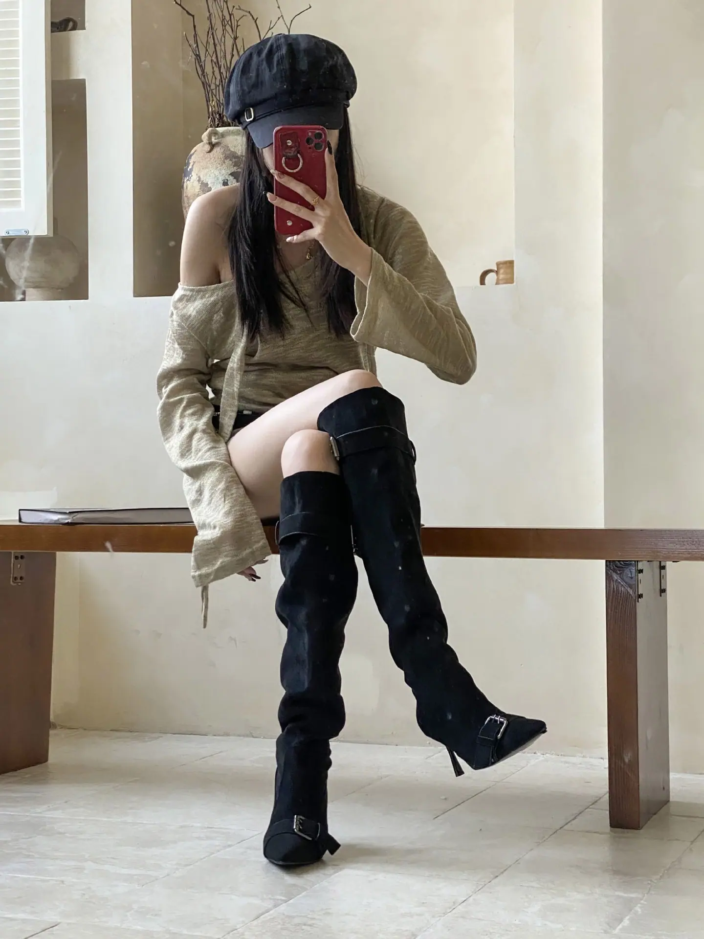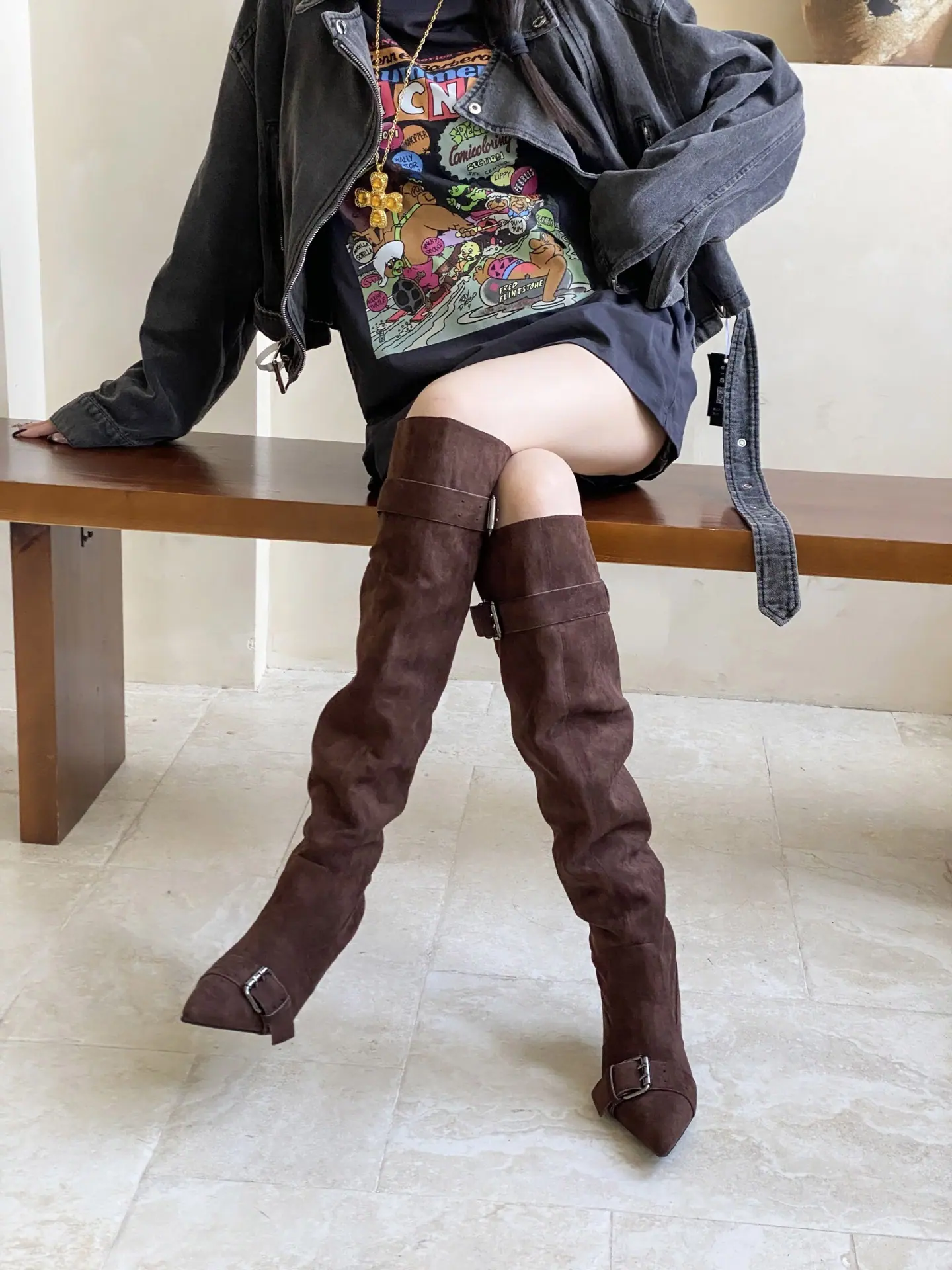 Otoño/Invierno 2025 Nuevos Europeos y Americanos Punta Afilada Tacón de Aguja Tacón Alto Temperamento Moda Francesa Sexy Hebilla Apiladas Botas Largas