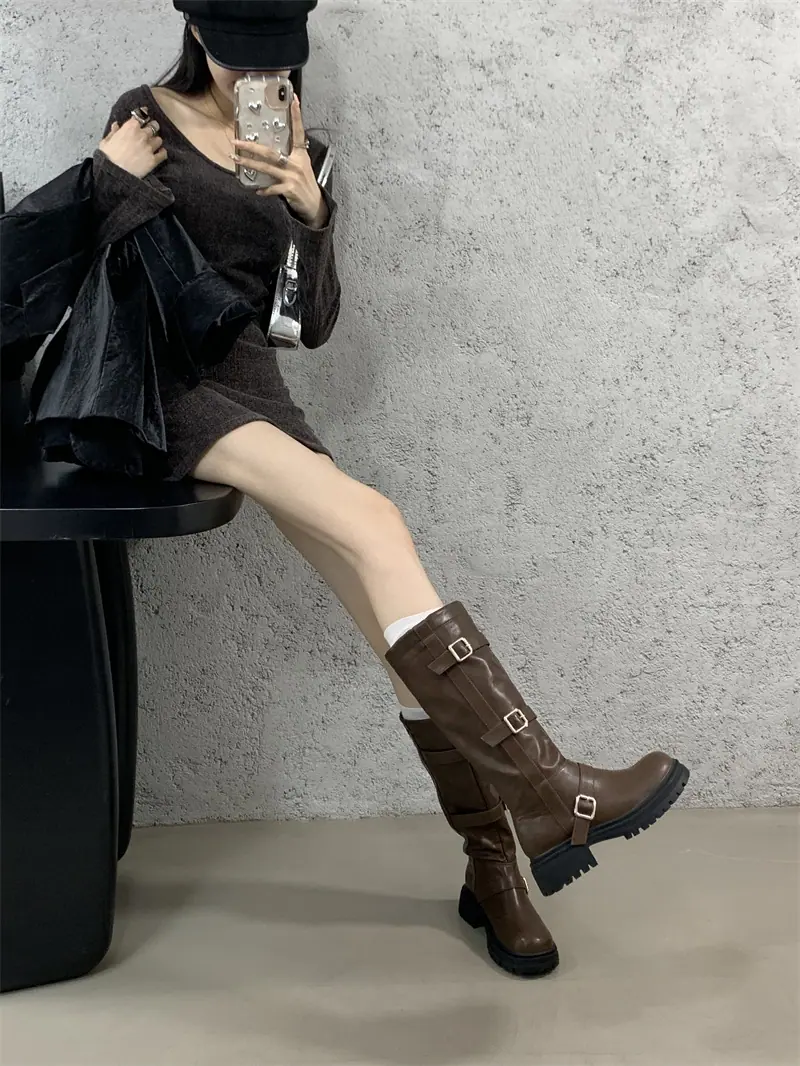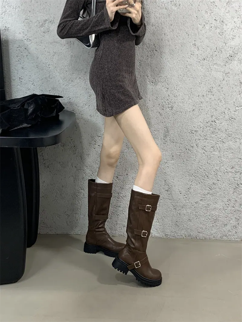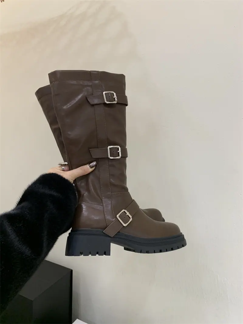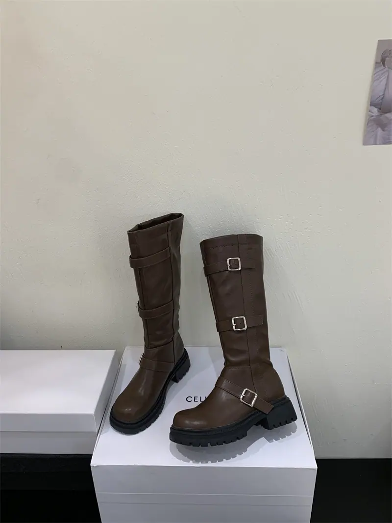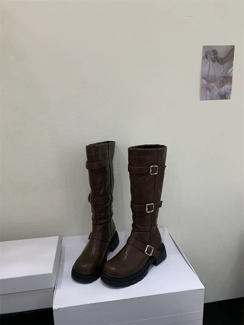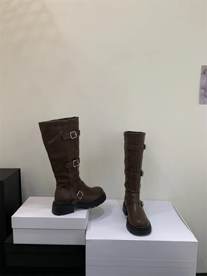 Botas marrones estilo Maillard para mujer otoño invierno suela gruesa botas altas hasta la rodilla 2025 nuevas cuero hebilla tacón grueso caña alta botas de montar