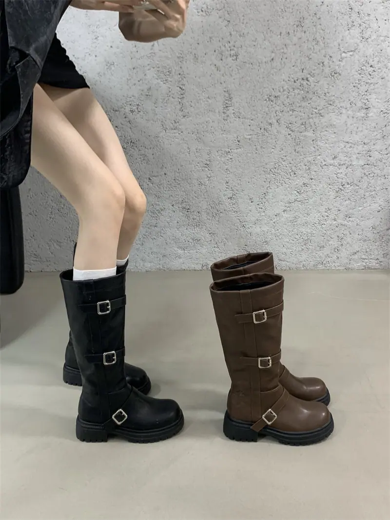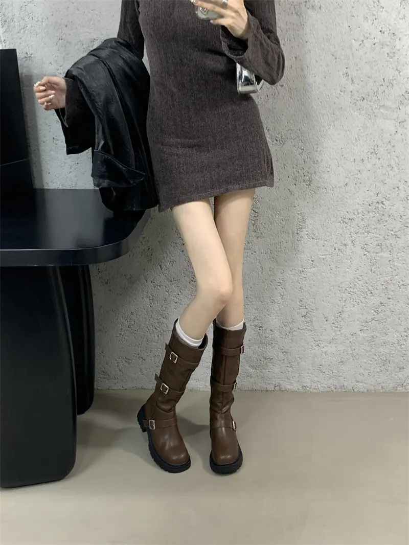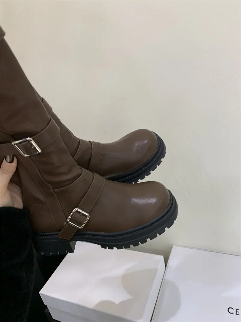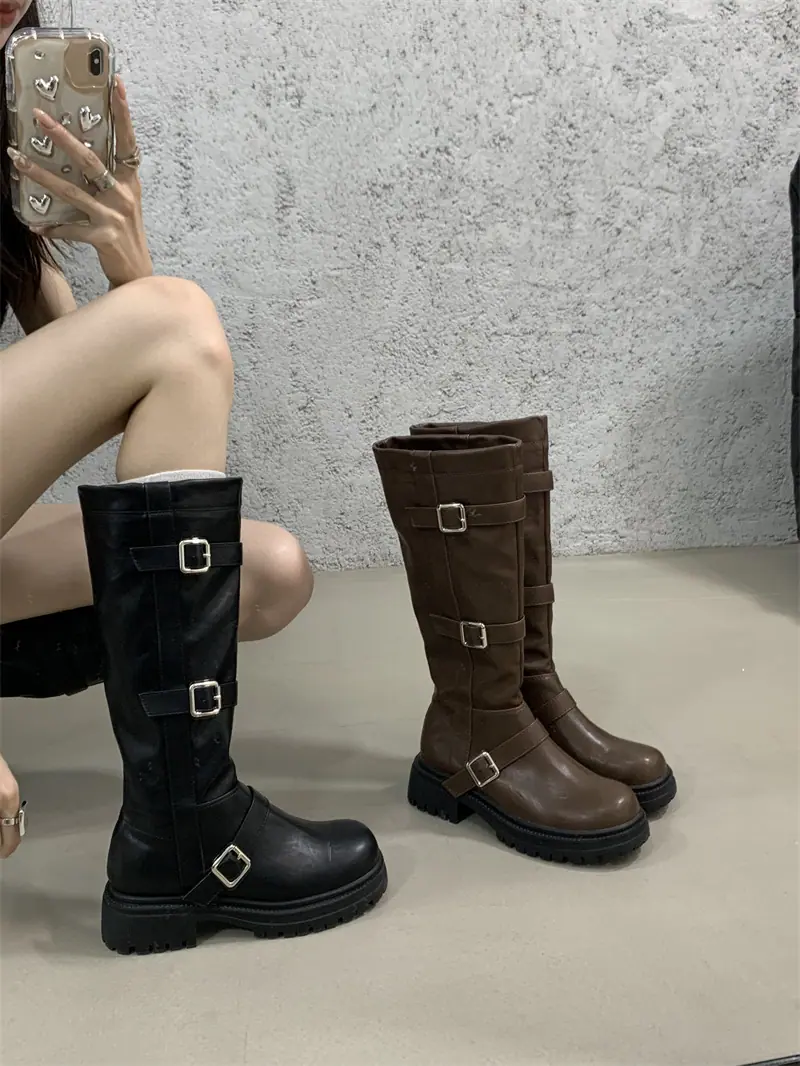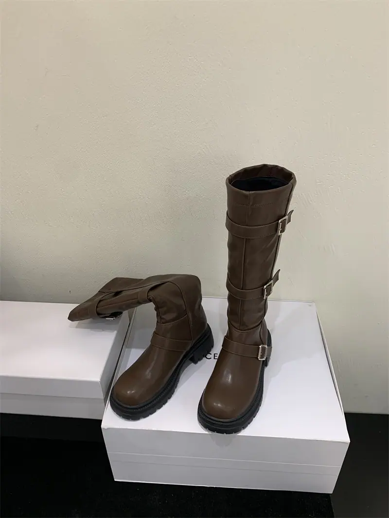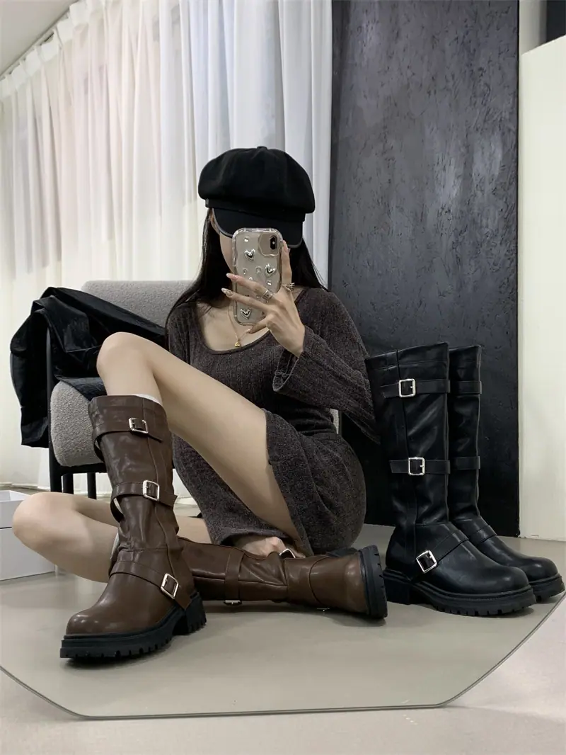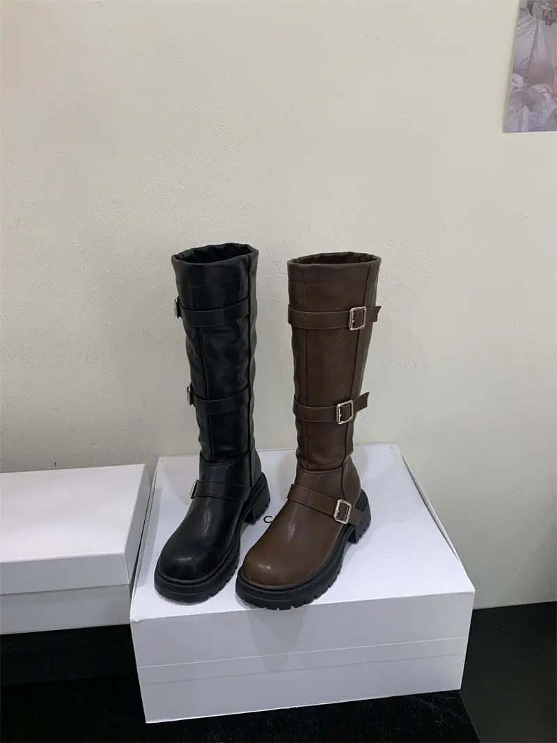 Botas marrones estilo Maillard para mujer otoño invierno suela gruesa botas altas hasta la rodilla 2025 nuevas cuero hebilla tacón grueso caña alta botas de montar