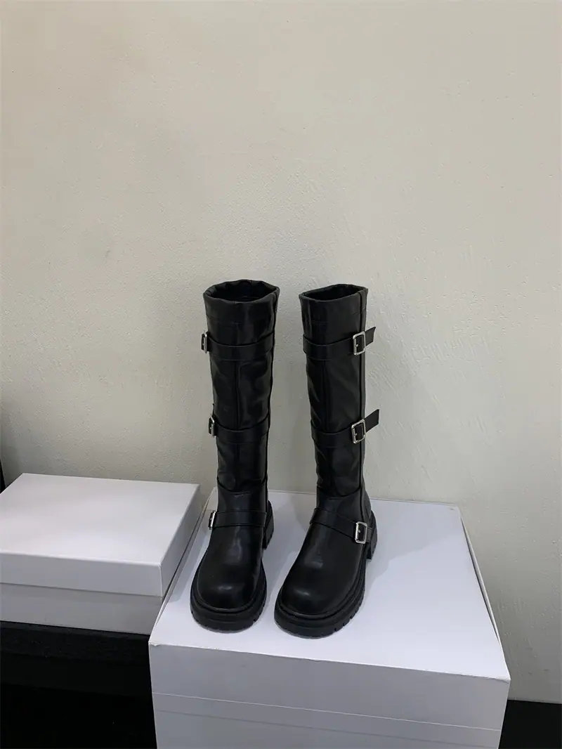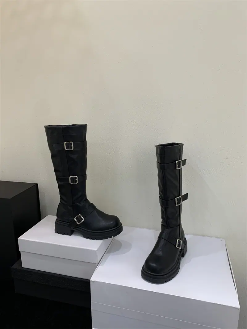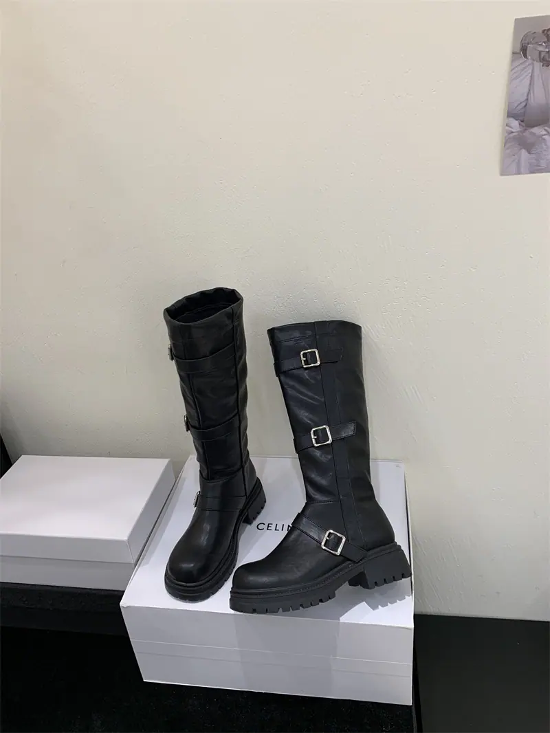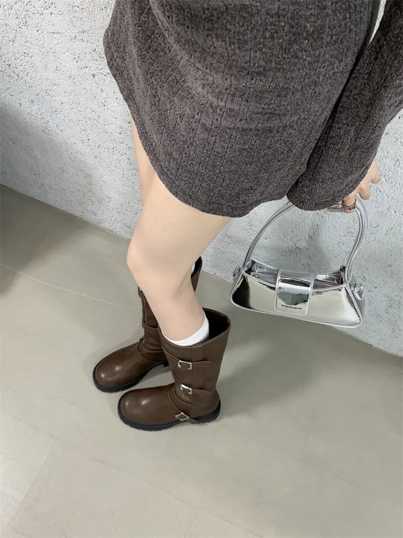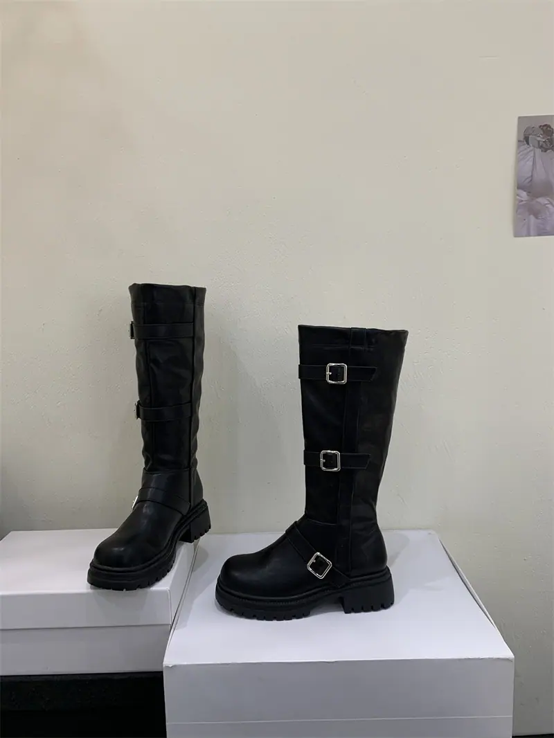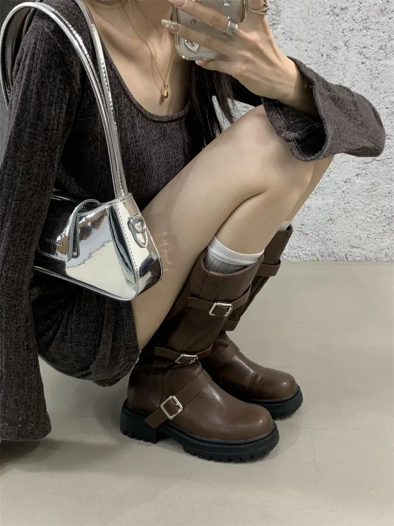 Botas marrones estilo Maillard para mujer otoño invierno suela gruesa botas altas hasta la rodilla 2025 nuevas cuero hebilla tacón grueso caña alta botas de montar