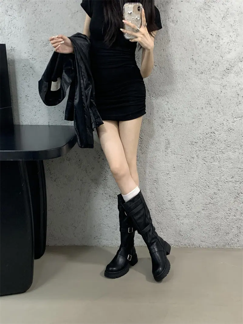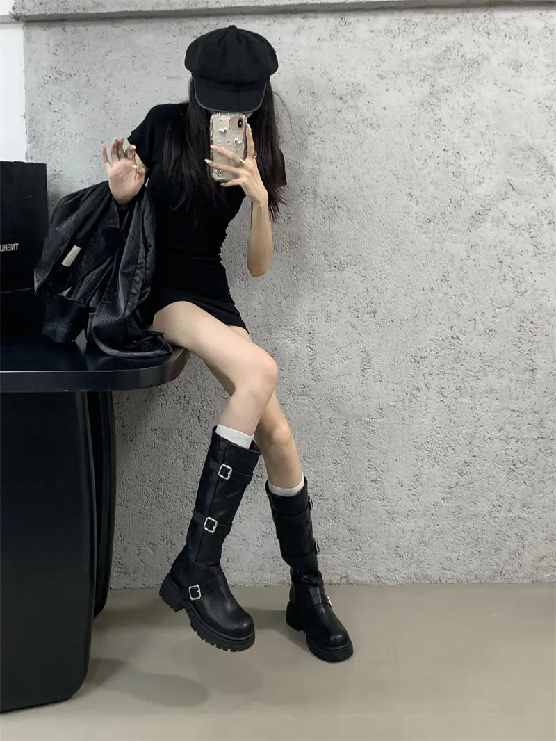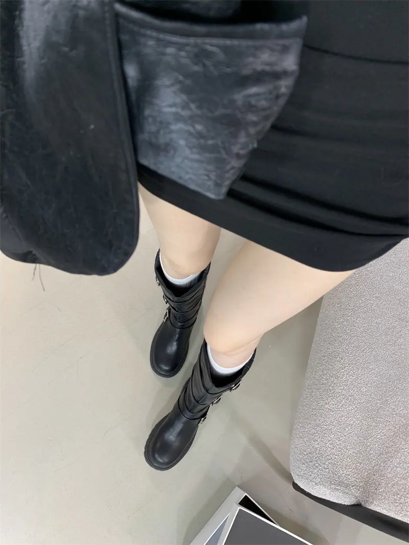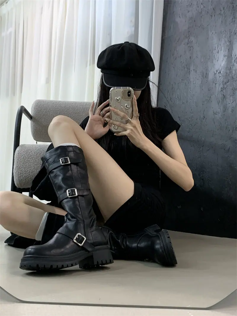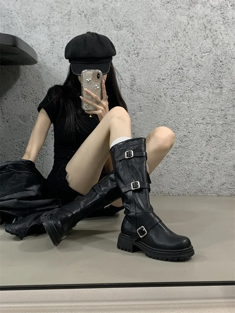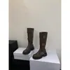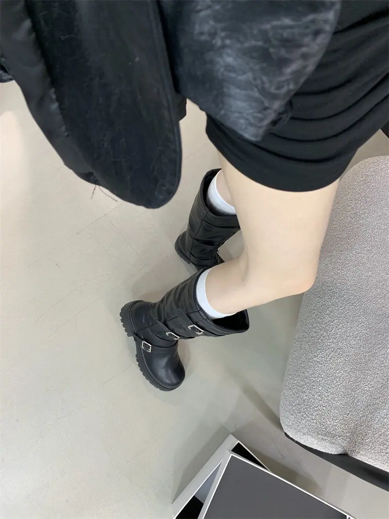 Botas marrones estilo Maillard para mujer otoño invierno suela gruesa botas altas hasta la rodilla 2025 nuevas cuero hebilla tacón grueso caña alta botas de montar