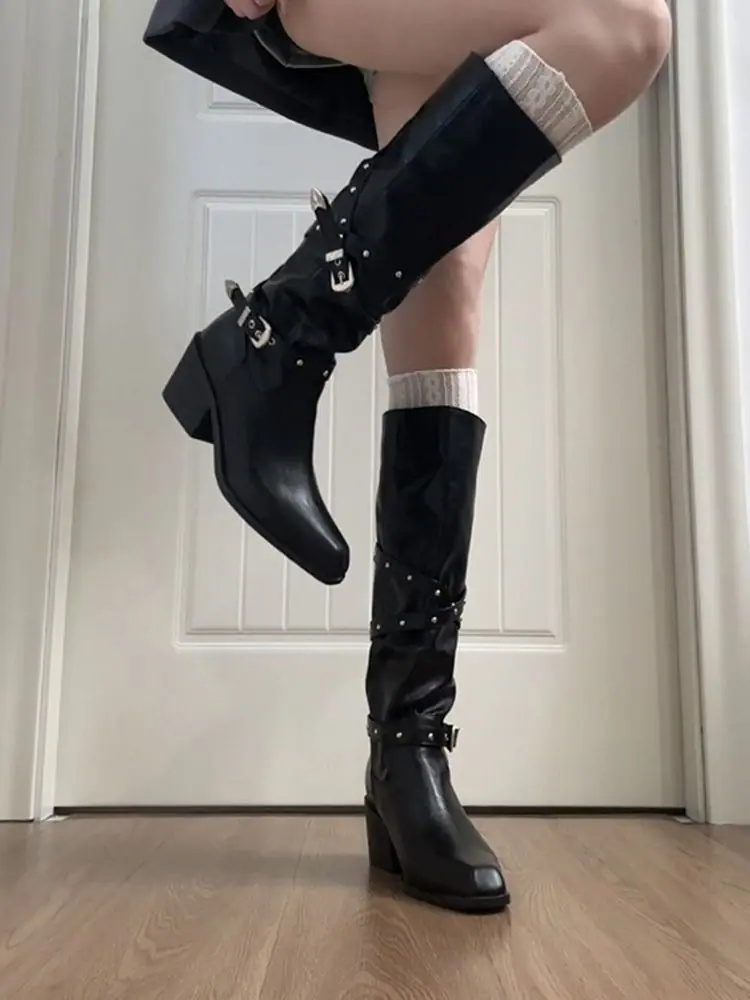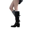 Moda Cuero Suave Tacón Grueso Remache Hebilla Botas Sobre la Rodilla Mujer Botas de Jinete Chica Caliente Botas Altas Botas Vaqueras del Oeste Nuevo