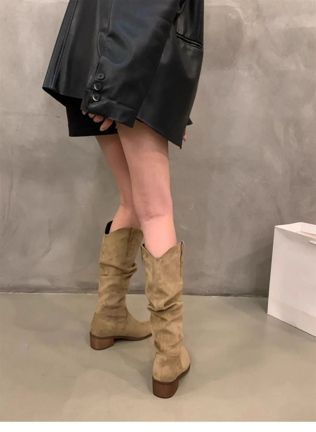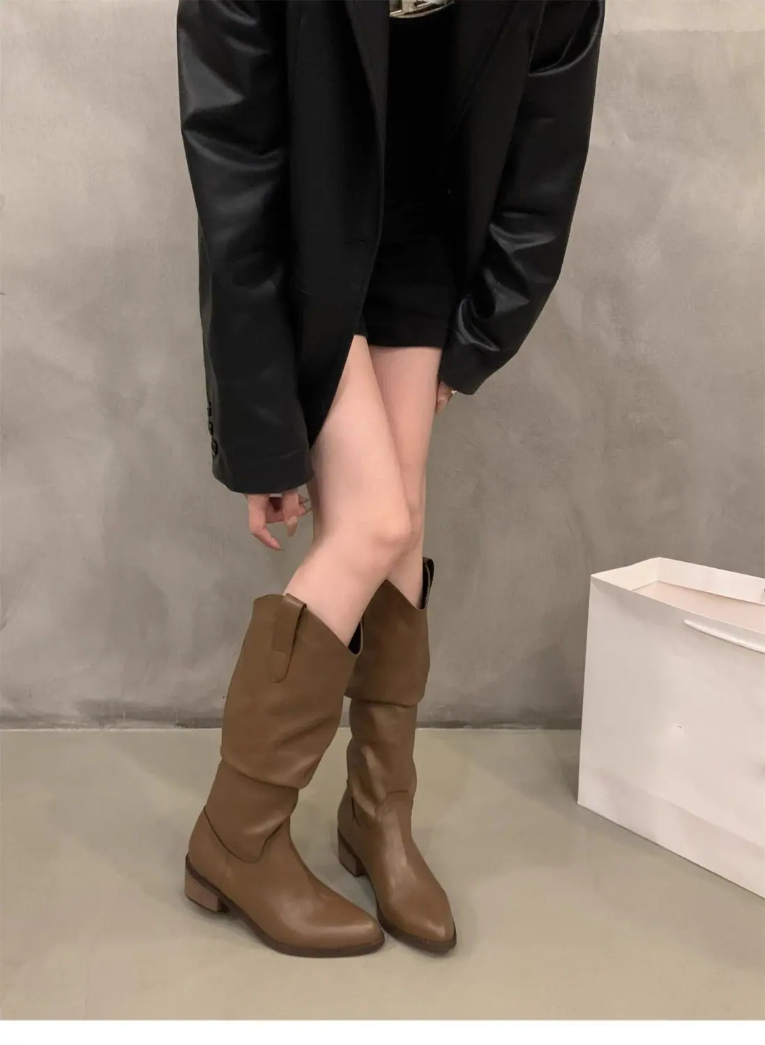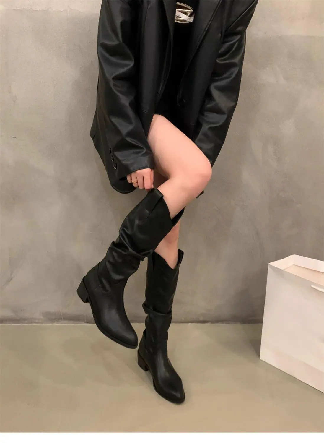 Botas de Caballero Altas hasta la Rodilla Apiladas Arrugadas de Tacón Grueso Zapatos de Mujer 2025 Nuevo Otoño/Invierno Occidentales Adelgazantes Botas Largas