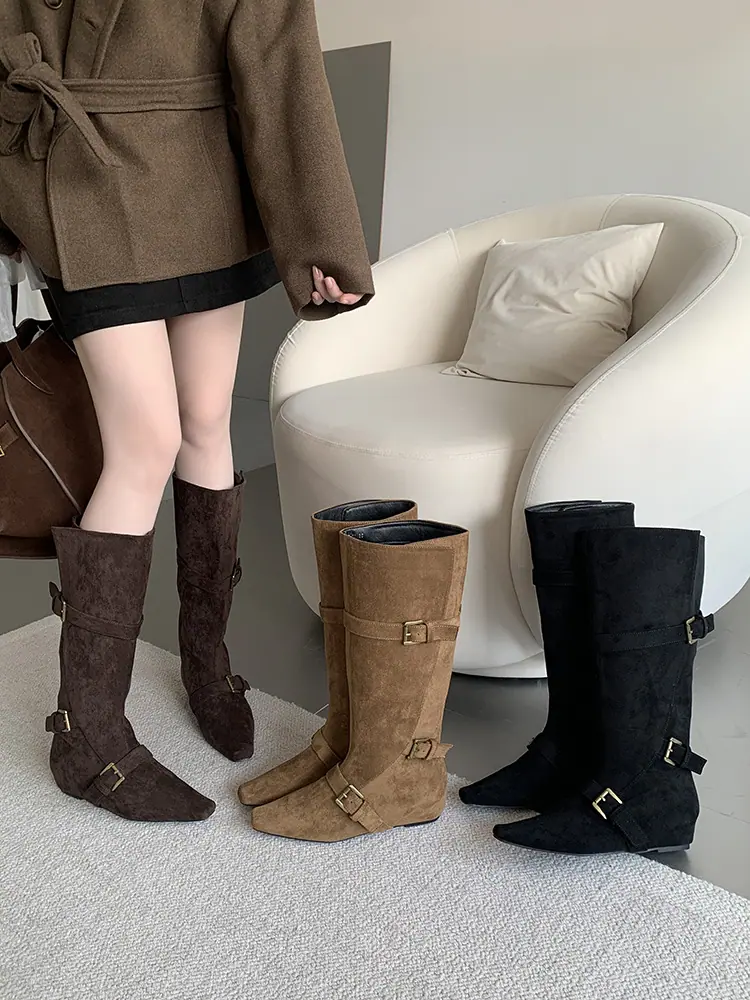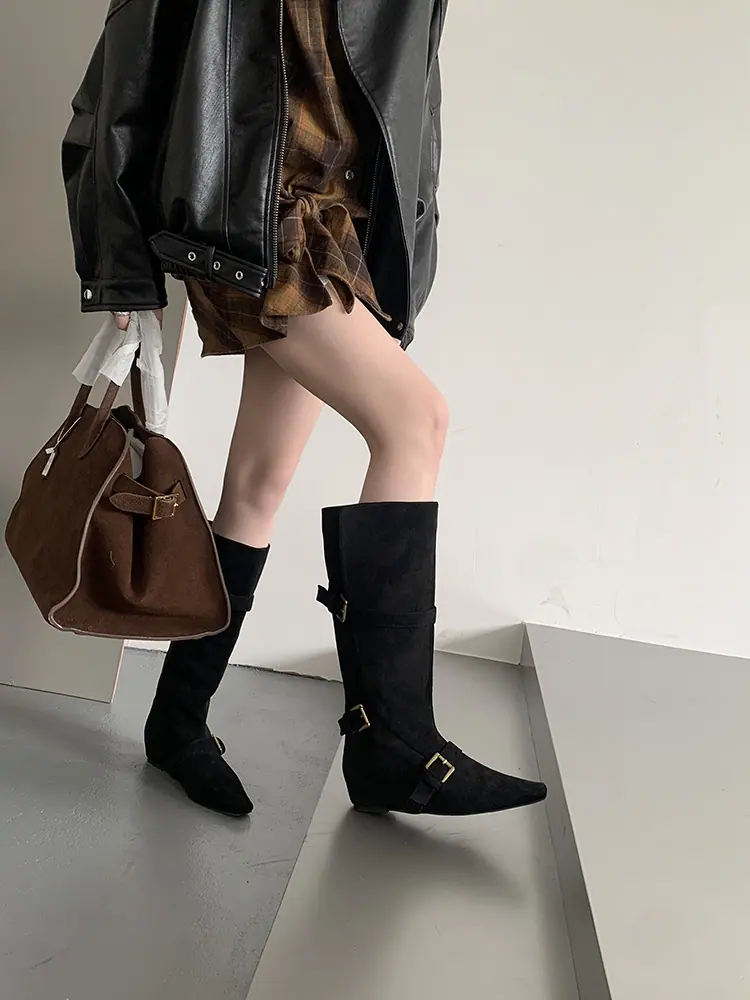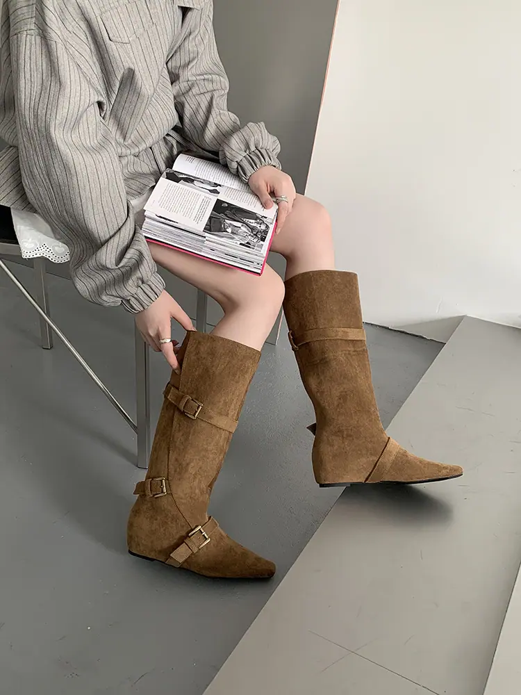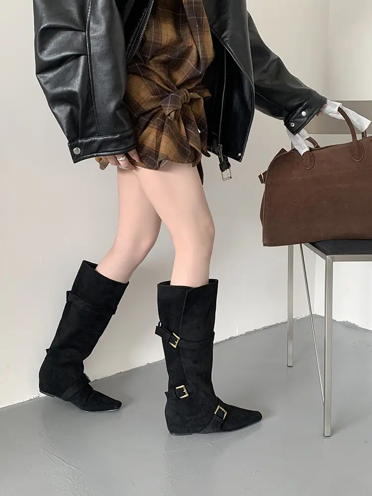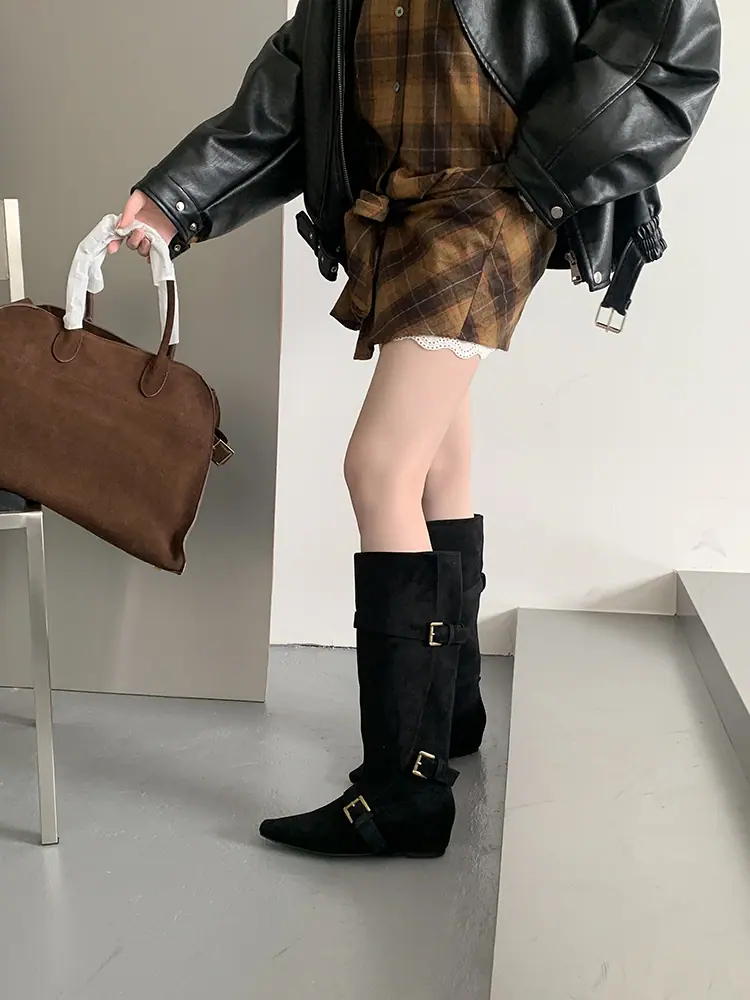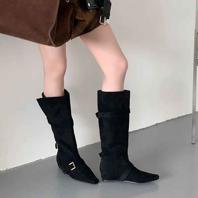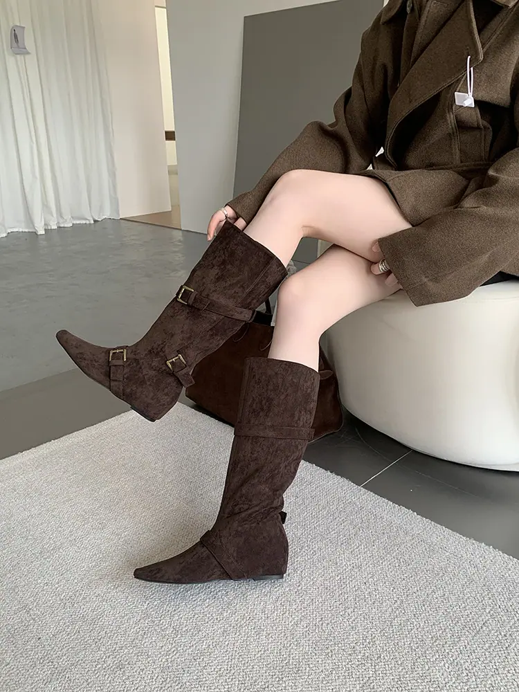 Botas Largas de Punta para Mujer 2025 Otoño/Invierno Nuevas Botas de Mujer Botas Planas Botas hasta la Rodilla Aumento de Altura Interno Botas Western Botas Ajustadas