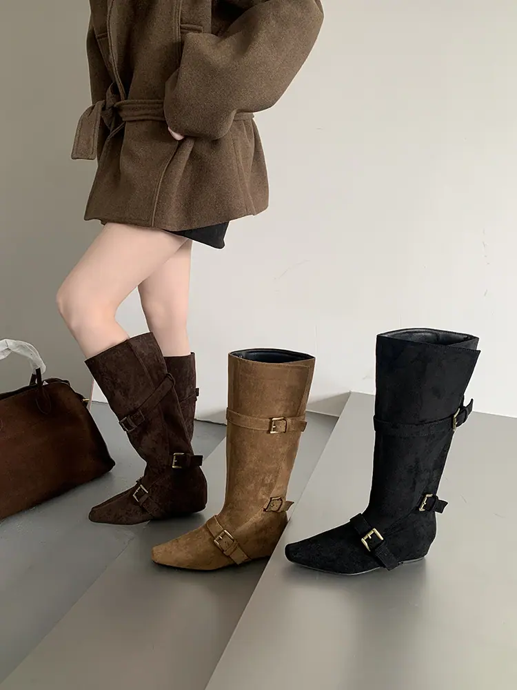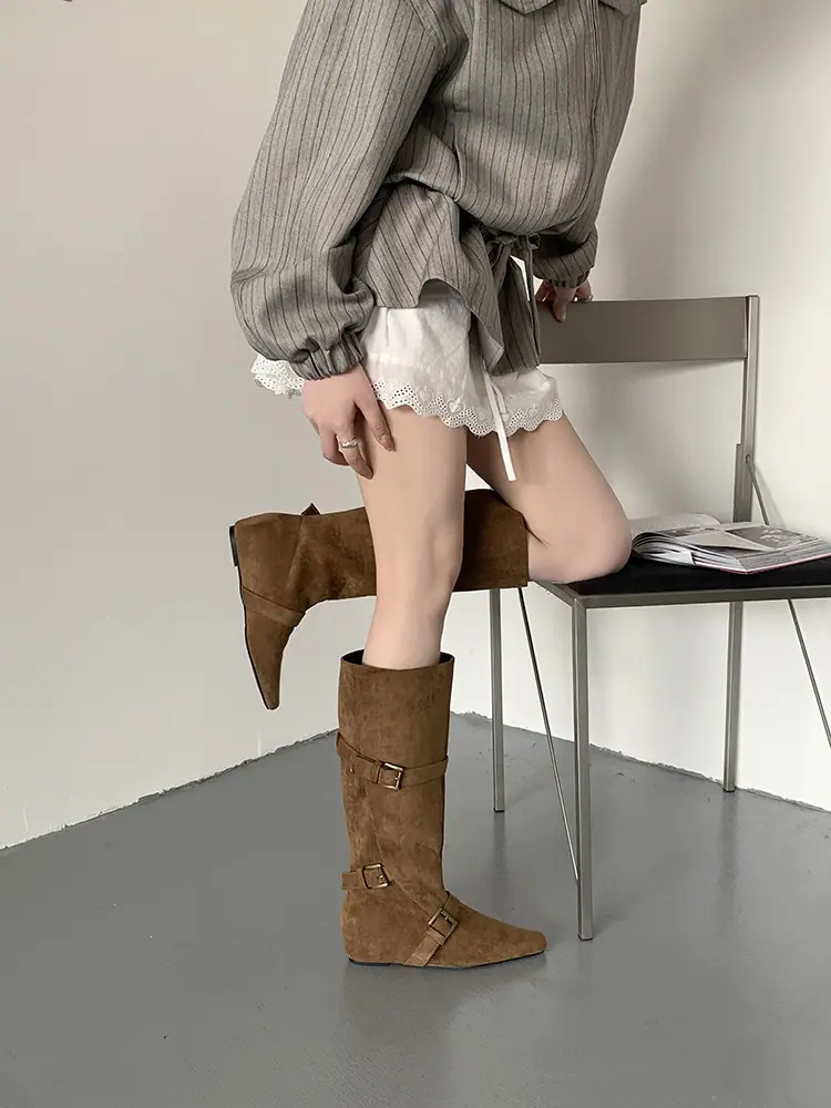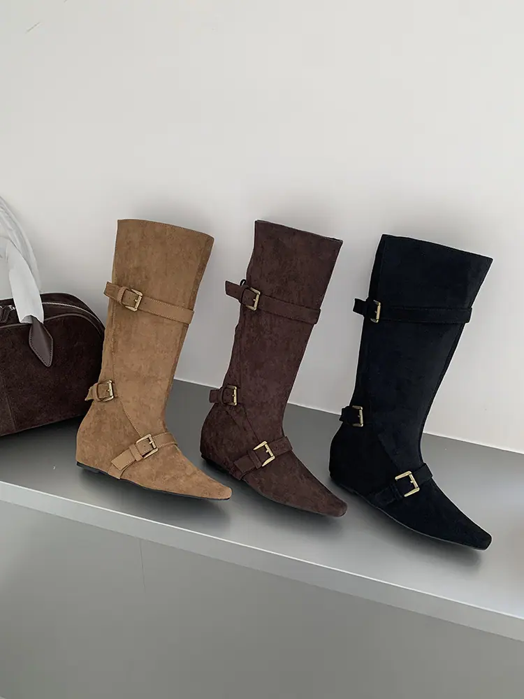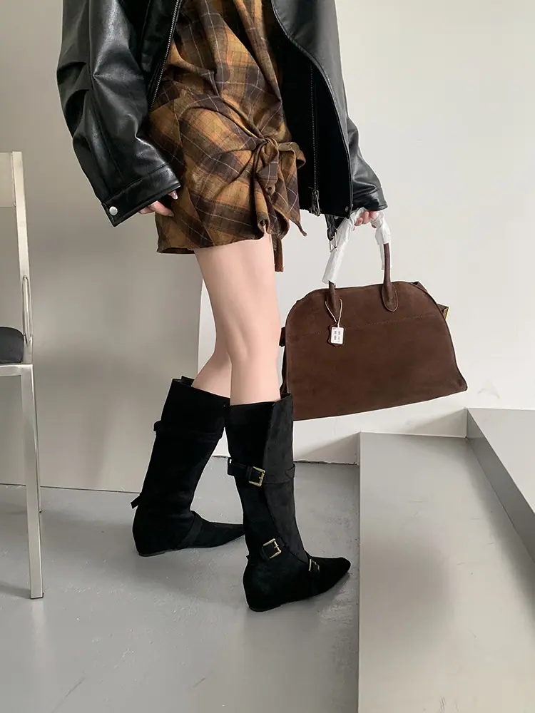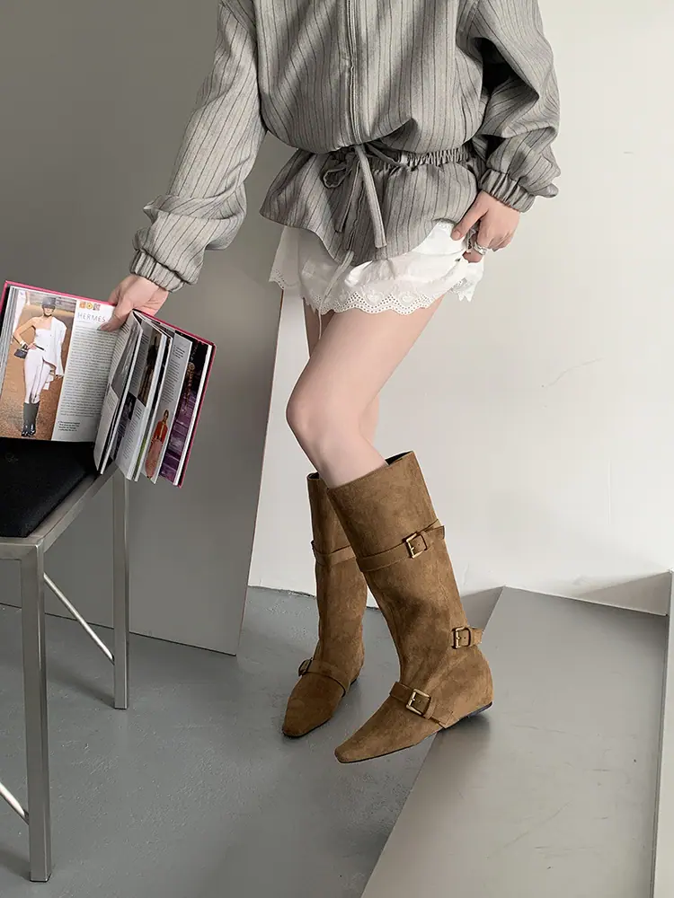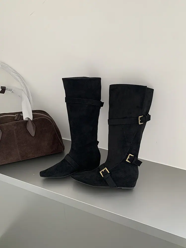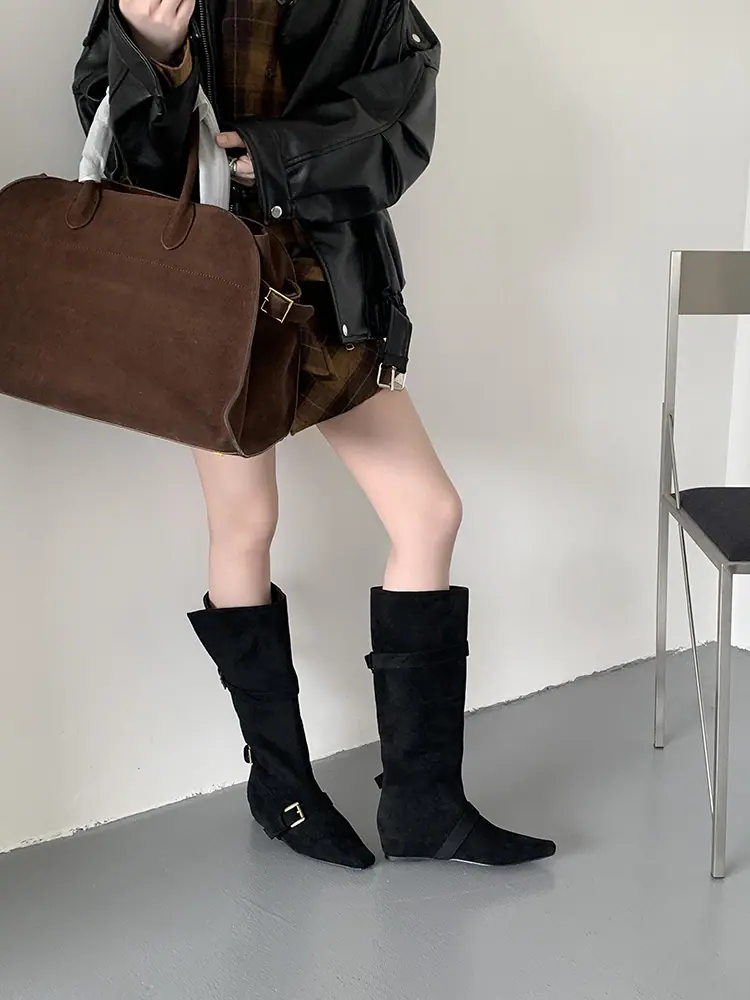 Botas Largas de Punta para Mujer 2025 Otoño/Invierno Nuevas Botas de Mujer Botas Planas Botas hasta la Rodilla Aumento de Altura Interno Botas Western Botas Ajustadas