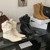 Otoño/Invierno 2025 Botines Retro Franceses de Punta Afilada con Tacón Grueso para Mujer con Hebilla de Cinturón, Fruncidos y Apilados, Botas Versátiles que Estilizan