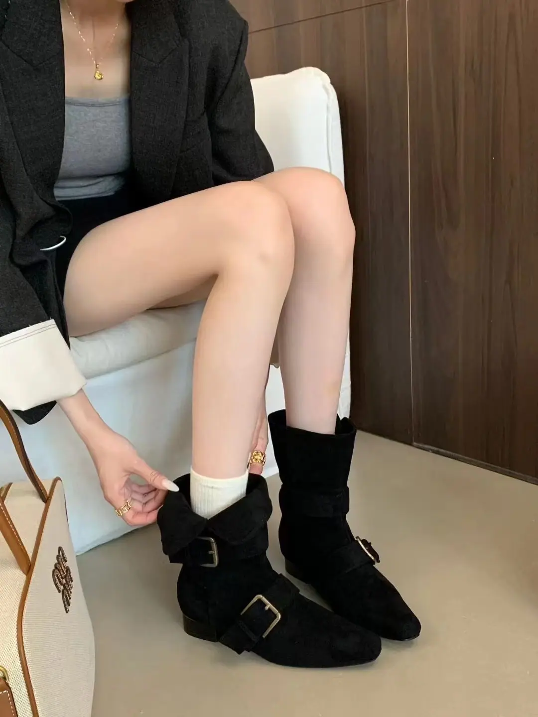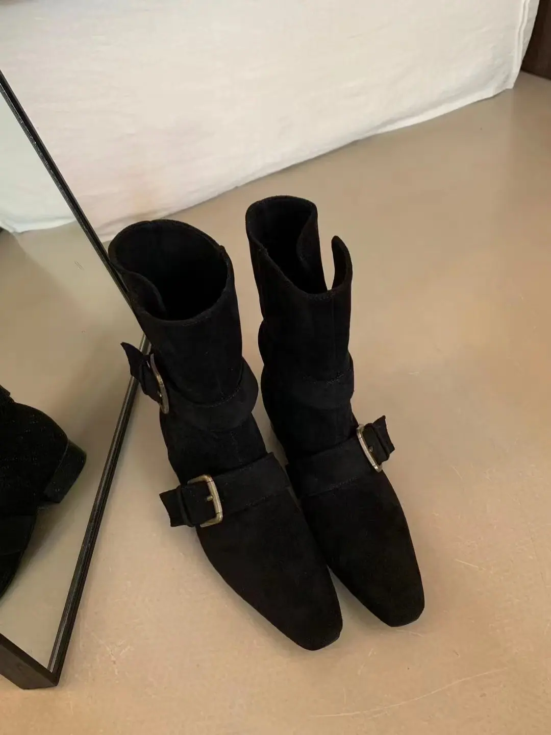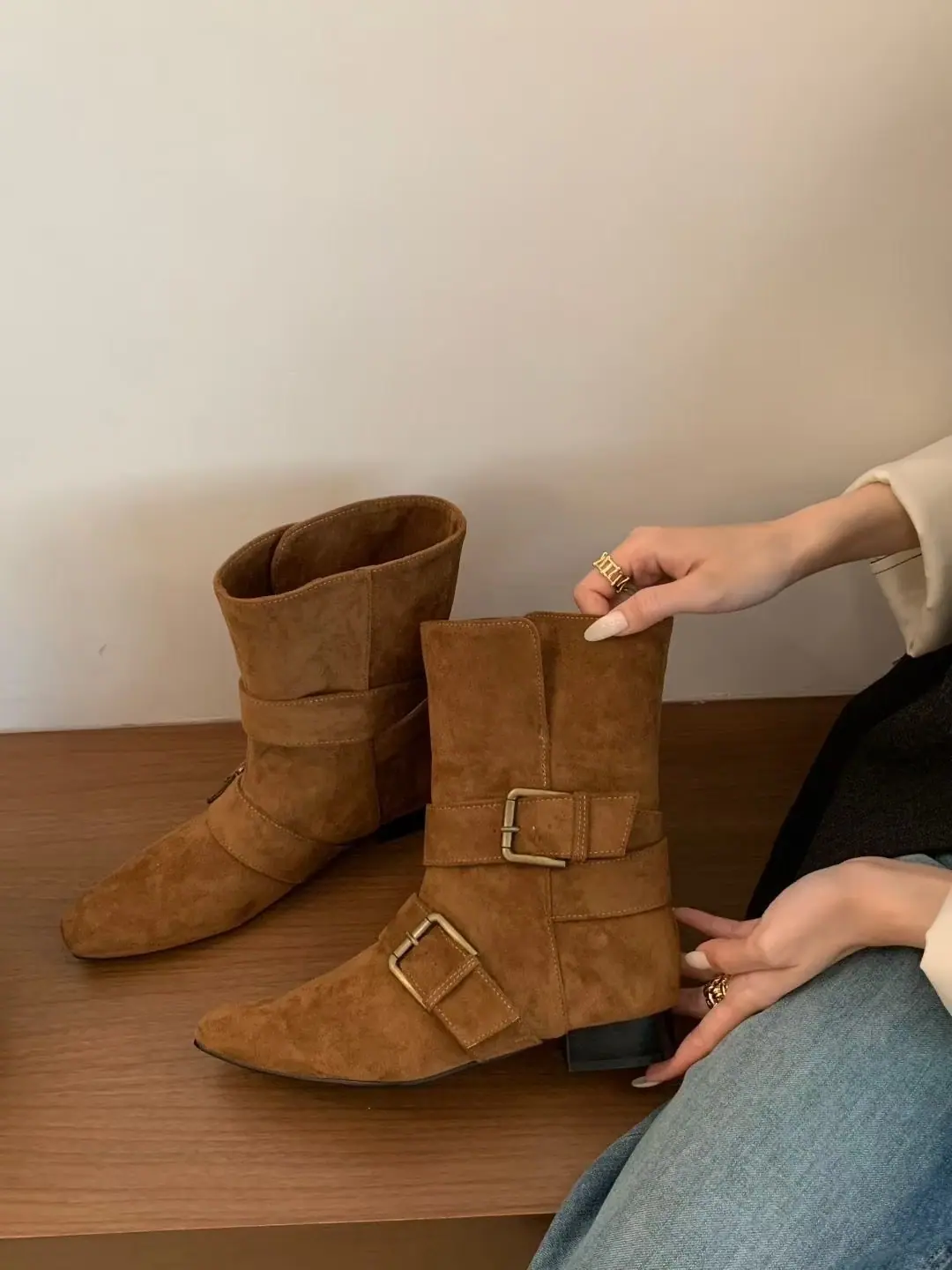Botas vaqueras 2025 nuevas botas Martin hebilla media pantorrilla dos usos botines punta afilada vintage francés tacón grueso botas de caballero