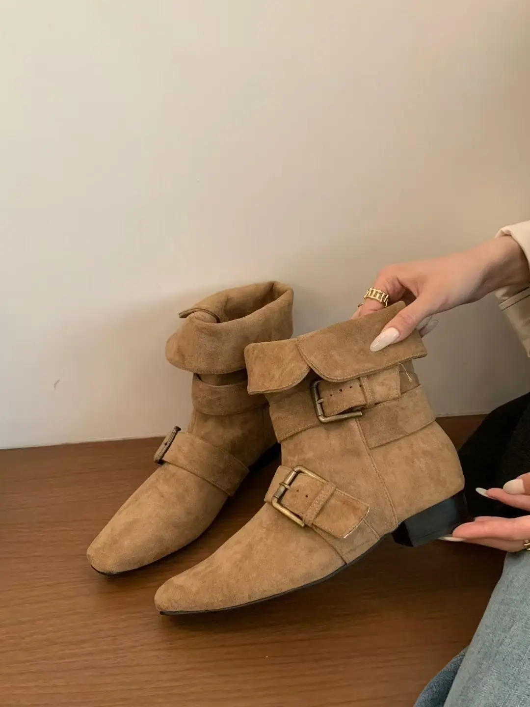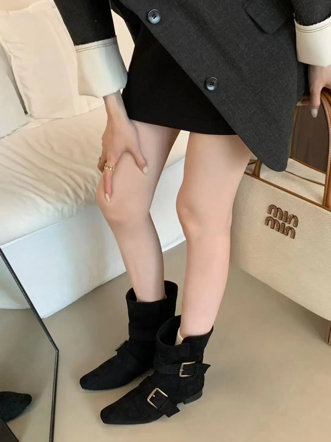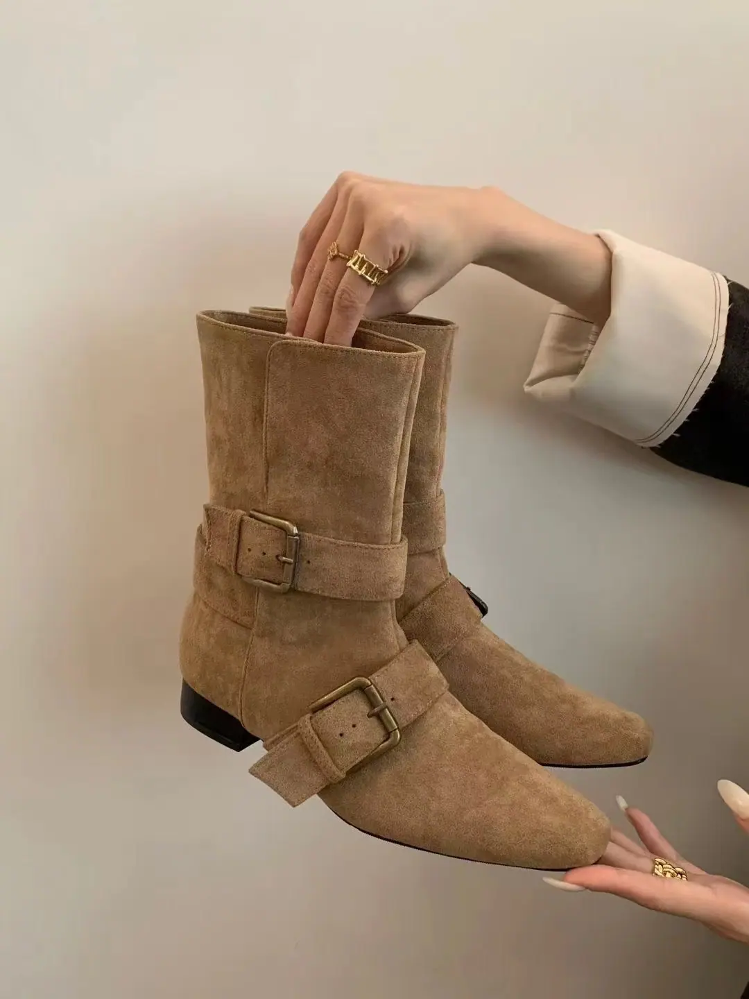 Botas vaqueras 2025 nuevas botas Martin hebilla media pantorrilla dos usos botines punta afilada vintage francés tacón grueso botas de caballero