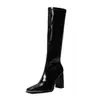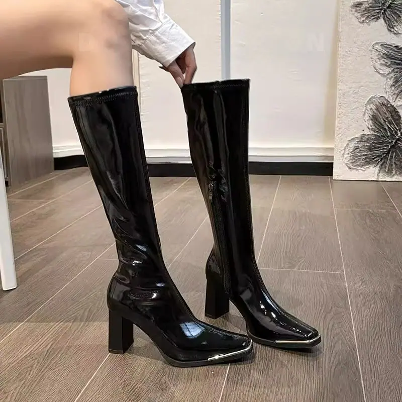 Botas elásticas de charol por encima de la rodilla para mujer, punta cuadrada pequeña, botas adelgazantes, tacón grueso, botas individuales de primavera y otoño, botas negras hasta el muslo, tacón alto