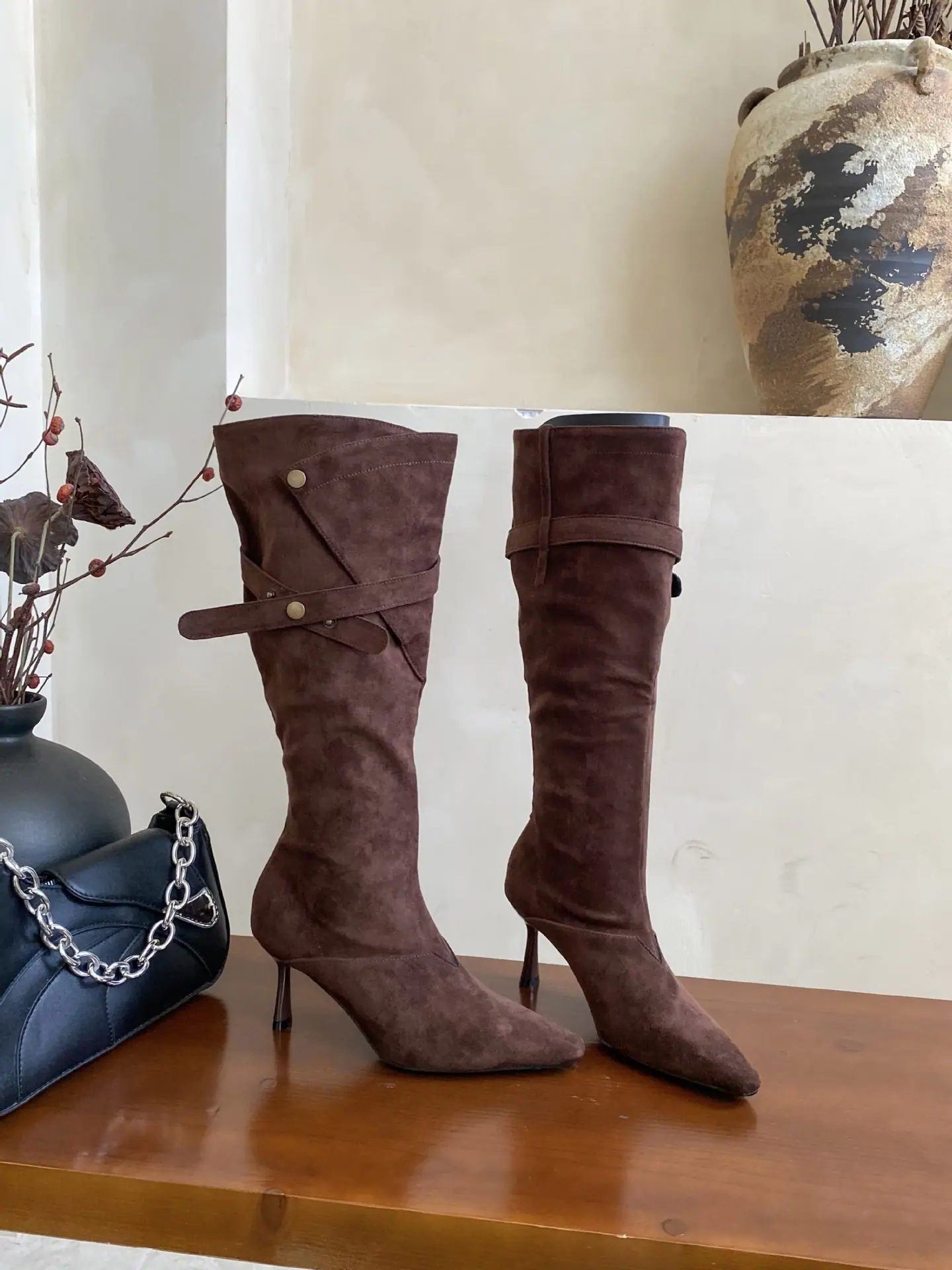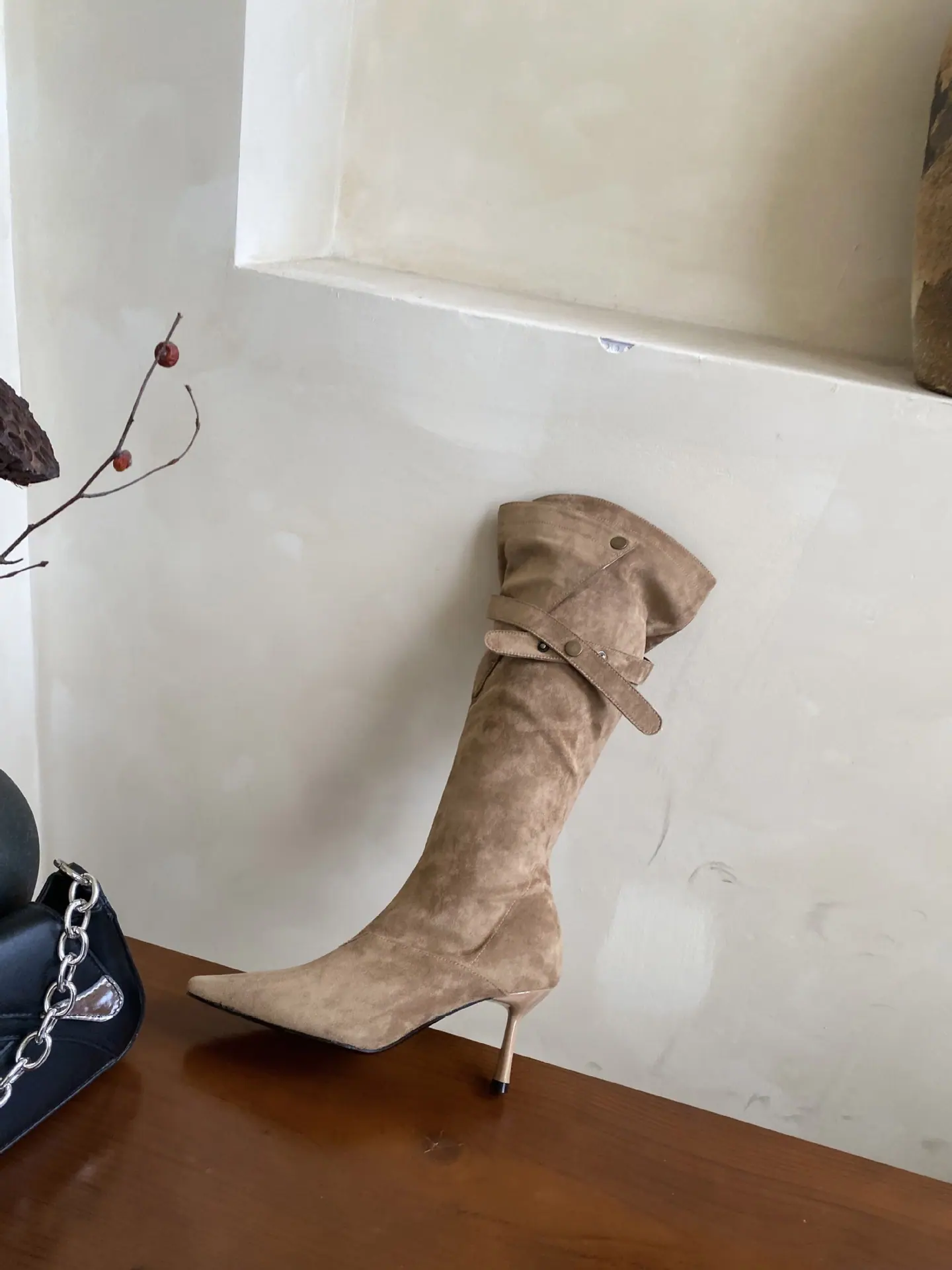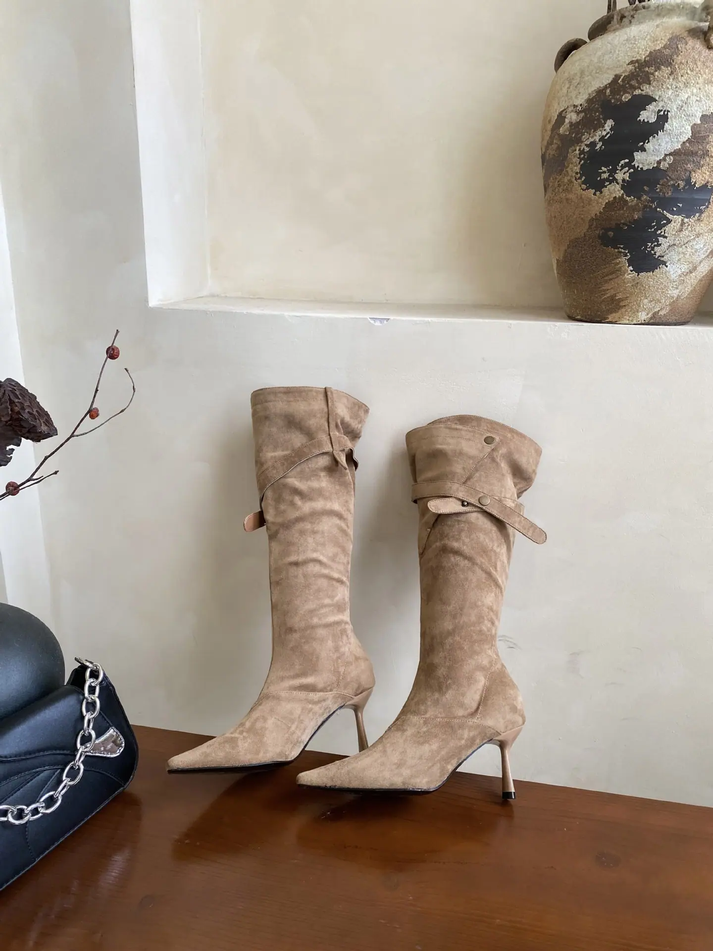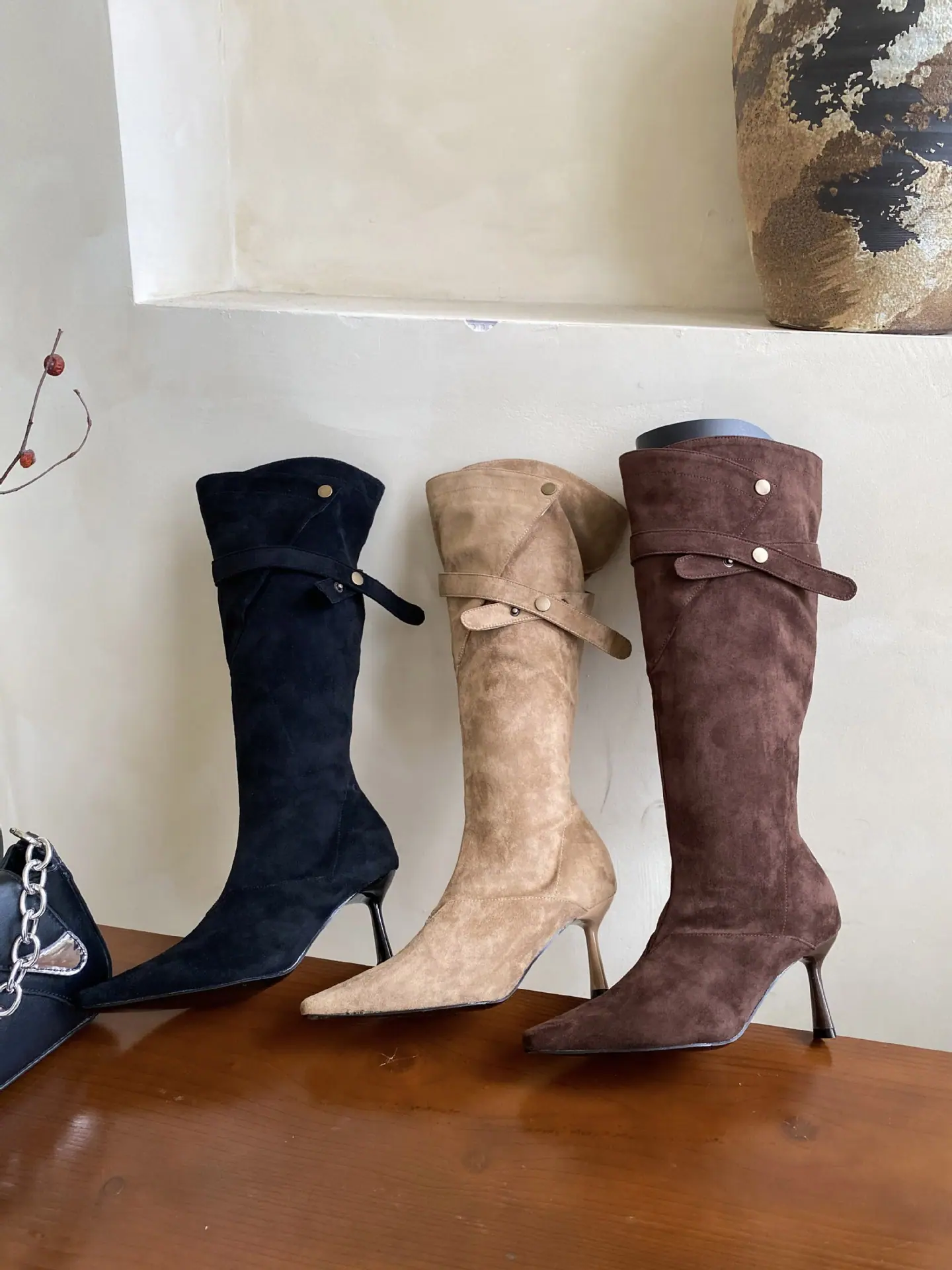 Otoño/Invierno 2025 Nuevo Europeo y Americano Hebilla de Cinturón de Gamuza Punta Afilada Tacón de Aguja Tacón Alto Temperamento Moda Francesa Sexy Botas Largas de Mujer