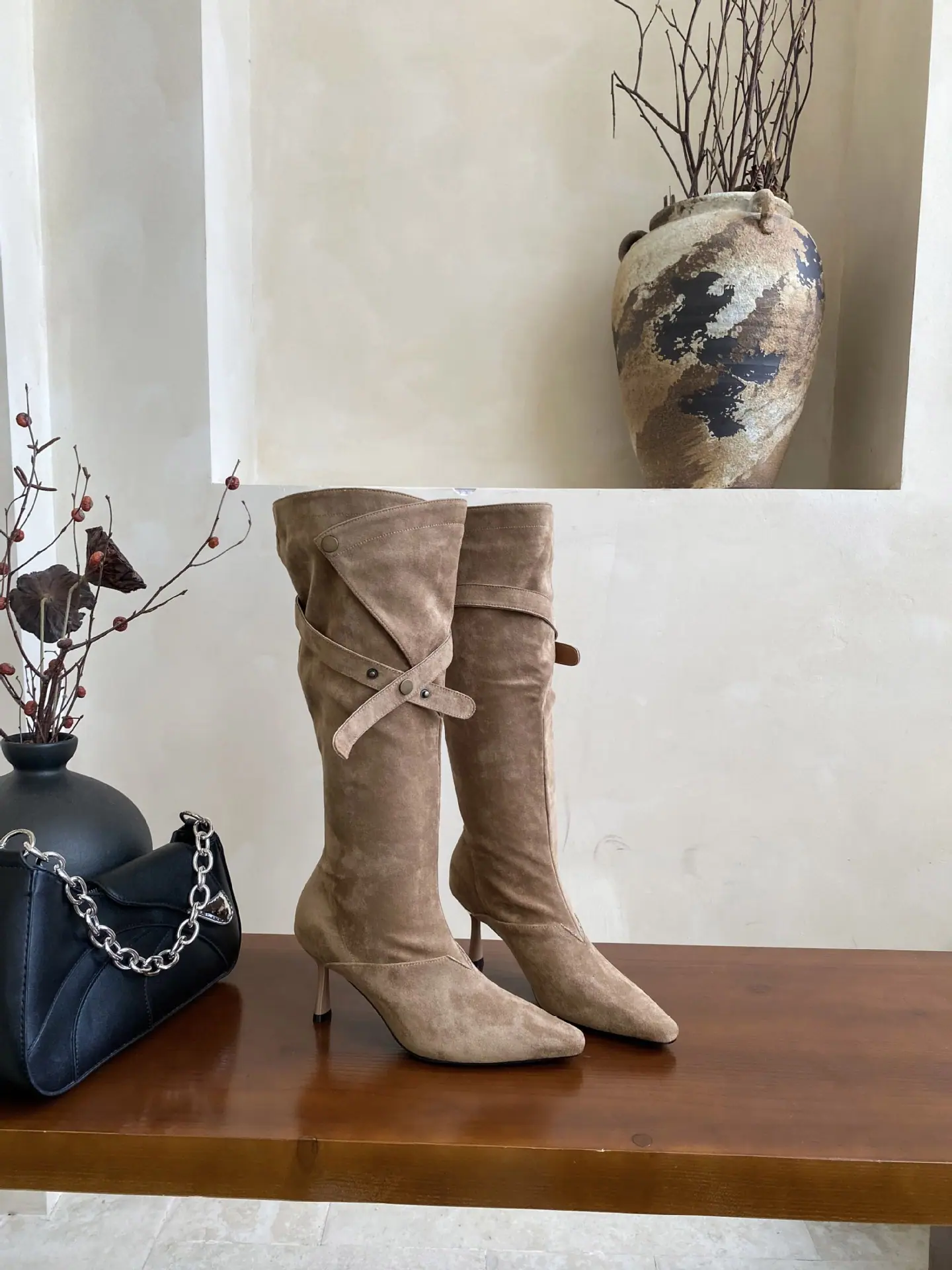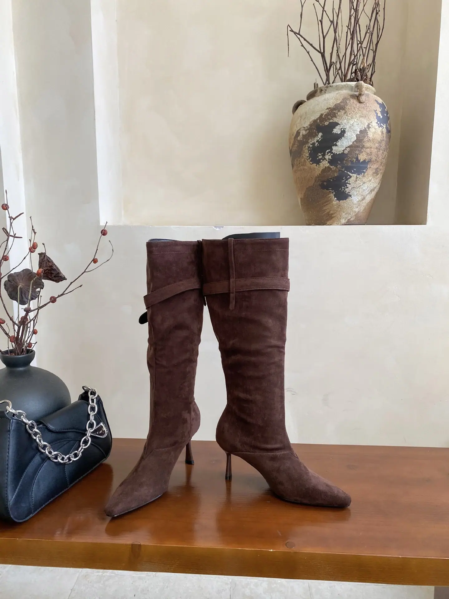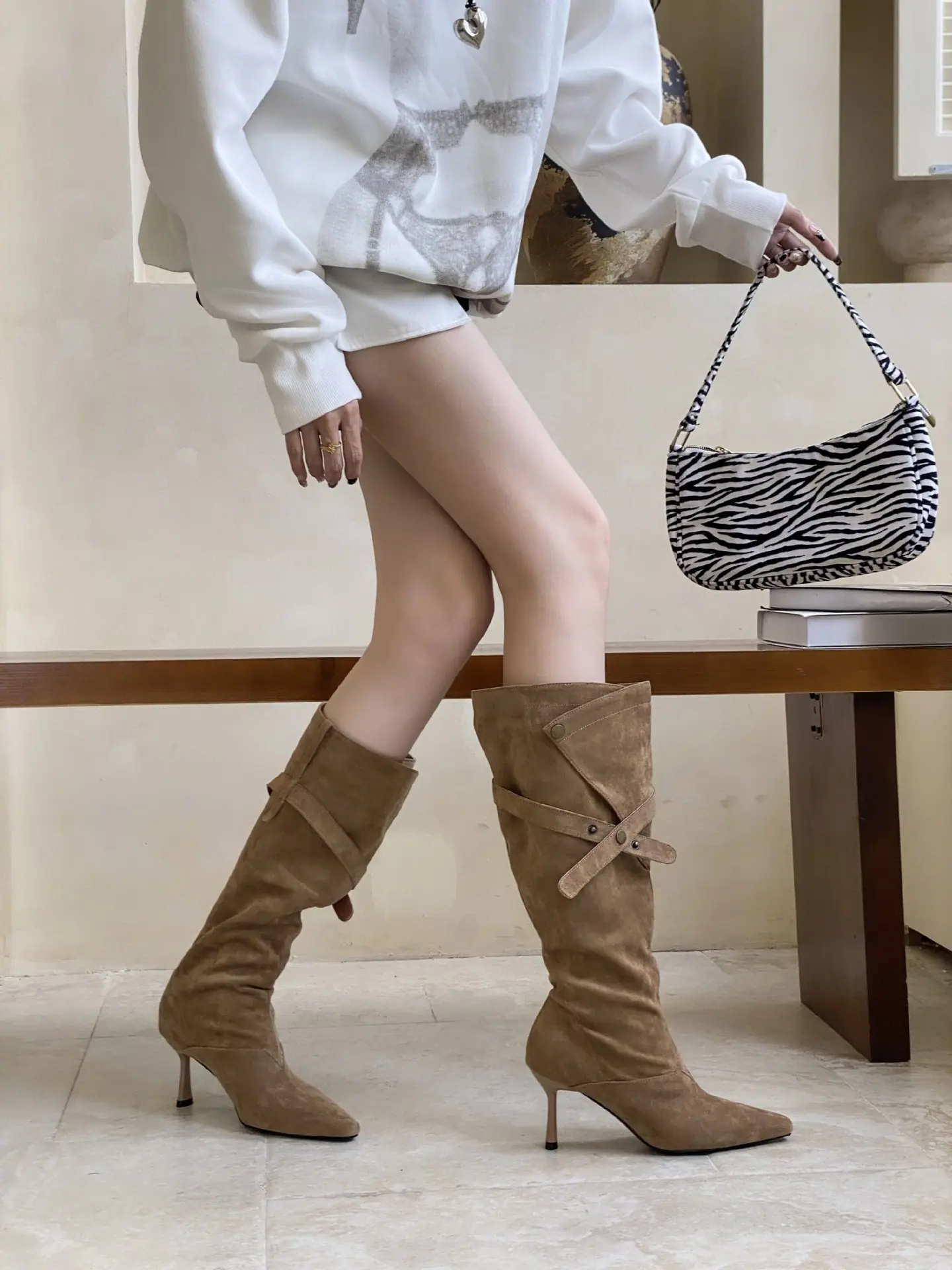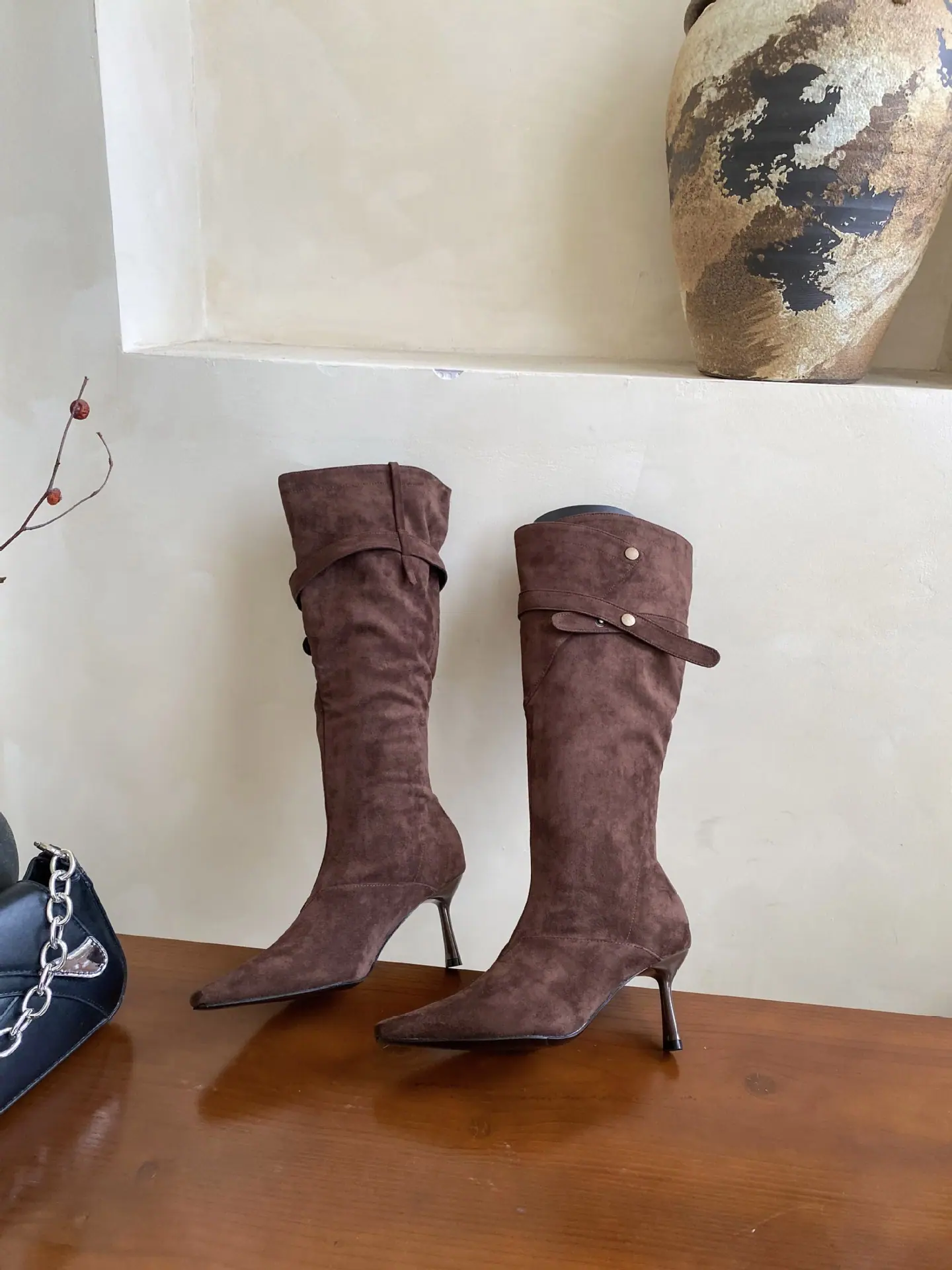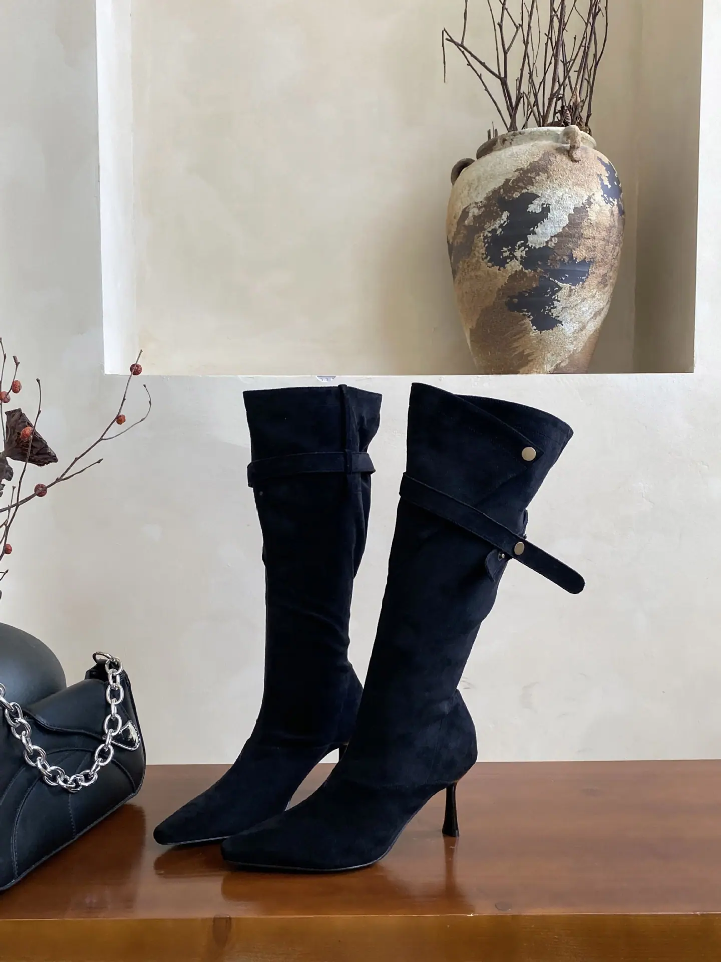 Otoño/Invierno 2025 Nuevo Europeo y Americano Hebilla de Cinturón de Gamuza Punta Afilada Tacón de Aguja Tacón Alto Temperamento Moda Francesa Sexy Botas Largas de Mujer
