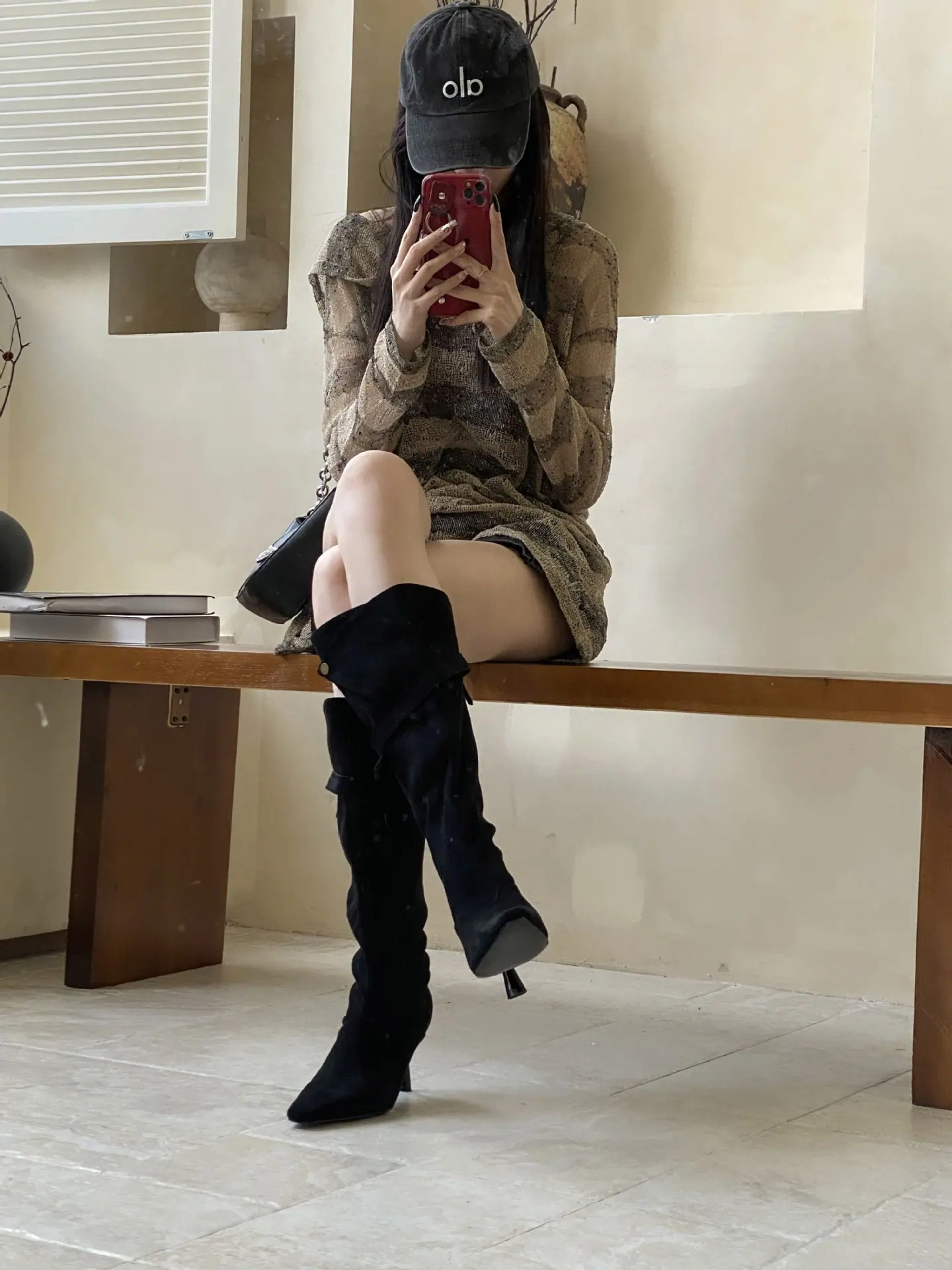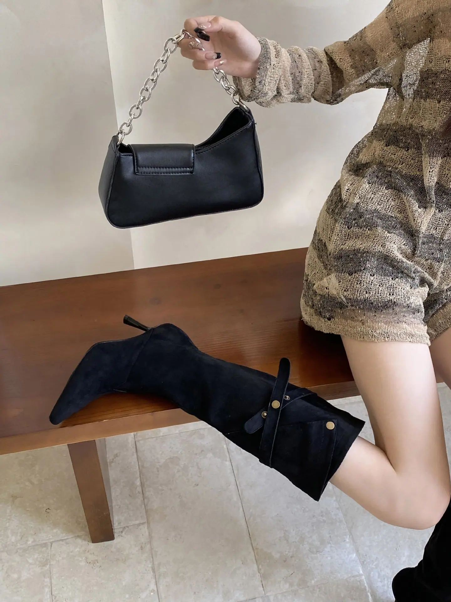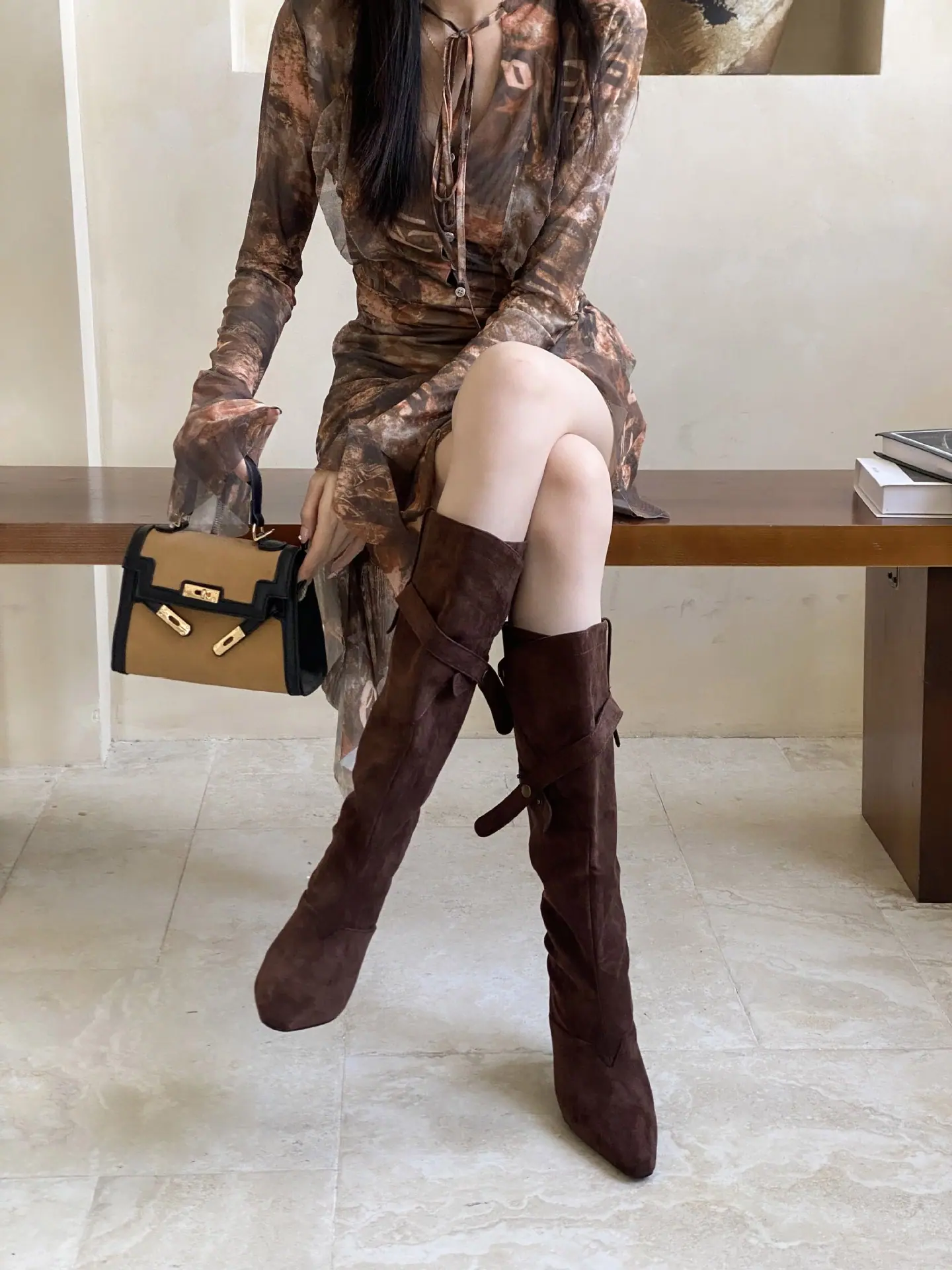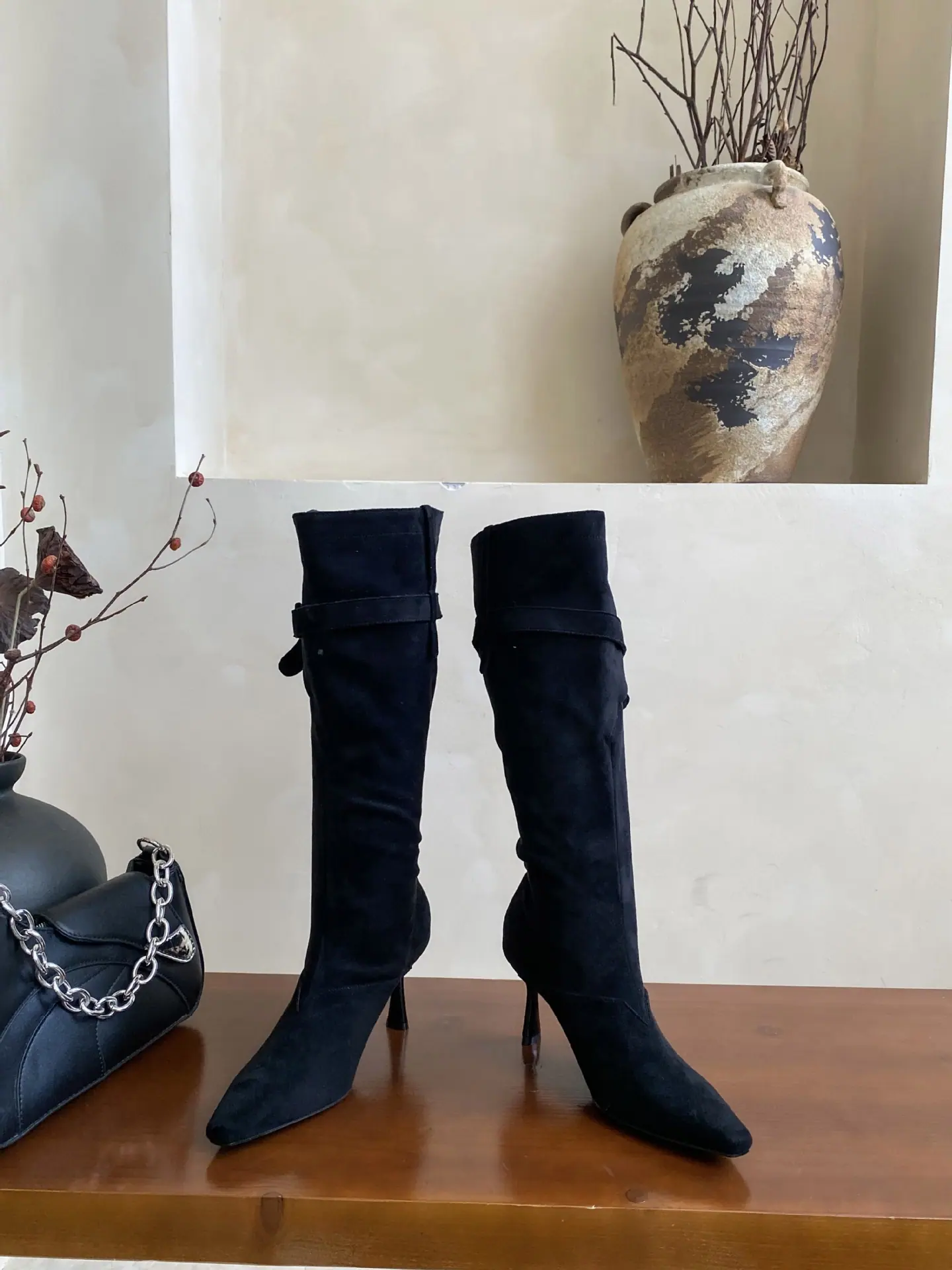 Otoño/Invierno 2025 Nuevo Europeo y Americano Hebilla de Cinturón de Gamuza Punta Afilada Tacón de Aguja Tacón Alto Temperamento Moda Francesa Sexy Botas Largas de Mujer