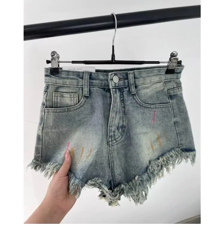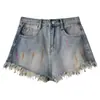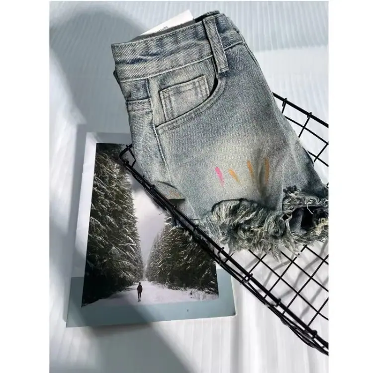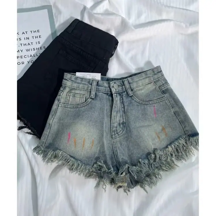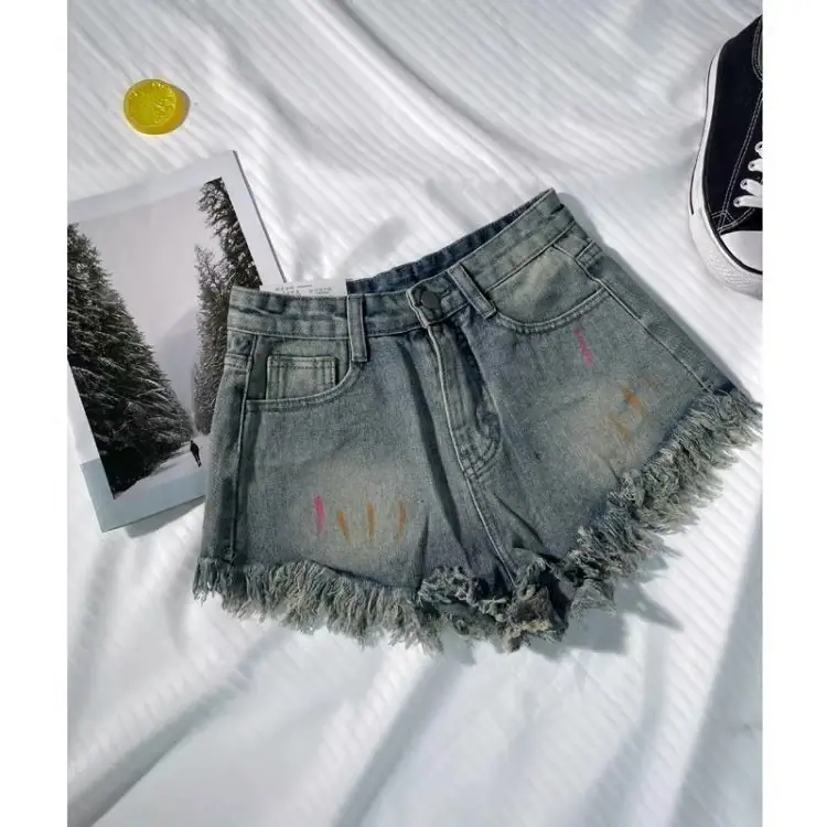 Shorts de mezclilla raídos de chica caliente para mujer, verano nuevo, cintura alta, adelgazantes, retro, lavados, viejos, línea A, pierna ancha, pantalones cortos