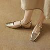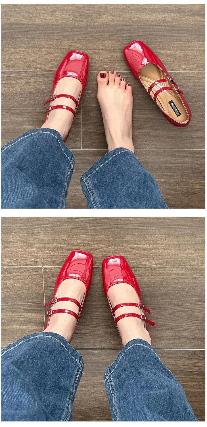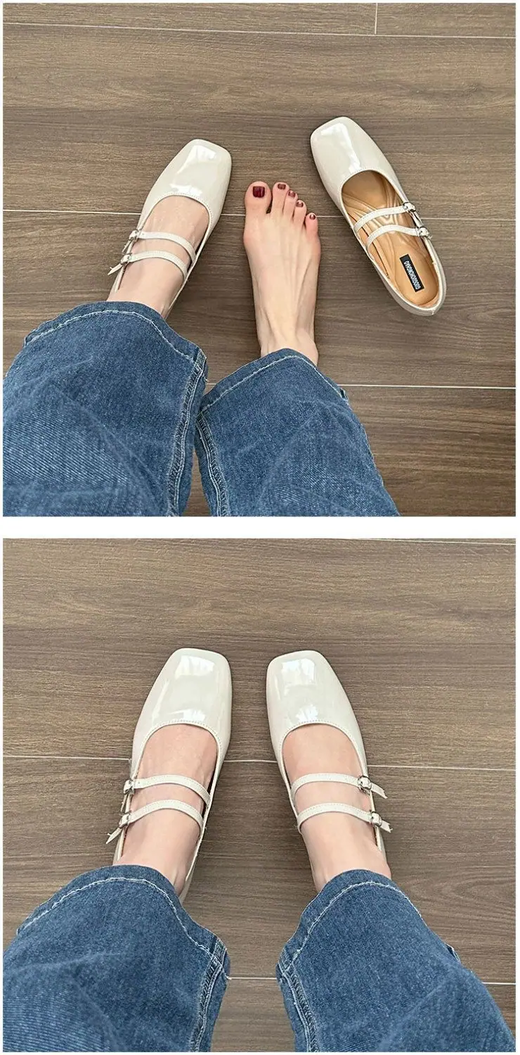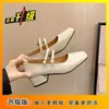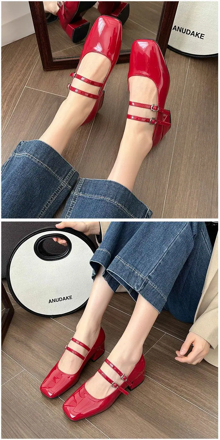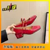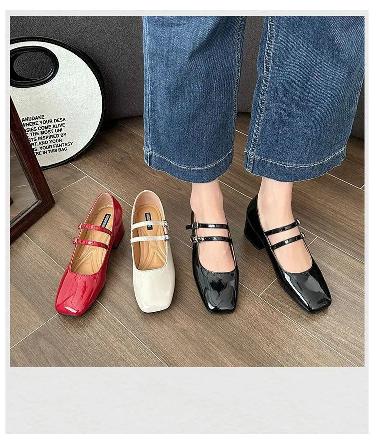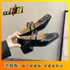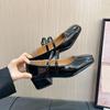 Zapatos de Mujer Mary Jane de Punta Cuadrada y Corte Bajo de Moda 2025 Primavera/Verano Nuevos Tacón Medio de Bloque Una Tira Charol Zapatos Individuales