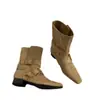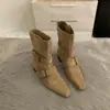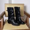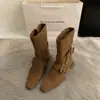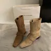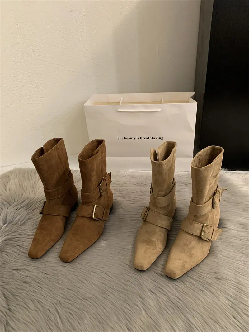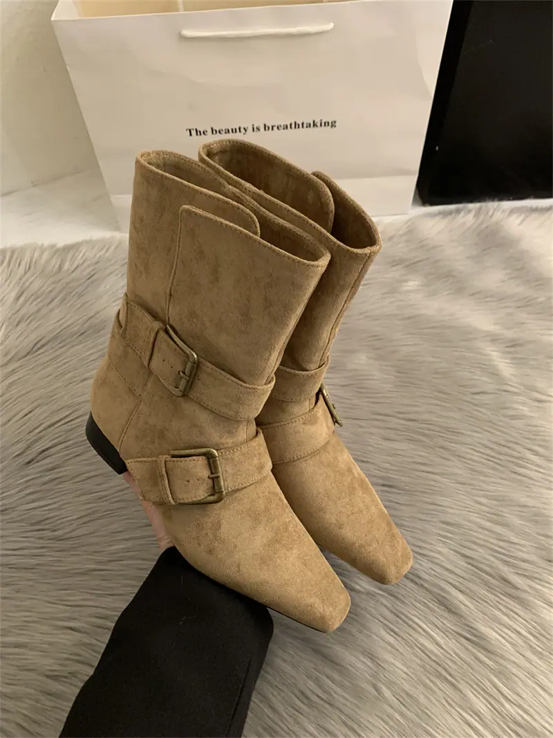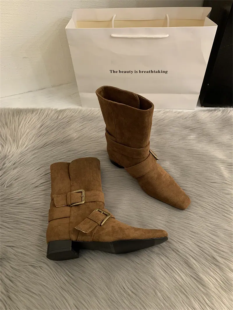 Botas Vaqueras Occidentales con Hebilla Retro para Mujer Otoño 2025 Nuevas Punta Cuadrada Tacón Grueso Ante Adelgazantes Temperamento Media Caña