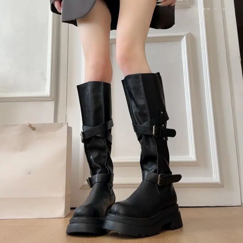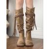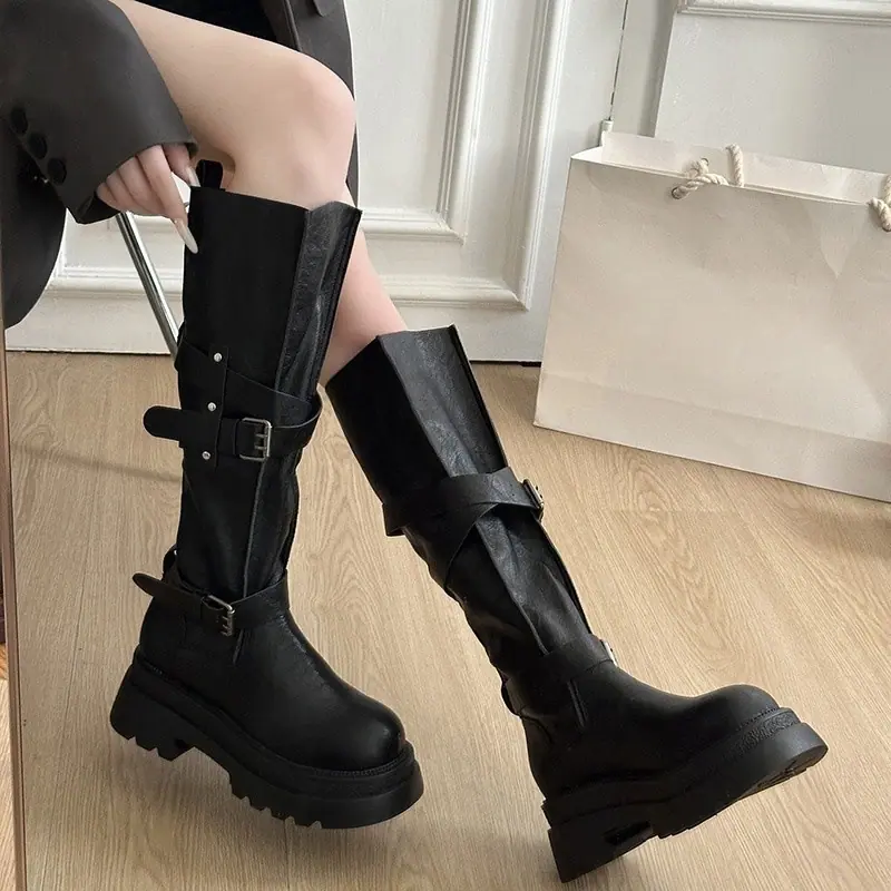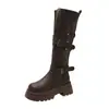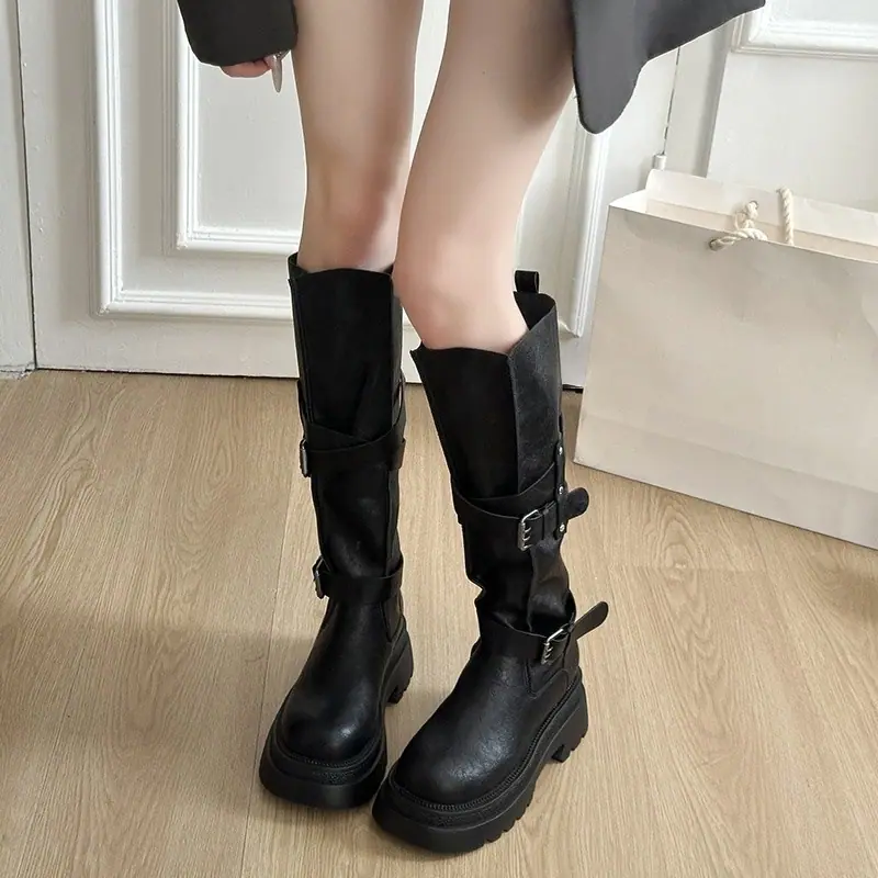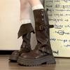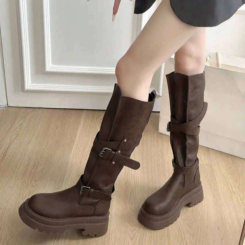 Botas altas marrones de vaquero occidental con suela gruesa para mujer, botas largas para aumentar la altura, botas altas, otoño e invierno 2025, nuevas botas de caballero