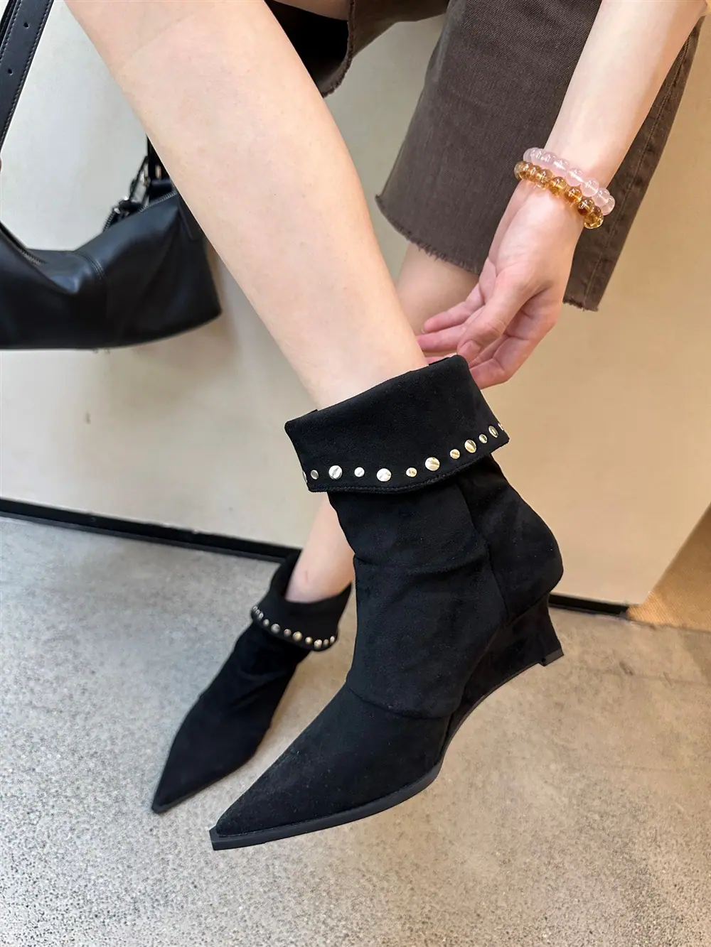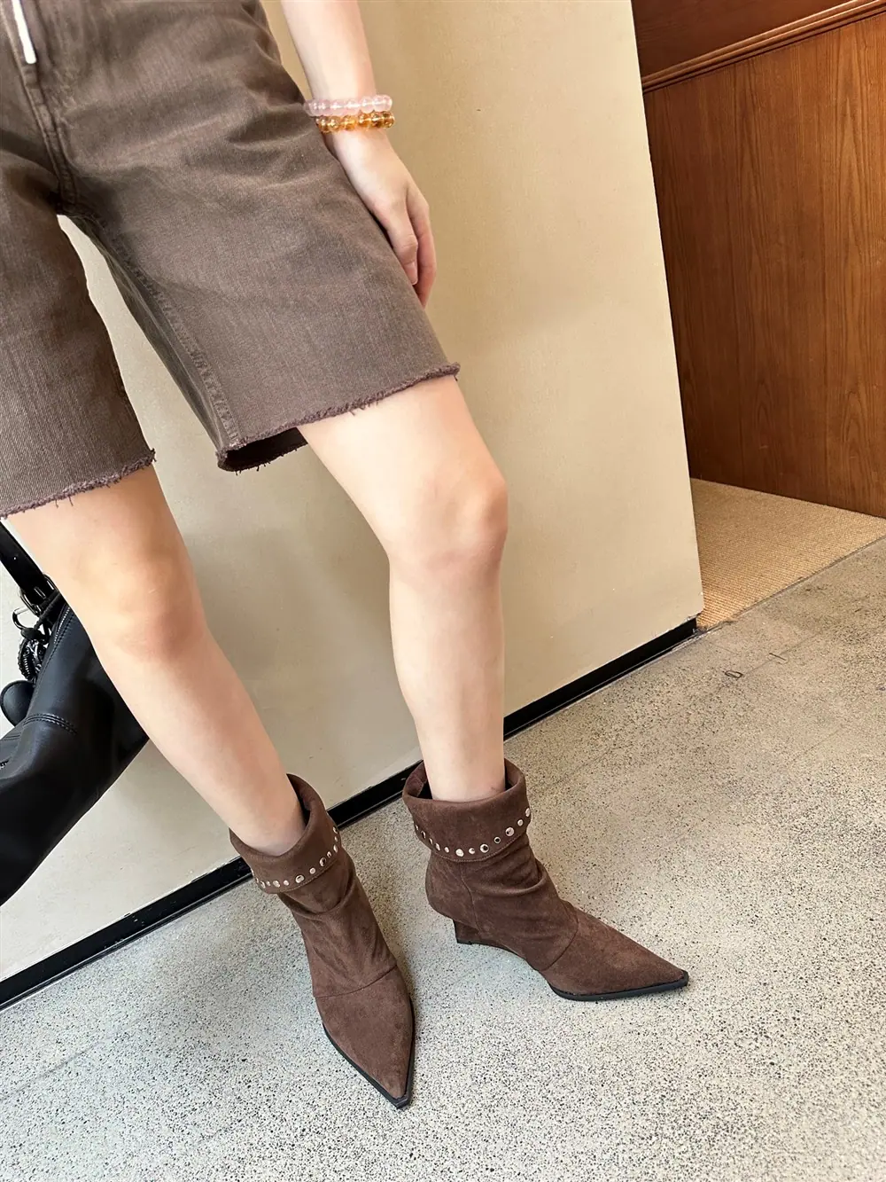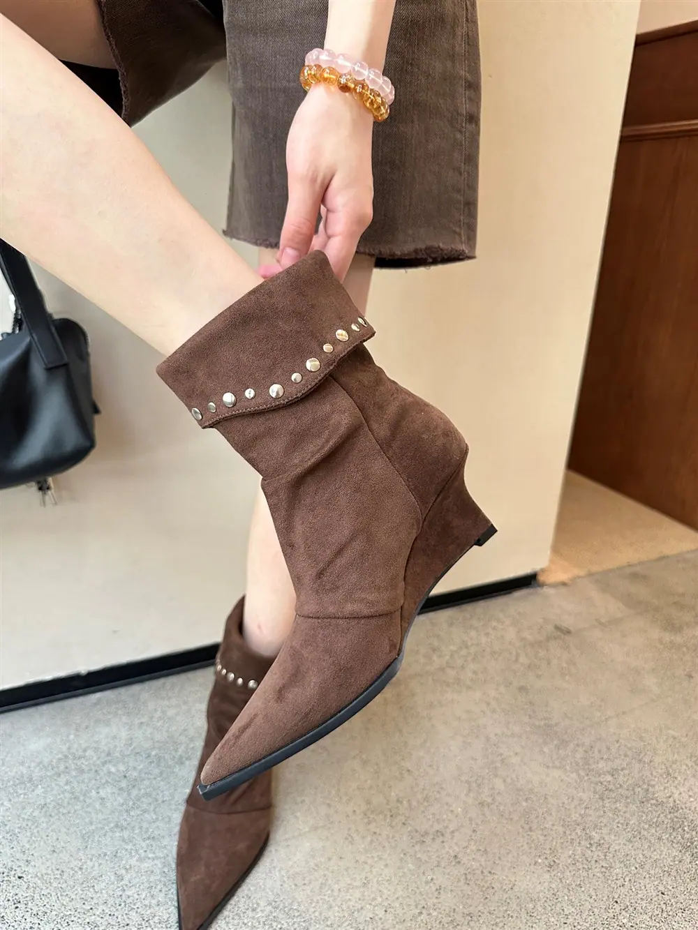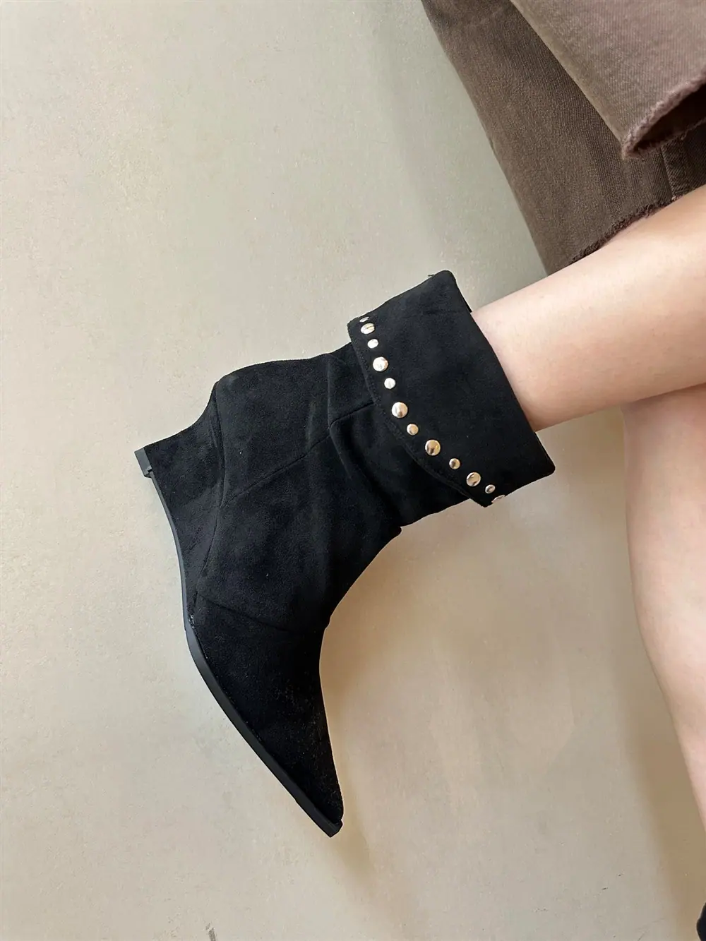 Botines de moda de gamuza de tacón grueso con punta francesa para mujer 2025 primavera y otoño nuevos botines occidentales retro con remaches