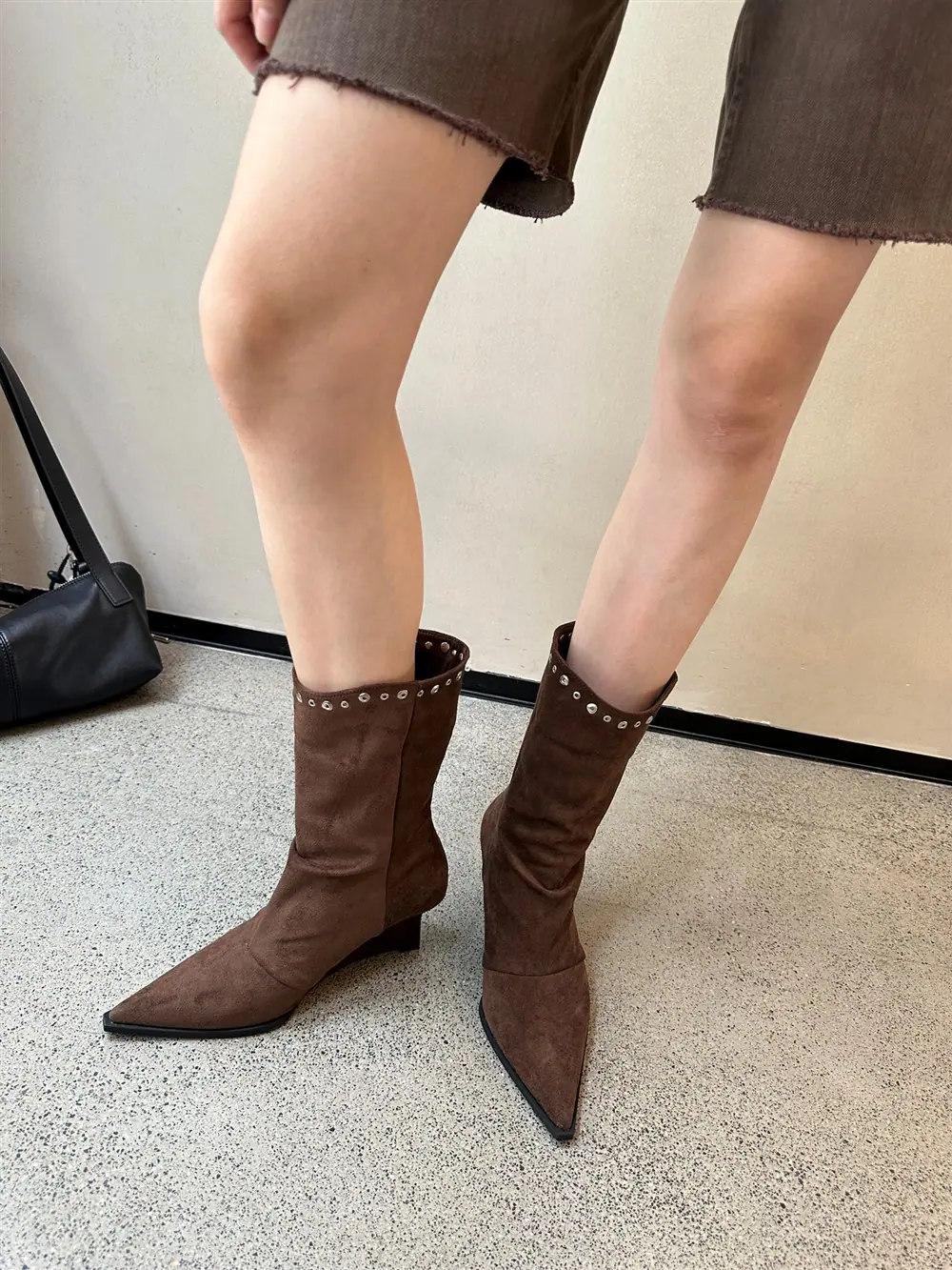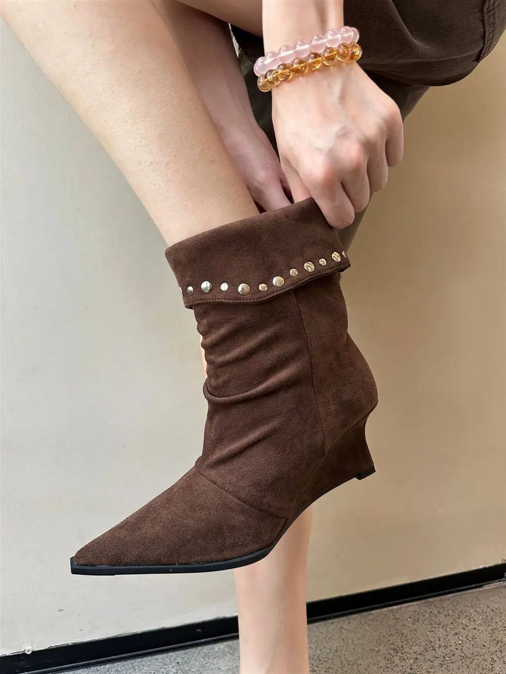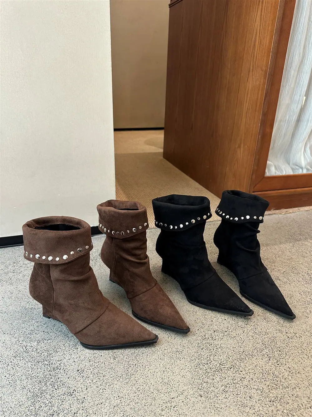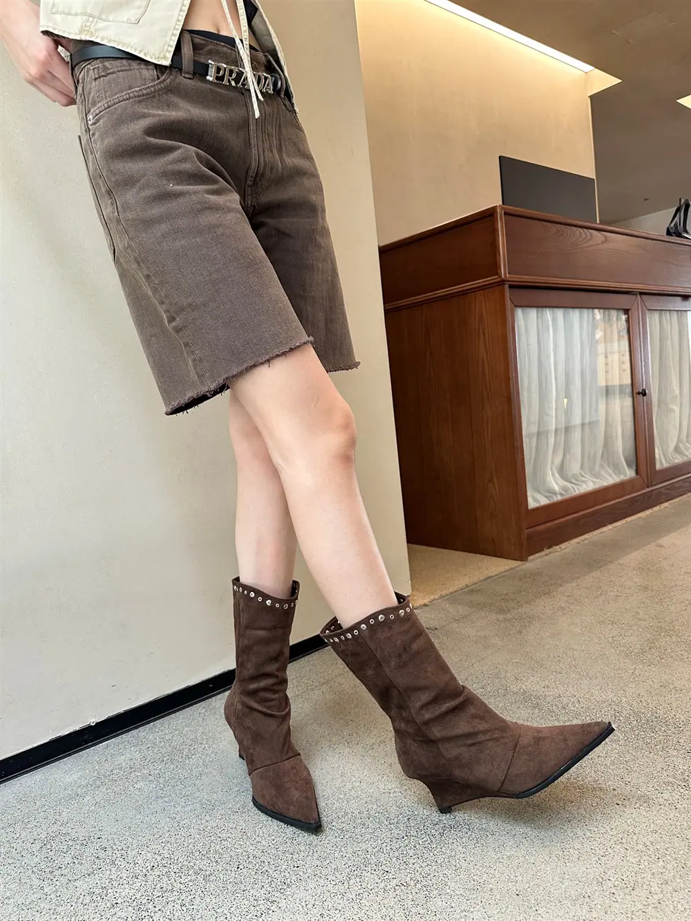 Botines de moda de gamuza de tacón grueso con punta francesa para mujer 2025 primavera y otoño nuevos botines occidentales retro con remaches
