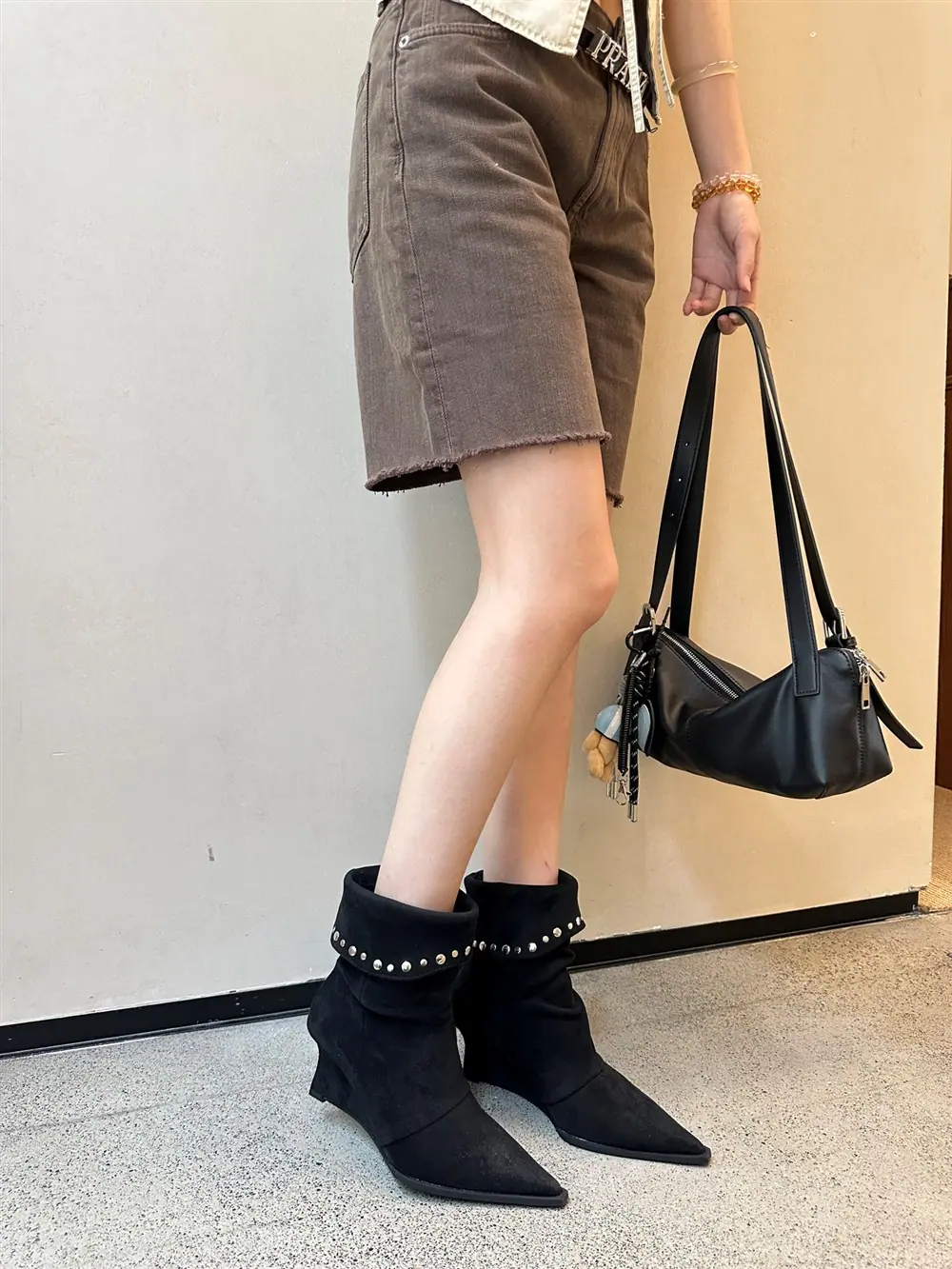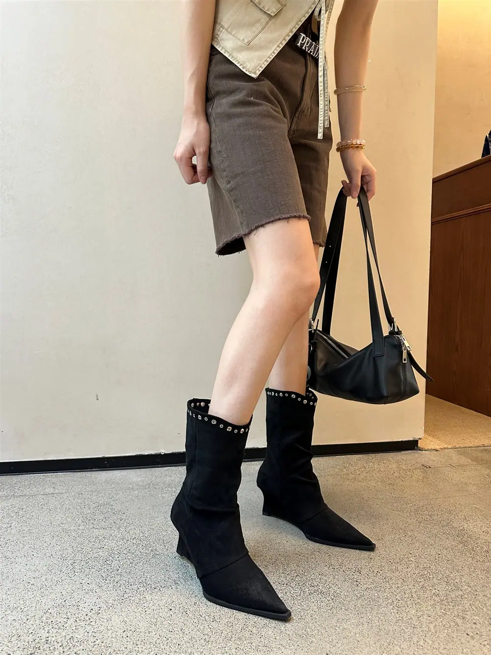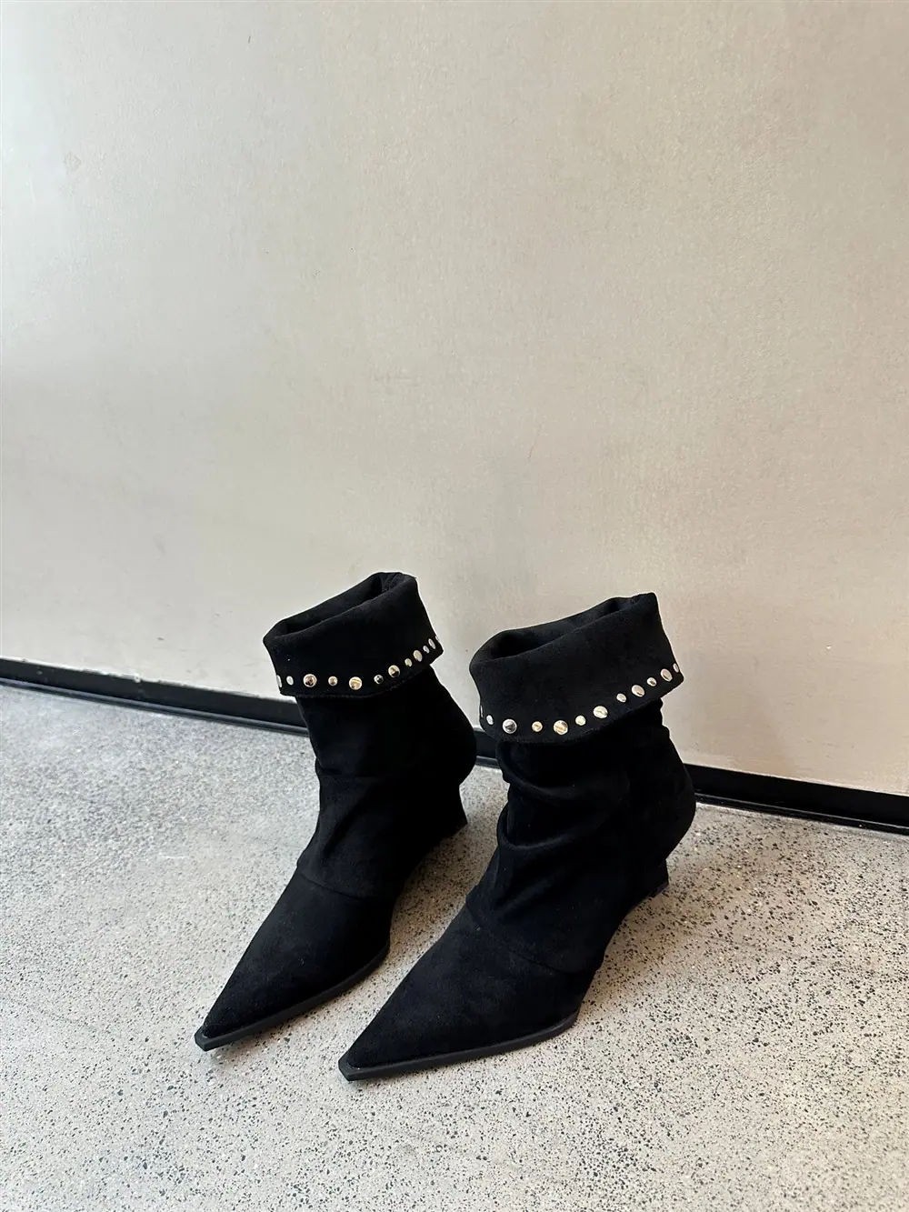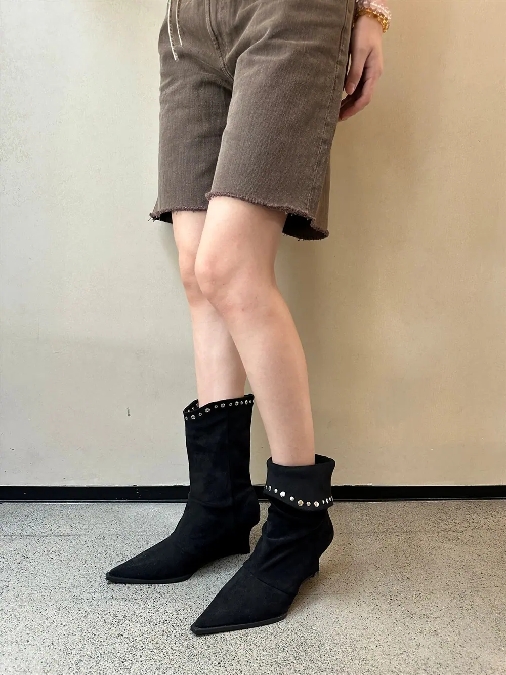 Botines de moda de gamuza de tacón grueso con punta francesa para mujer 2025 primavera y otoño nuevos botines occidentales retro con remaches