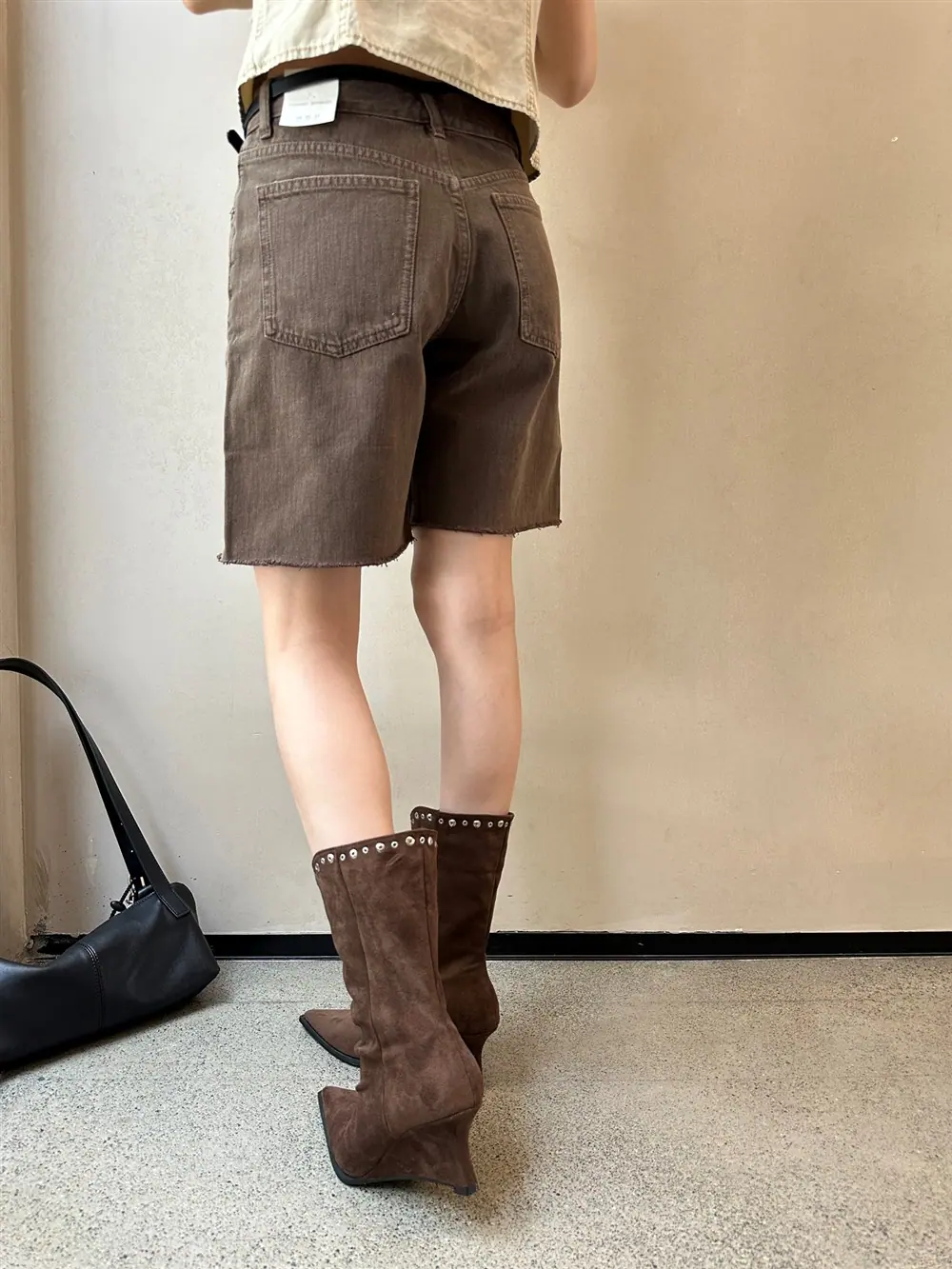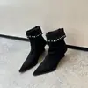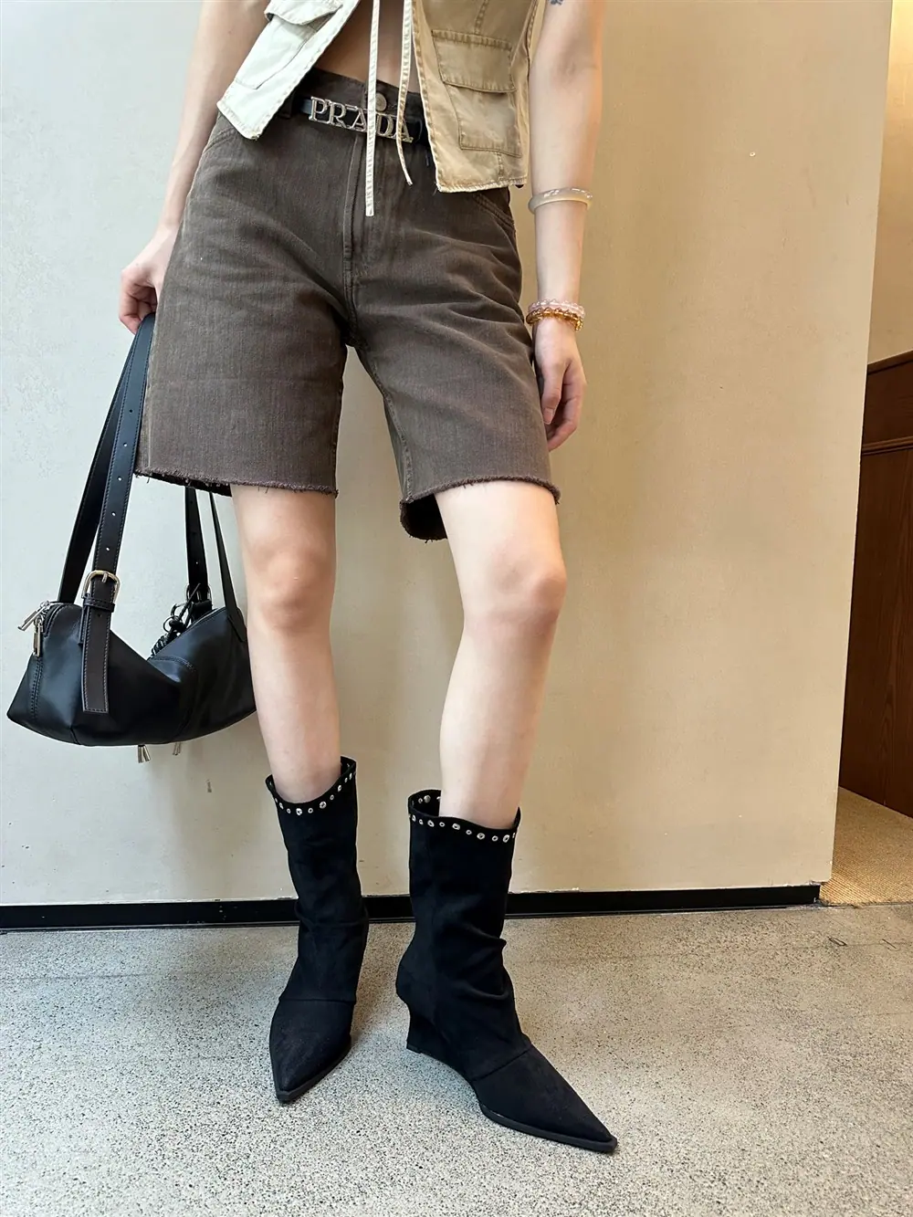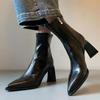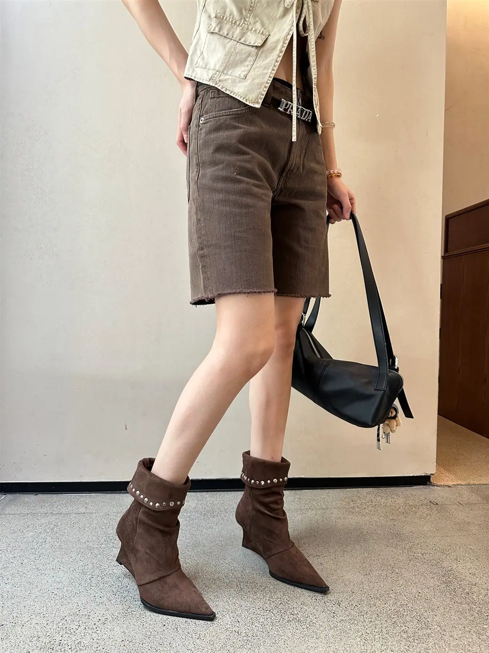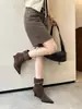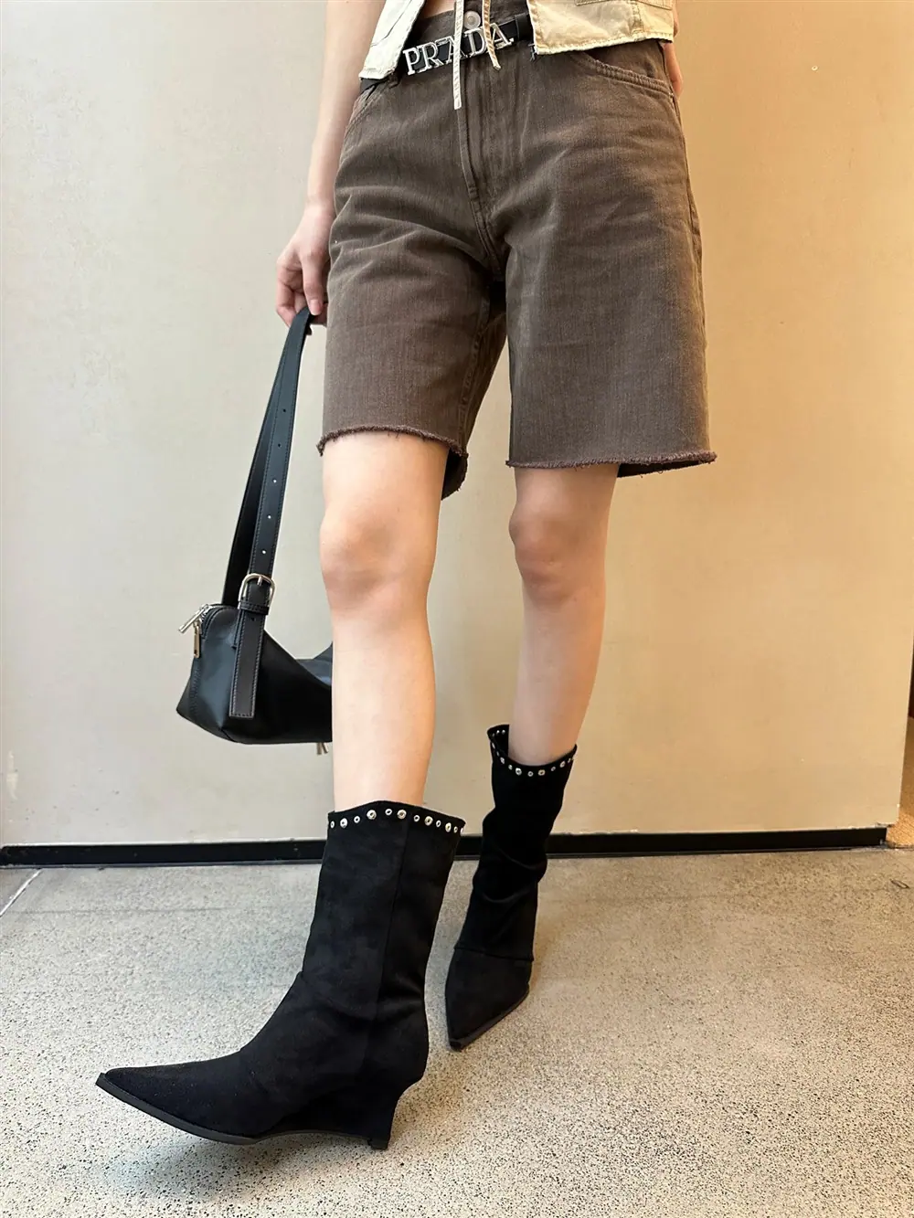 Botines de moda de gamuza de tacón grueso con punta francesa para mujer 2025 primavera y otoño nuevos botines occidentales retro con remaches