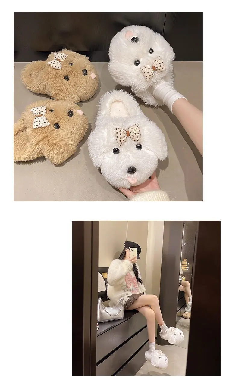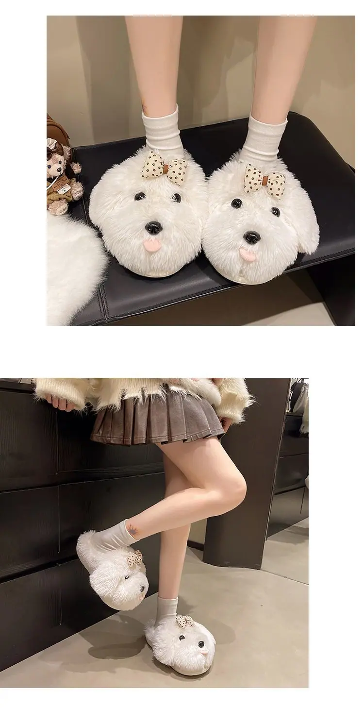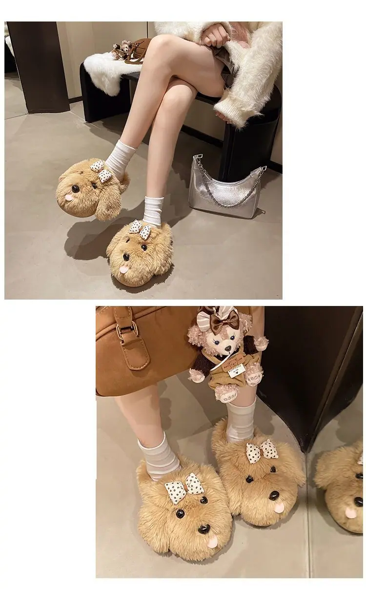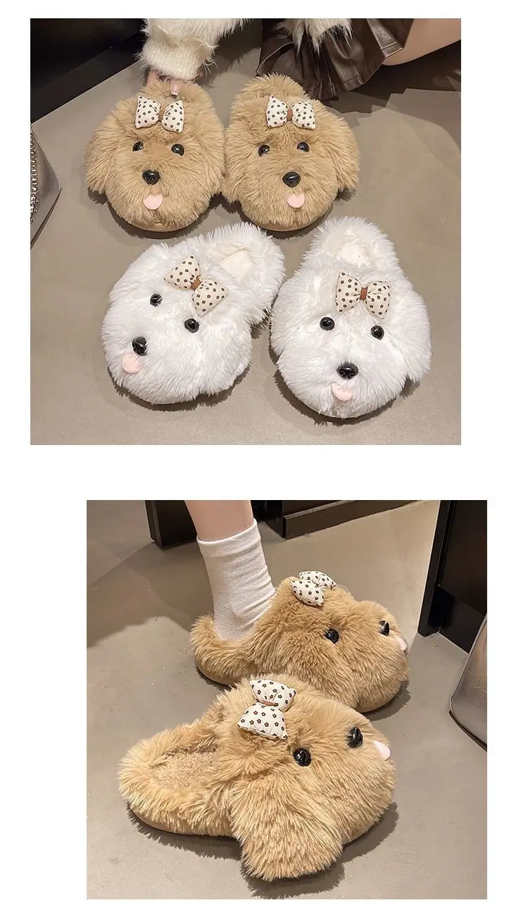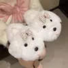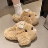 Pantuflas de Casa Bao Tou 2025 Otoño/Invierno Nuevas para Exterior Lindas Femeninas de Dibujos Animados Cachorro Pantuflas Peludas para Mujer