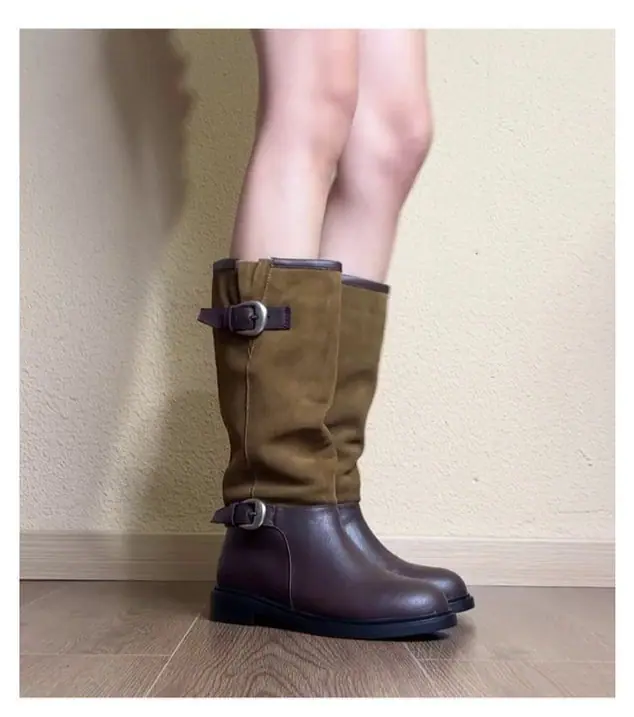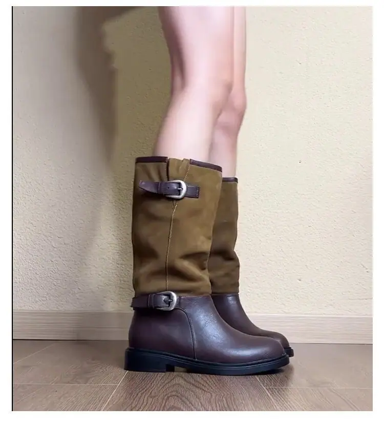Botas Vaqueras Retro Nuevas 2025 para Mujer Estilo Británico Hebilla Pantorrilla Ancha Sobre la Rodilla Tacón Grueso Adelgazantes Botas de Moda