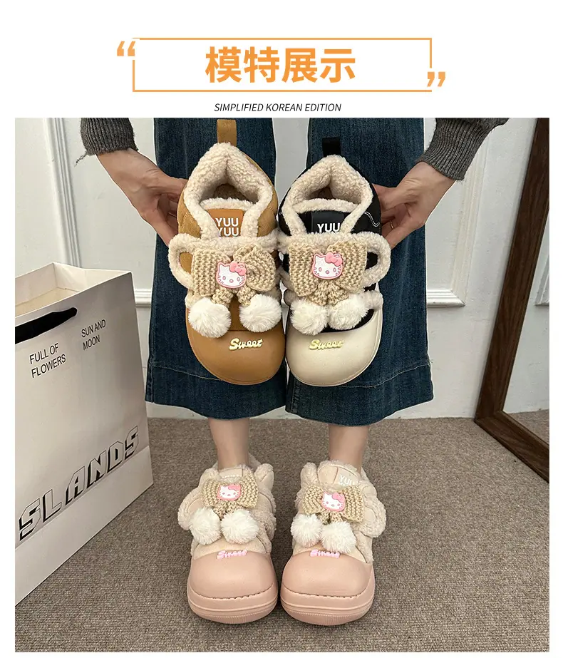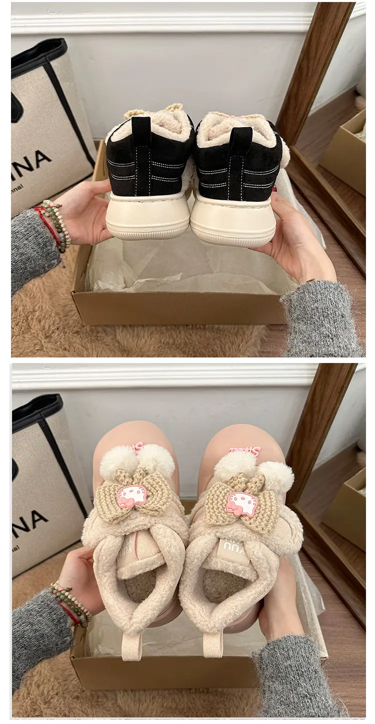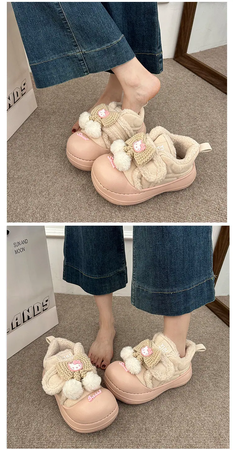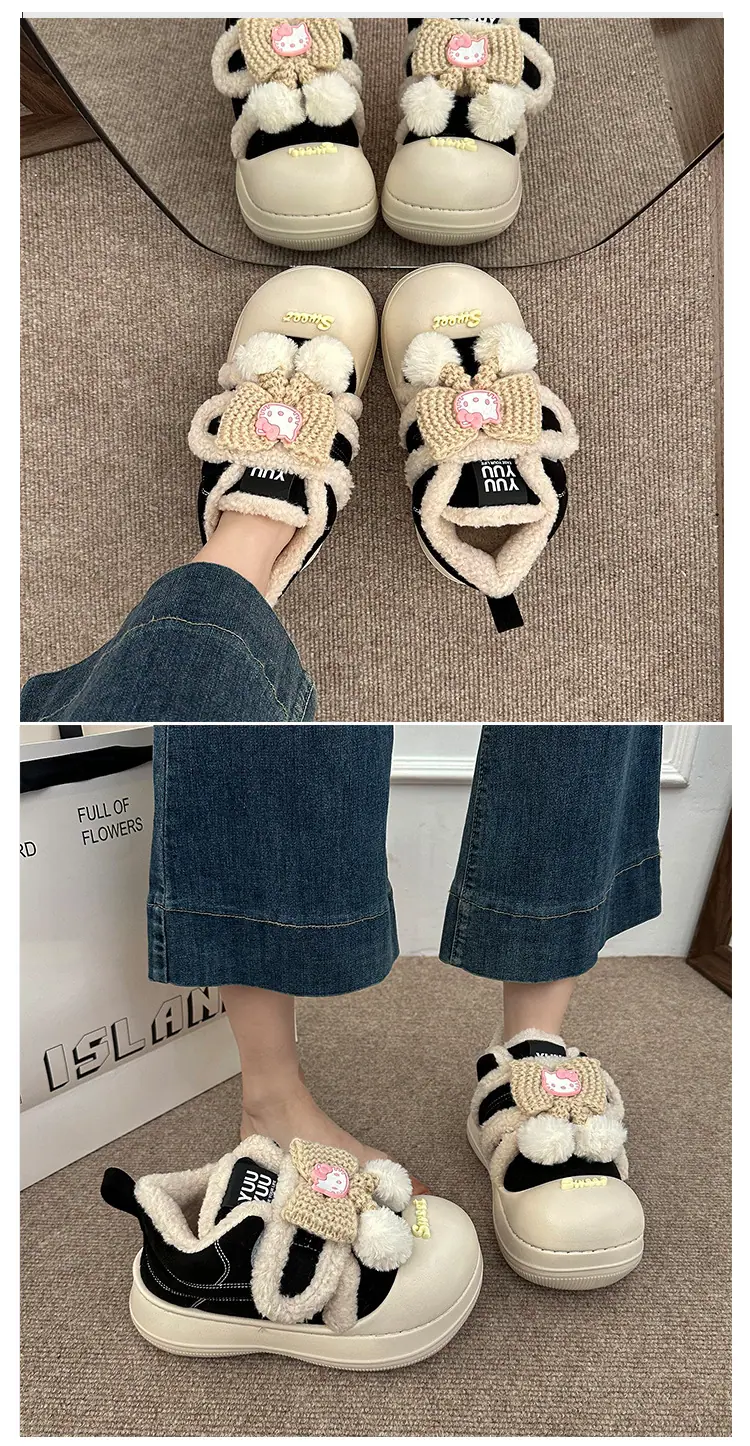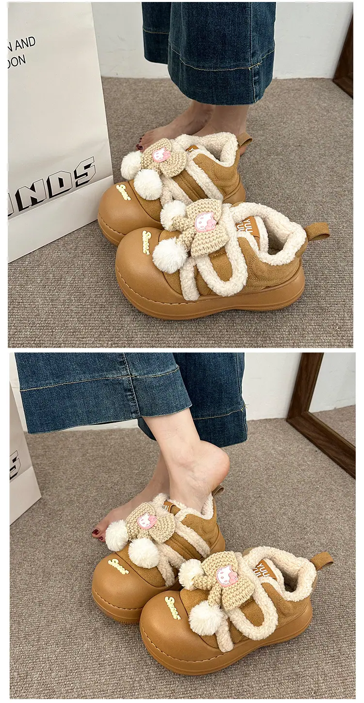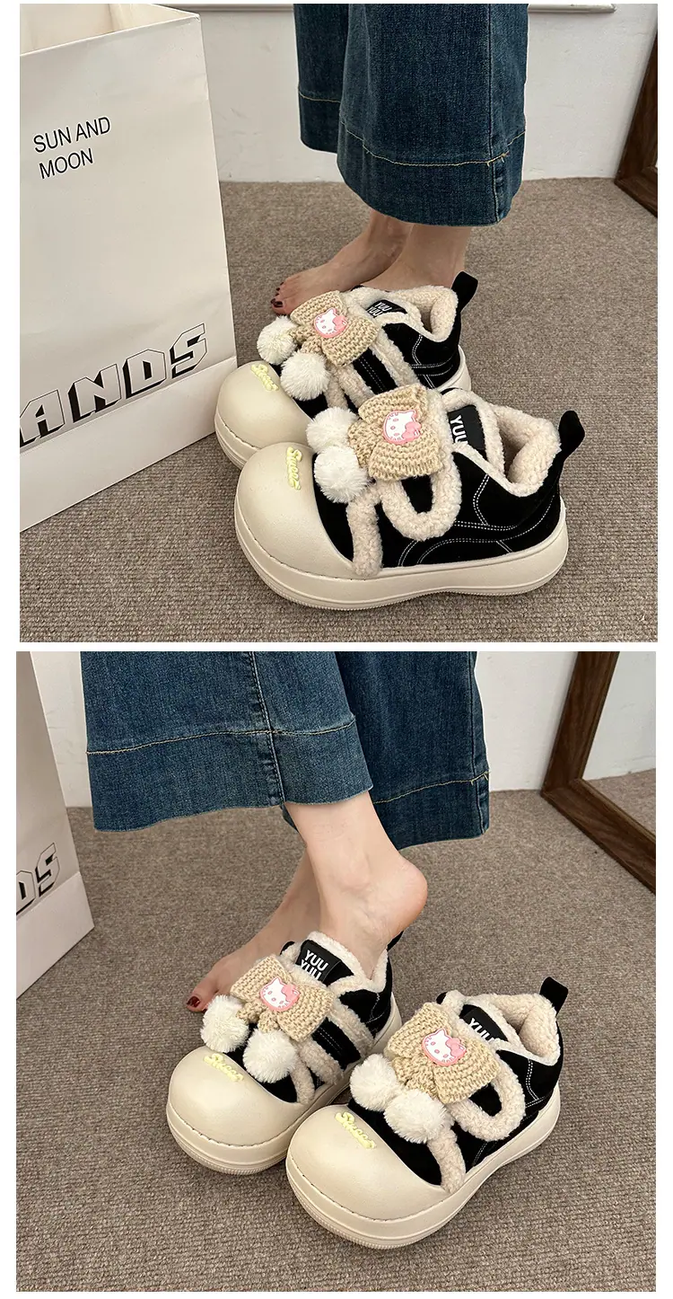 Lindas Pantuflas Difusas de Gatito de Dibujos Animados para Mujer 2025 Otoño/Invierno Nuevo Hogar Cálido para Usar Fuera Más Terciopelo con Talón Cubierto Pantuflas de Algodón