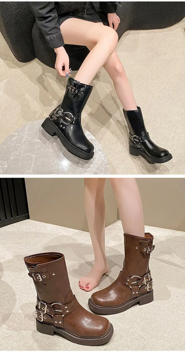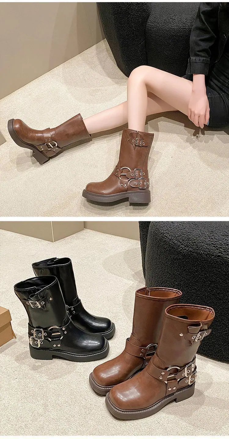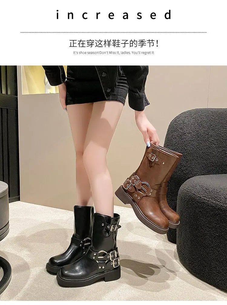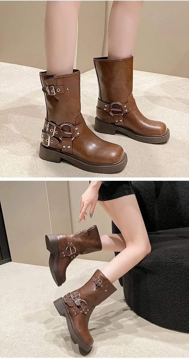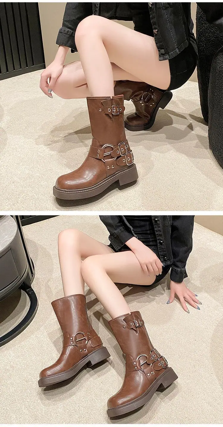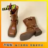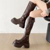 Botas de moda caballero de tacón grueso con hebilla de cinturón por encima de la rodilla verano 2025 retro botas largas botas western botas Martin marrones