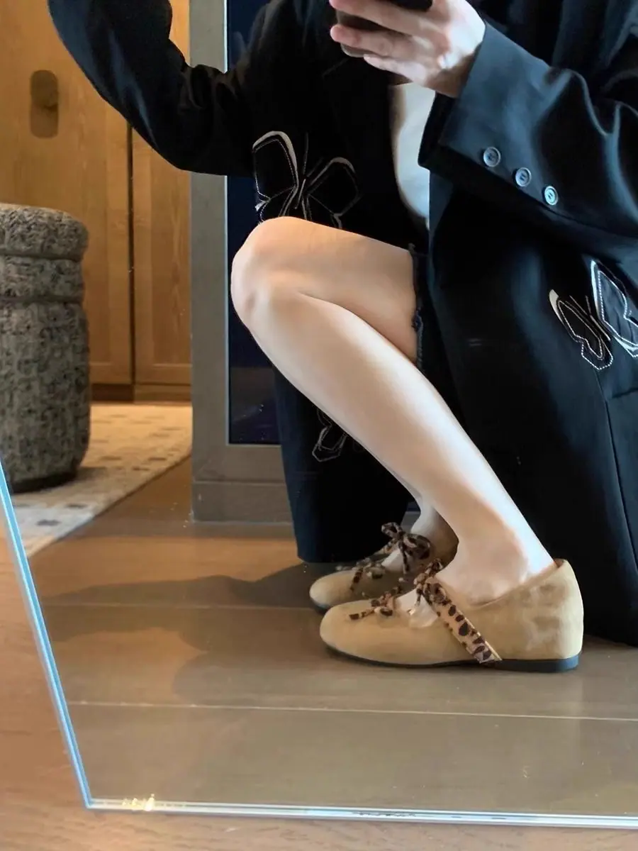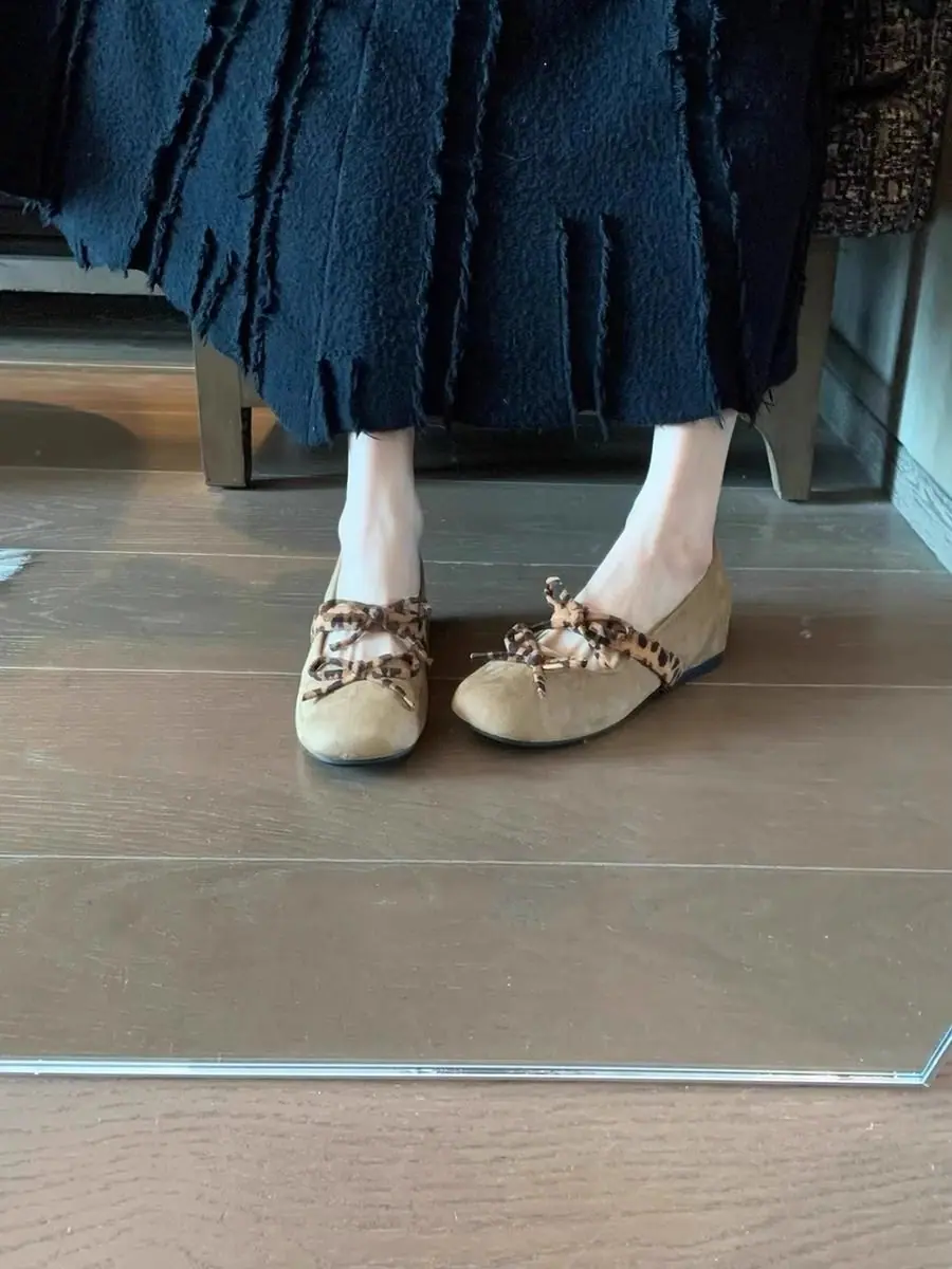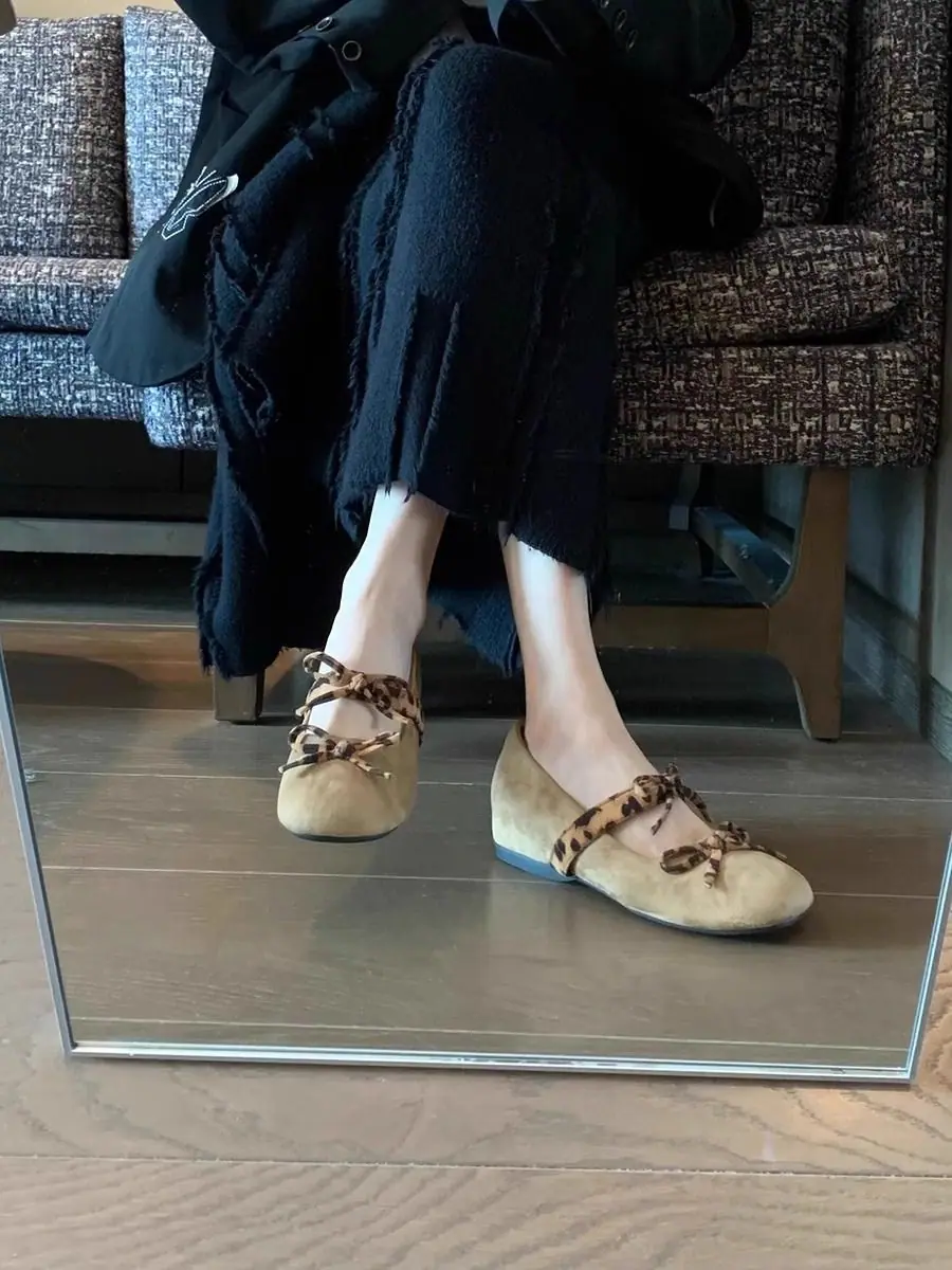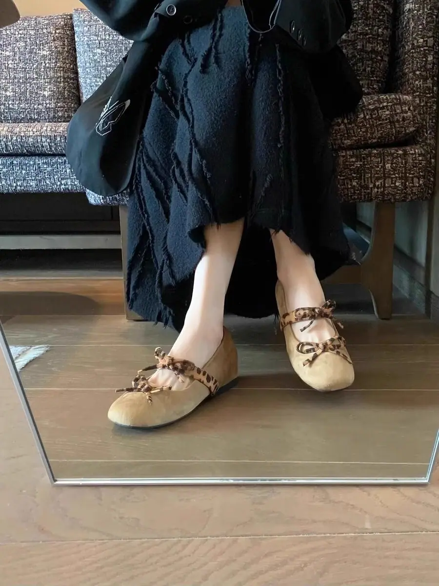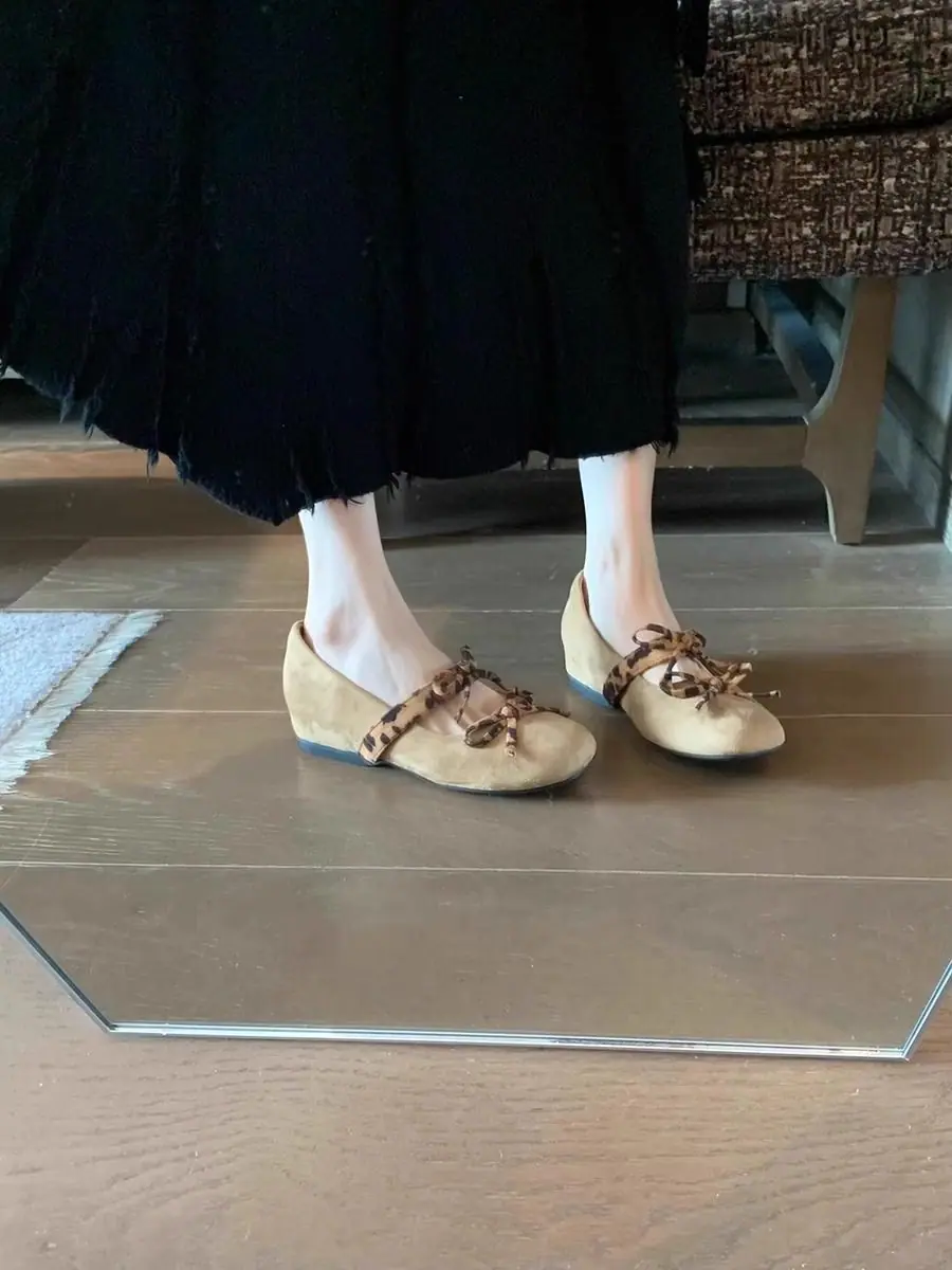 Tacón Oculto Retro Francés Estampado Leopardo Lazo Zapatos Individuales Mujer 2025 Otoño Nuevo Gamuza Estilo Hada Abuelita Mary Janes