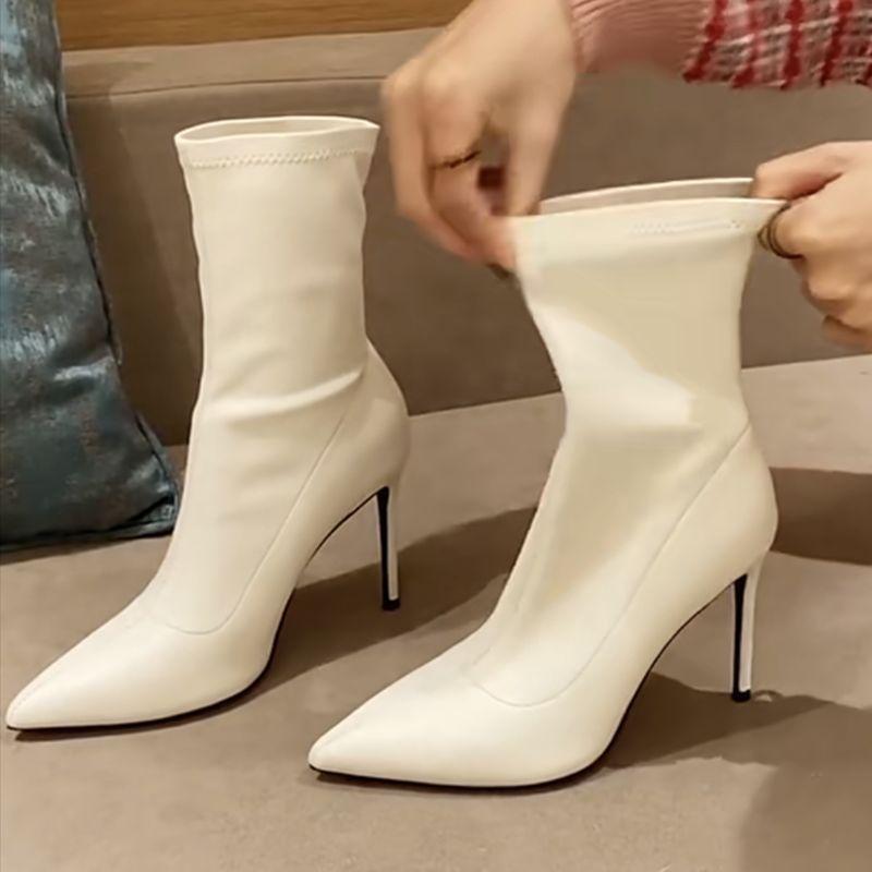 Compra Botines Cortos de Otoño e Invierno 2025 para Mujer con Tacones Altos, Elásticos Franceses Negros de Punta con Tacones de Aguja, Botas Ajustadas, Botas Blancas de Gamuza, Elegantes al por mayor en Joom.pro